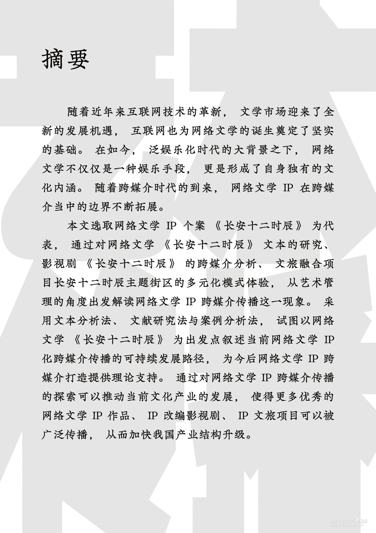 本文选取网络文学IP个案《长安十二时辰》为代表,通过对网络文学《长安十二时辰》文本的研究、影视剧《长安十二时辰》的跨媒介分析、文旅融合项目长安十二时辰主题街区的多元化模式体验,从艺术管理的角度出发解读网络文学IP跨媒介传播这一现象。采用文本分析法、文