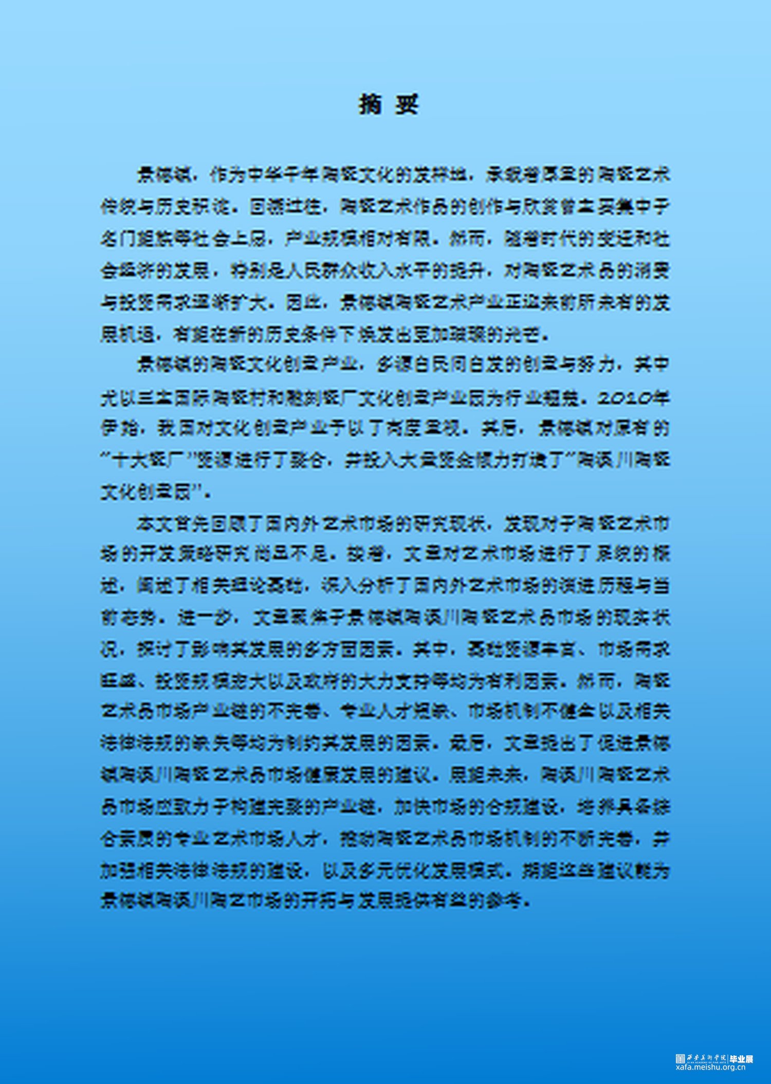 近30年来,中国的艺术品市场已经由传统向近代的转型。在转型的过程中,中国的艺术品市场也发生了巨大的变革,带动了艺术品市场的迅速发展,但是,由于市场竞争的无序,假冒伪劣的现象也在不断地滋生,这对艺术品市场的发展造成了很大的阻碍。因此,必须加大对时尚艺术品的监管力度,加大对时尚艺术品的保护力度,才能使时尚艺术品市场得到更大的发展。本文通过对景德镇陶溪川陶艺市场状况的分析,探索其市场开拓途径,认识景德镇陶溪川陶艺的市场与艺术价值,从而激发收藏者对景德镇陶艺的浓厚兴趣,发掘出新的收藏者,并将更多的资金投入到陶艺艺术品中,推动陶艺艺术产业的繁荣,从而提升景德镇陶溪川陶艺的文化品位,并以此为依据,整理出陶瓷艺术品市场的运行机制,为景德镇陶溪川陶艺市场的发展提供理论依据。