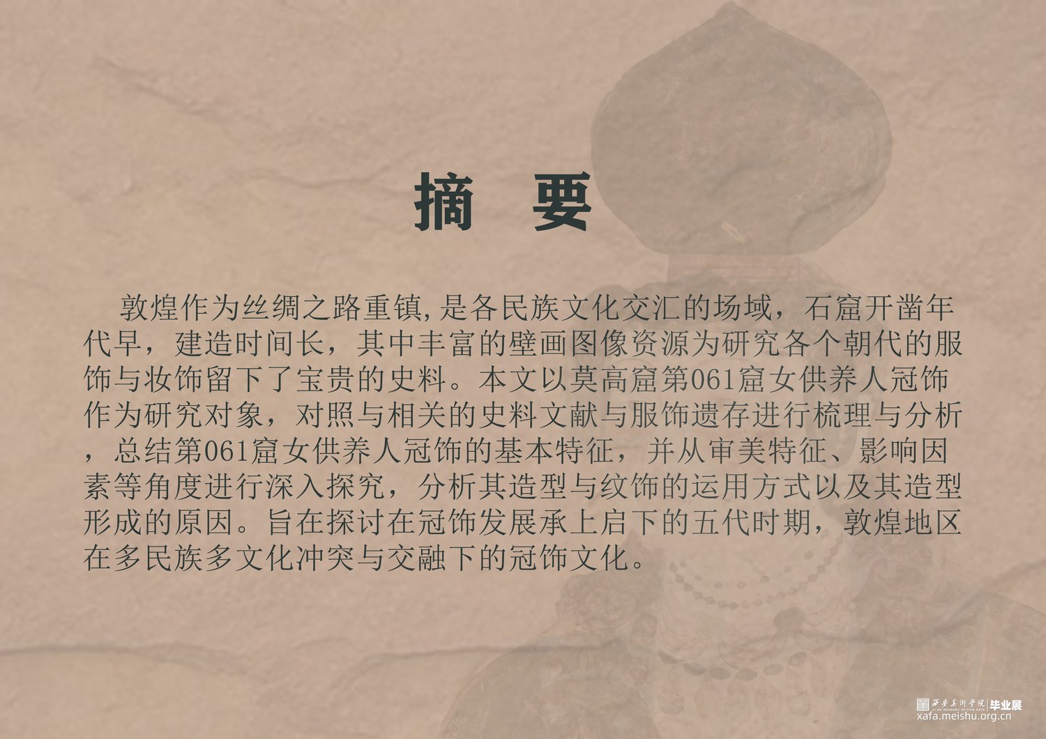 本文通过对敦煌莫高窟第061窟女供养人冠饰的研究,结合文献史料的记载与考古发现,对第061窟的冠饰进行了较为系统的分类并对其进行研究,对第061窟供养人冠饰有了深刻的理解。