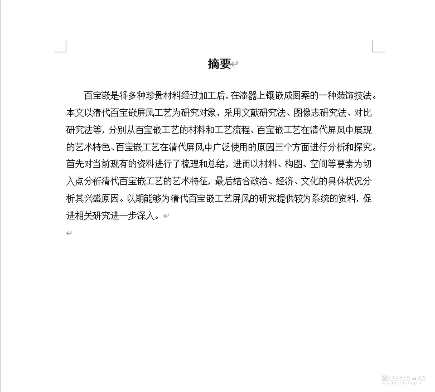 总之,百宝嵌工艺是极具代表性的中国传统工艺,首次出现在明代,它是一种在器物上将百宝镶嵌成图像作装饰的工艺。至清代,百宝嵌工艺在题材、载体、使用材料、工艺水平等各方面全面发展,上至统治者,下至百姓都十分喜爱这种工艺,尤其大量使用在清代屏风中。