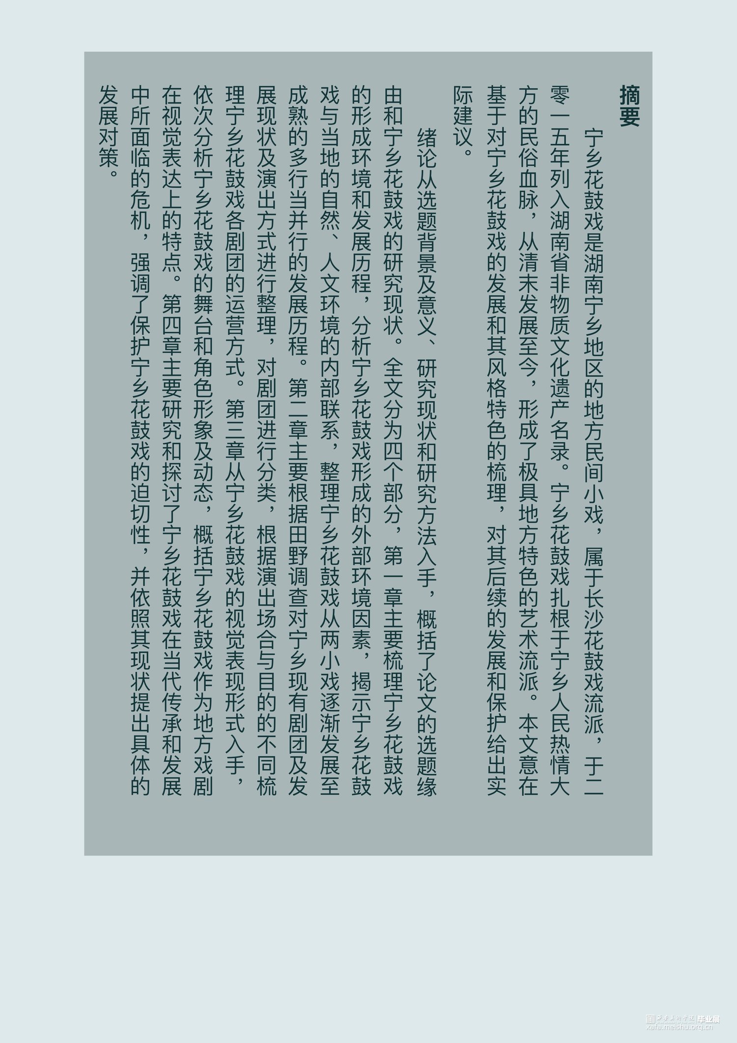 人类是社会属性的合集,这注定了个体离不开社群而独立存在,而传统社会关系的紧密联系则离不开社群里的各种活动。花鼓戏作为湖南地区最为重要的社群娱乐活动,与当地农村传统的民俗活动保持着着密不可分的联系,对清末时期的普通民众的社群交流中起到了桥梁的作用,在当今时代也作为社交活动的平台,能丰富农村群众的精神文化生活,提高其艺术情操。作为优秀的民族文化的宁乡花鼓戏现如今也面临着巨大的挑战,飞速发展的互联网也加快了群众的审美代谢,地方花鼓戏的受众也在时代的潮流中逐渐被分散,如果不能在传统形式上适时的更新迭代,必然会面临被时代所淘汰的危机,为了保护宁乡花鼓戏,保护其传承与发展,笔者对田野调查的口述材料和相关典籍、资料的文本材料进行整理和分析,同时也首次试图从视觉表现方面入手,为宁乡花鼓戏的持续发展找寻出路。