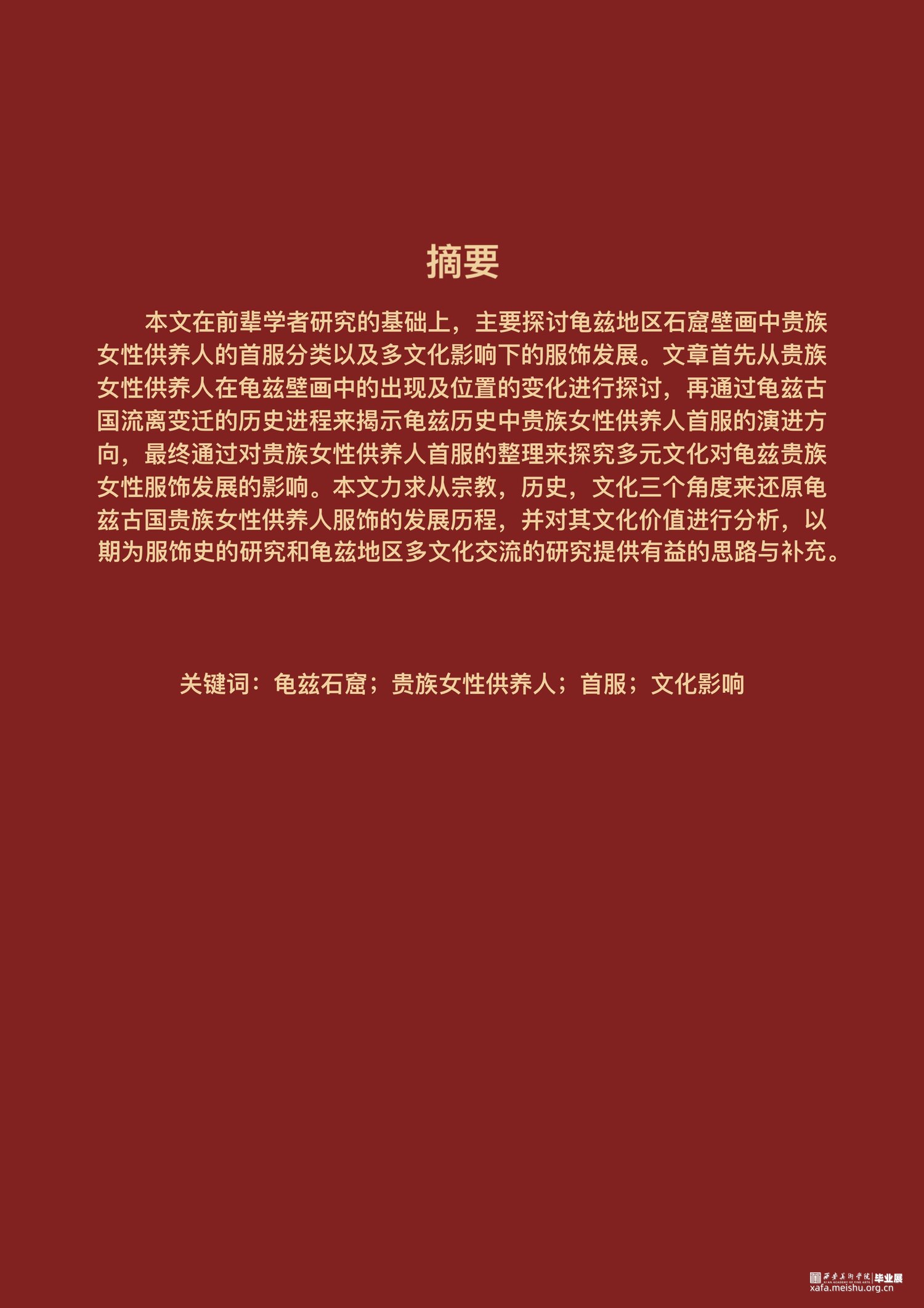 本文在前辈学者研究的基础上,主要探讨龟兹地区石窟壁画中贵族女性供养人的首服分类以及多文化影响下的服饰发展。文章首先从贵族女性供养人在龟兹壁画中的出现及位置的变化进行探讨,再通过龟兹古国流离变迁的历史进程来揭示龟兹历史中贵族女性供养人首服的演进方向,最终通过对贵族女性供养人首服的整理来探究多元文化对龟兹贵族女性服饰发展的影响。本文力求从宗教,历史,文化三个角度来还原龟兹古国贵族女性供养人服饰的发展历程,并对其文化价值进行分析,以期为服饰史的研究和龟兹地区多文化交流的研究提供有益的思路与补充。