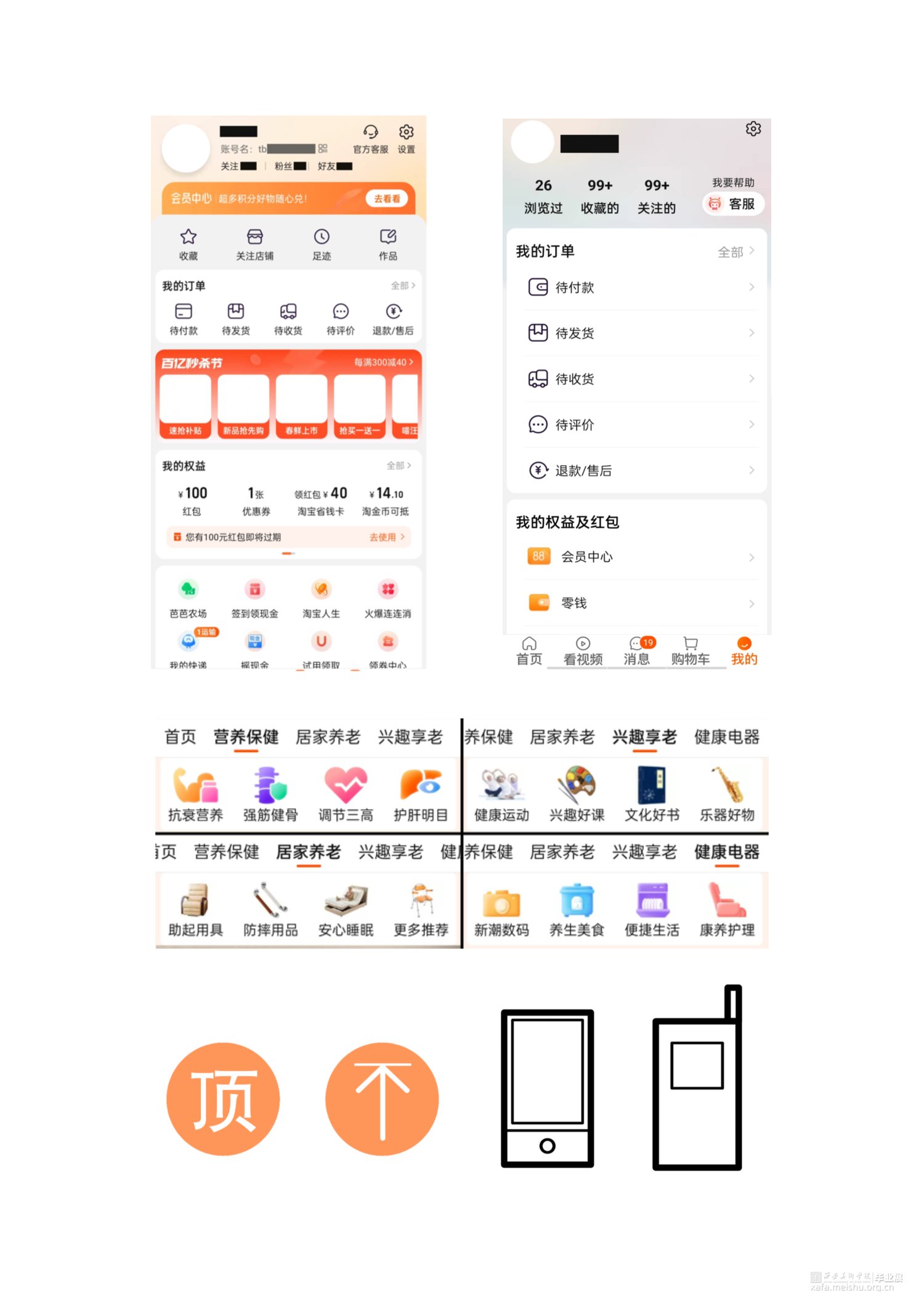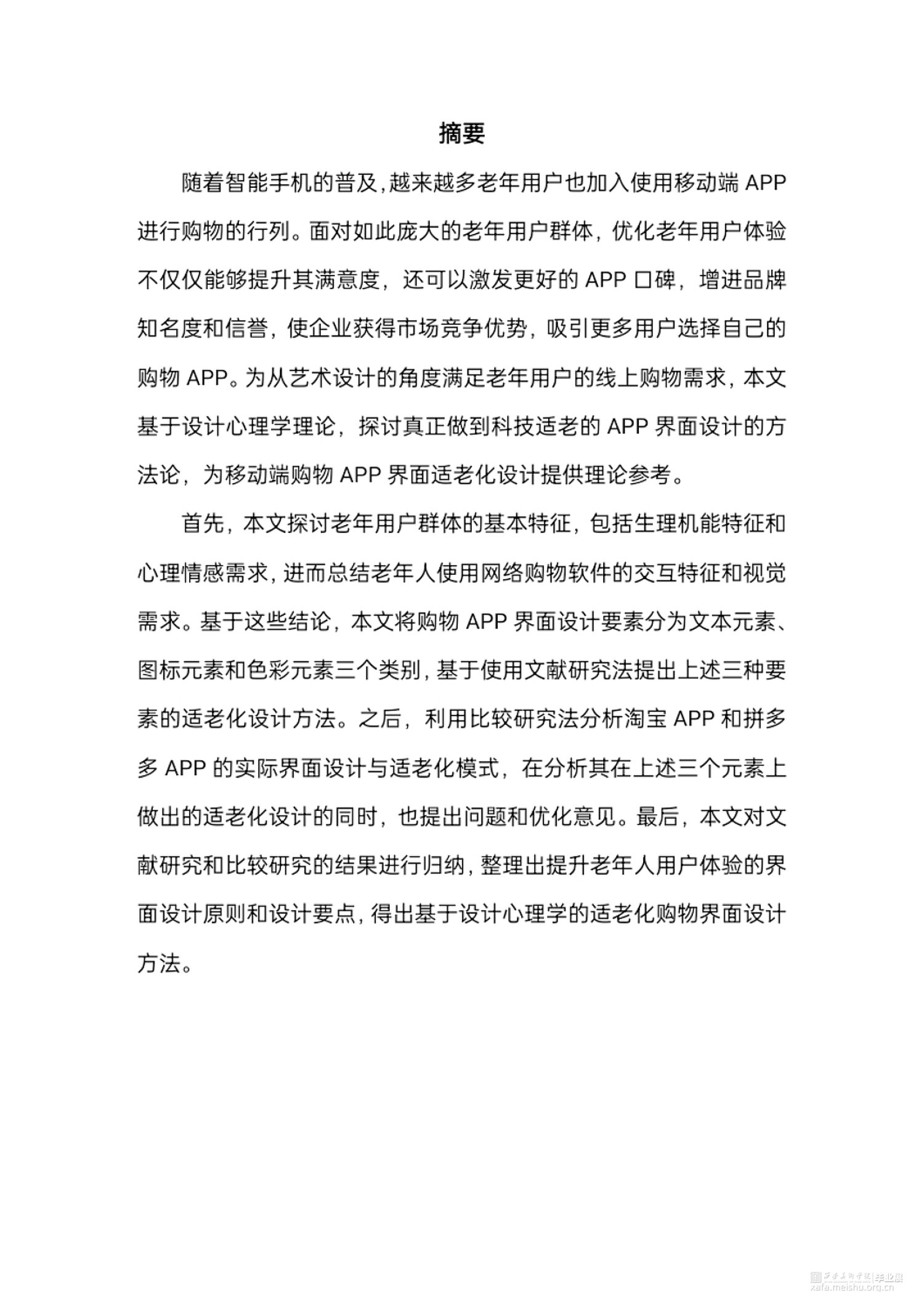 首先,本文探讨老年用户群体的基本特征,包括生理机能特征和心理情感需求,进而总结老年人使用网络购物软件的交互特征和视觉需求。基于这些结论,本文将购物APP界面设计要素分为文本元素、图标元素和色彩元素三个类别,基于使用文献研究法提出上述三种要素的适老化设计方法。之后,利用比较研究法分析淘宝APP和拼多多APP的实际界面设计与适老化模式,在分析其在上述三个元素上做出的适老化设计的同时,也提出问题和优化意见。最后,本文对文献研究和比较研究的结果进行归纳,整理出提升老年人用户体验的界面设计原则和设计要点,得出基于设计心理学的适老化购物界面设计方法。
