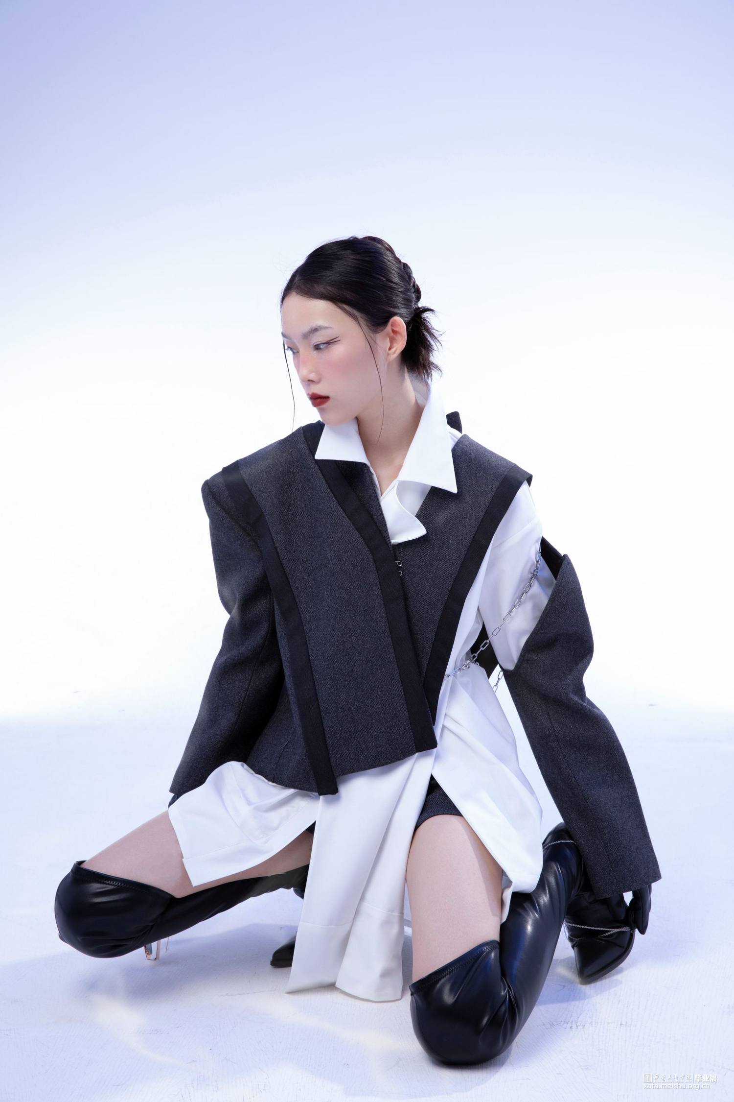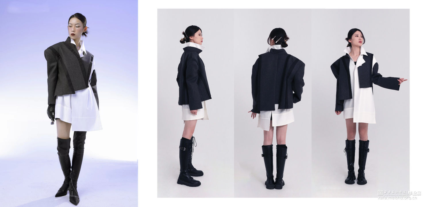 在服装造型三loo3中,西装外套正面与背面均体现了装饰性分割线中曲线分割的特点,体现女性柔和典雅的一面,尤其是背面分割线交叉拼合设计突破严肃的深色外套带来了呼吸感,正面根据结构线分割镂空造型,衣身与袖子连接四分之三,露出衬衫腰部下摆波浪设计体现该服装造型设计的节奏感,同时中式交领与传统衬衫领结合,推陈出新使得整体服装有了俏皮活泼的美感。结构分割手法与其他设计手法的交汇融合创新为女装成衣造型设计提供了新的设计灵感,是对服装造型设计手法的创新探索,是对人体结构空间塑造和服装造型新的尝试与探索。