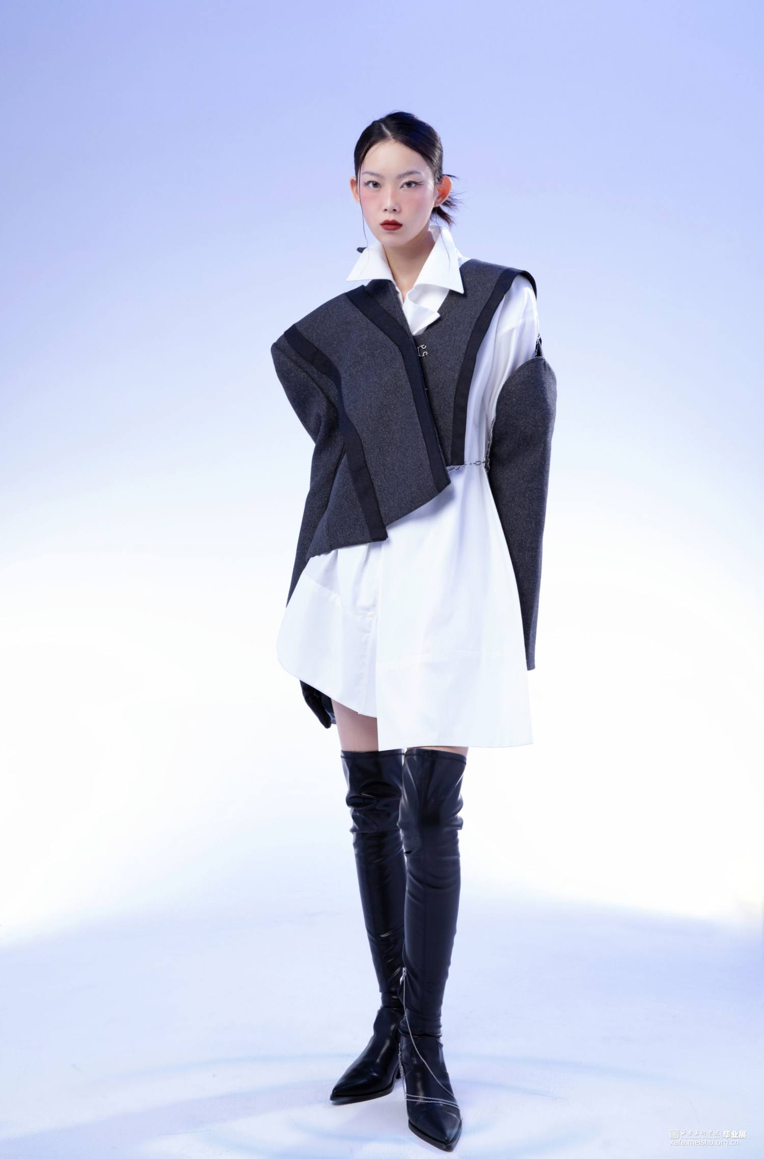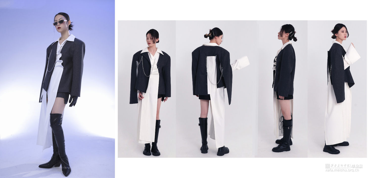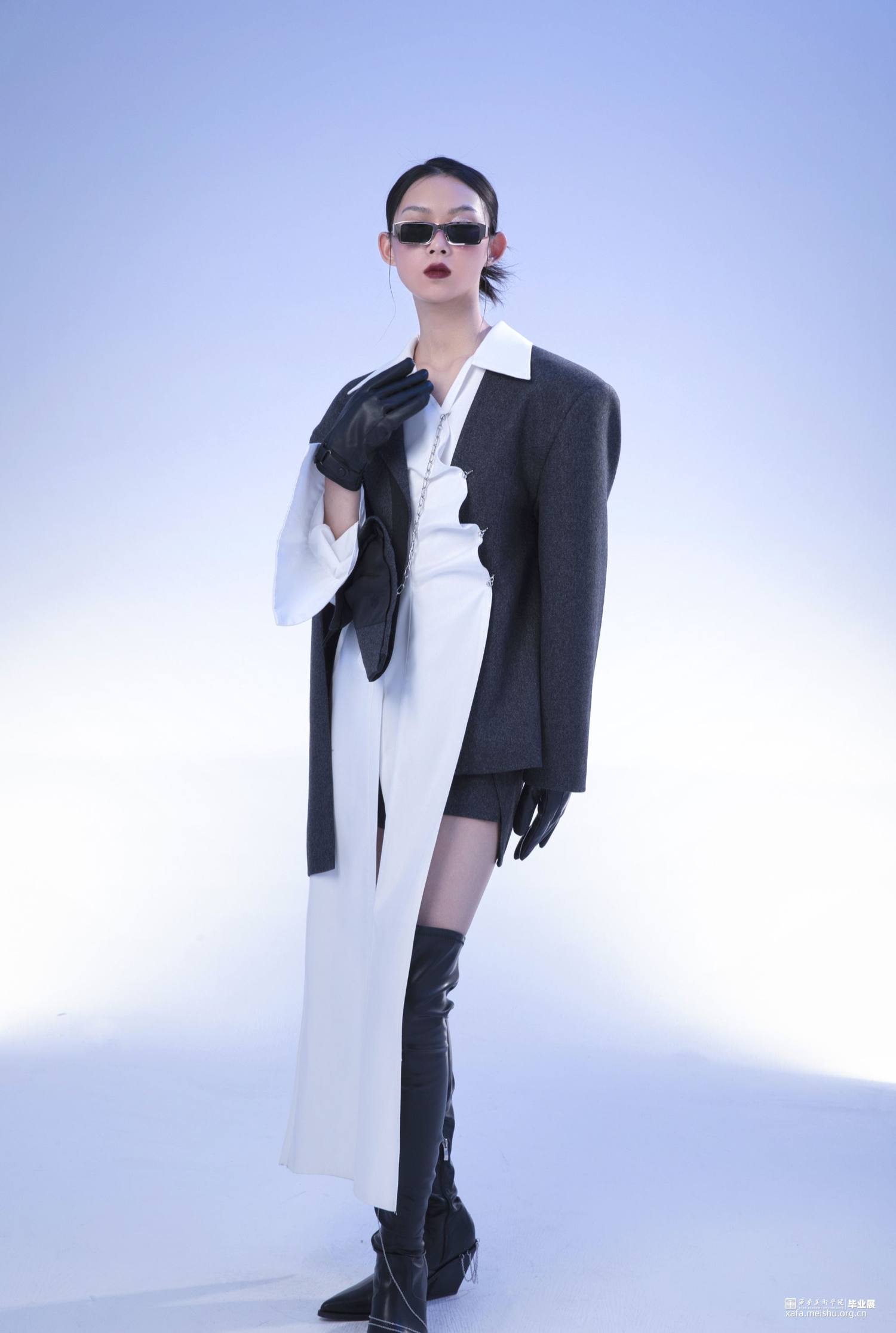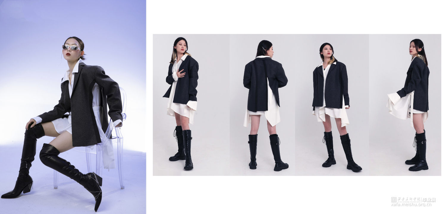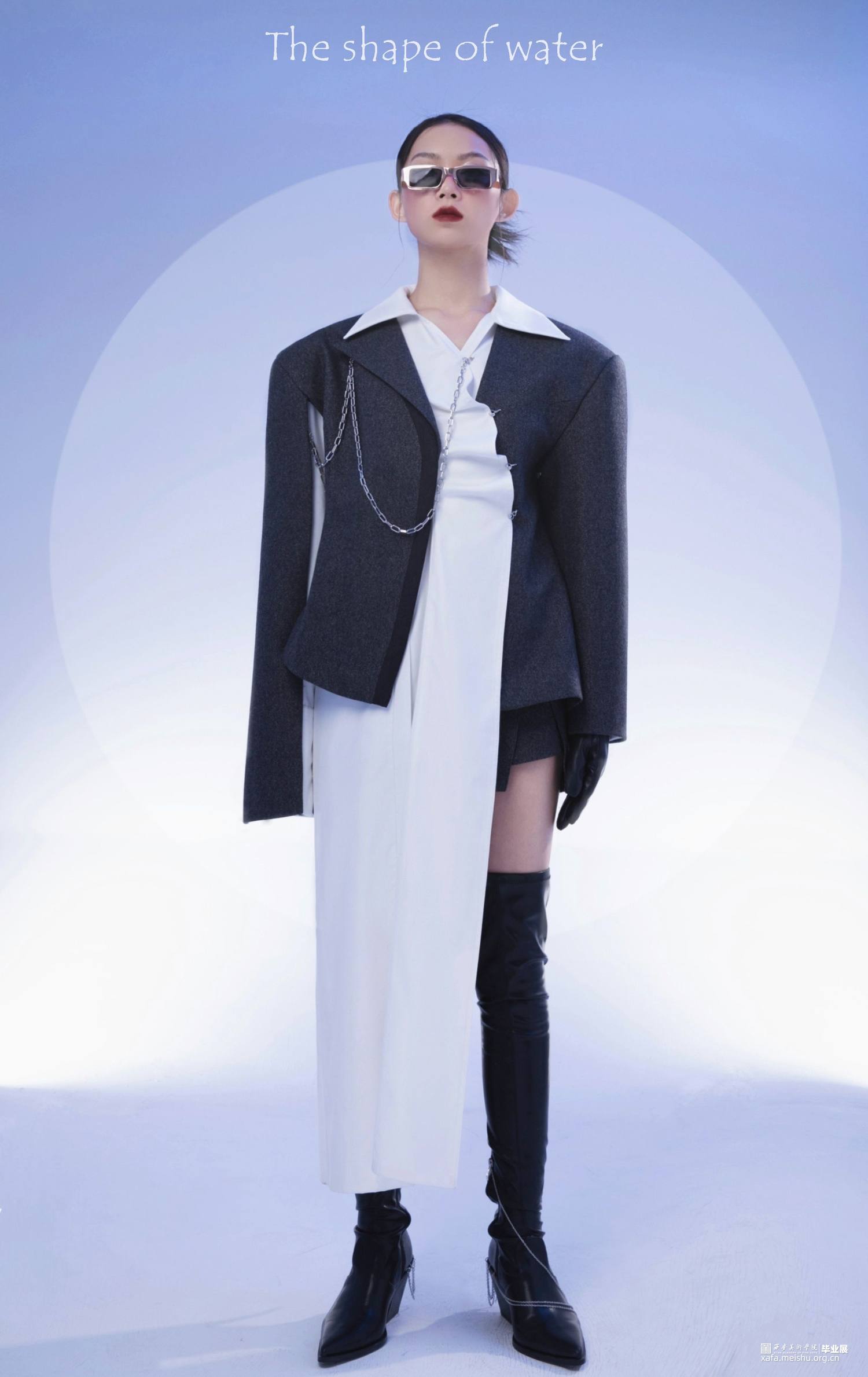《The shape of water》作品所传达的是结构分割在女装成衣造型设计中的创新应用实践。该服装造型分割的表达形式根据水形态的线条的变形而表现,自上而下的代表“水”的分割线贯穿西装外套或西装外套与衬衫的整体,表达一种利落、不羁、俏皮、轻松、洒脱的现代女性感。