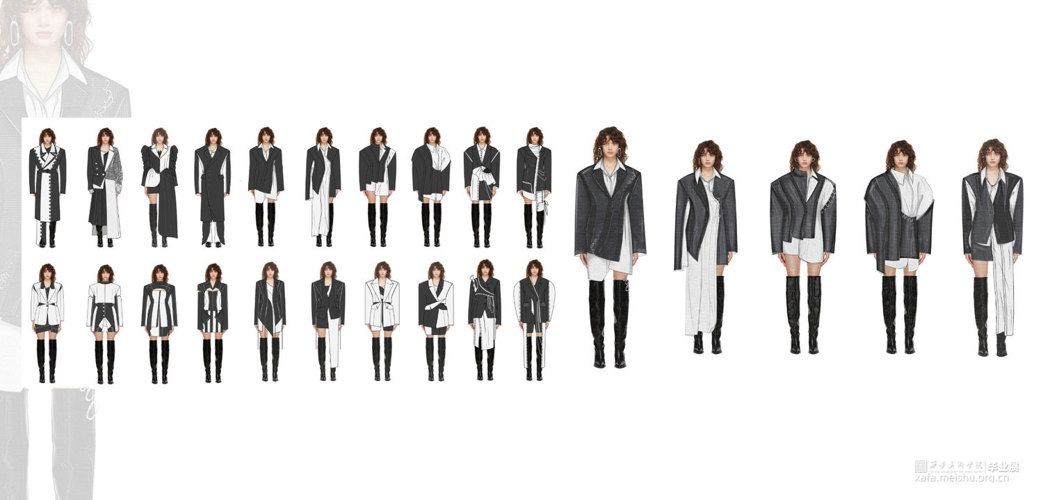 在服装造型一look1中,西装外套的大面积分割和局部结构镂空领子与衣身与衬衫领型结构增加互为整体,具有宽度的分割线在起到装饰性分割作用的同时兼具功能性分割的作用,使得整体服装外部造型廓形增大肩部放宽呈T型,同时内部结构收腰体现人体腰部特征,以及错落不规则的底边设计使服装具有律动感。该分割线的运用在其他两套服装造型中均有体现。