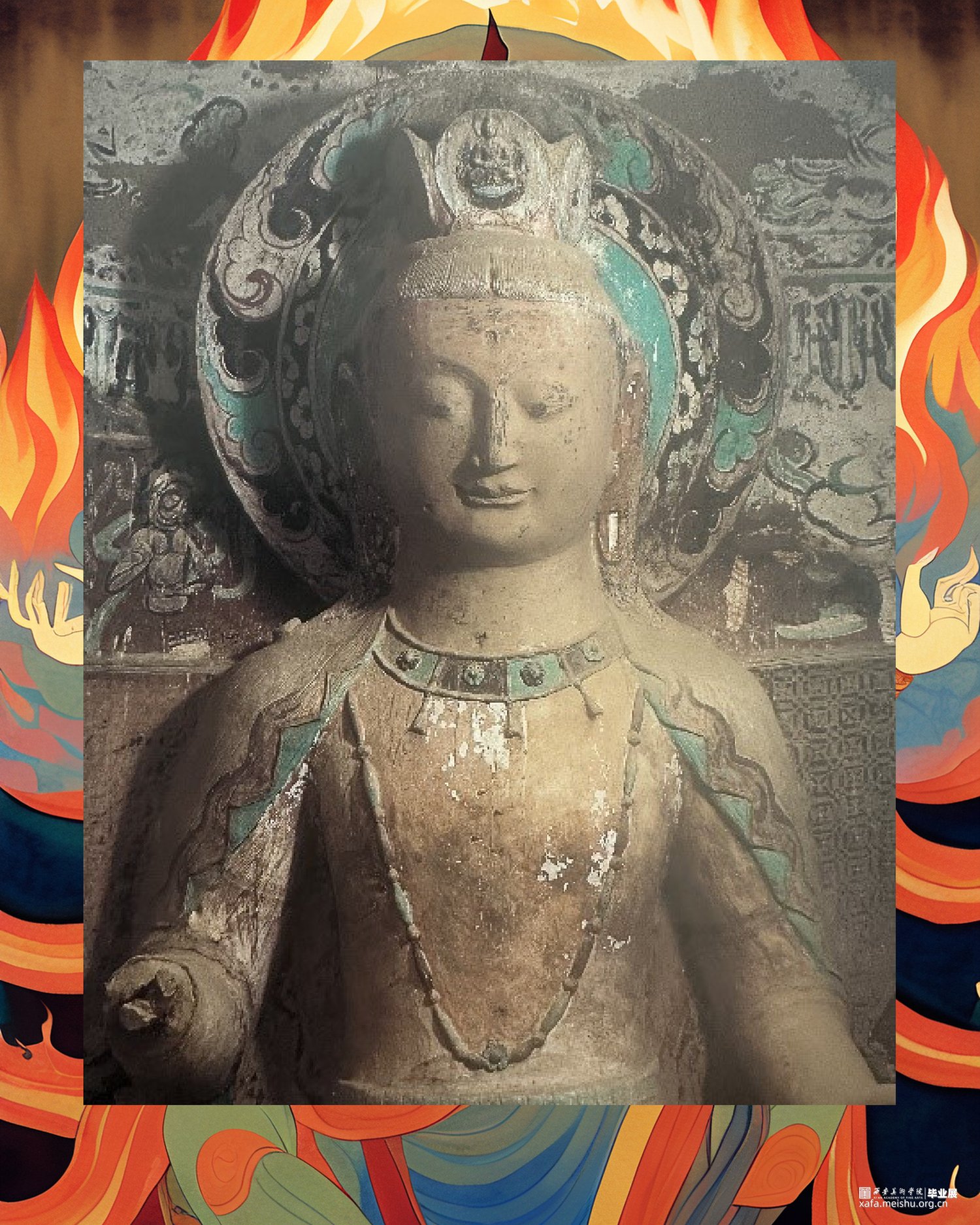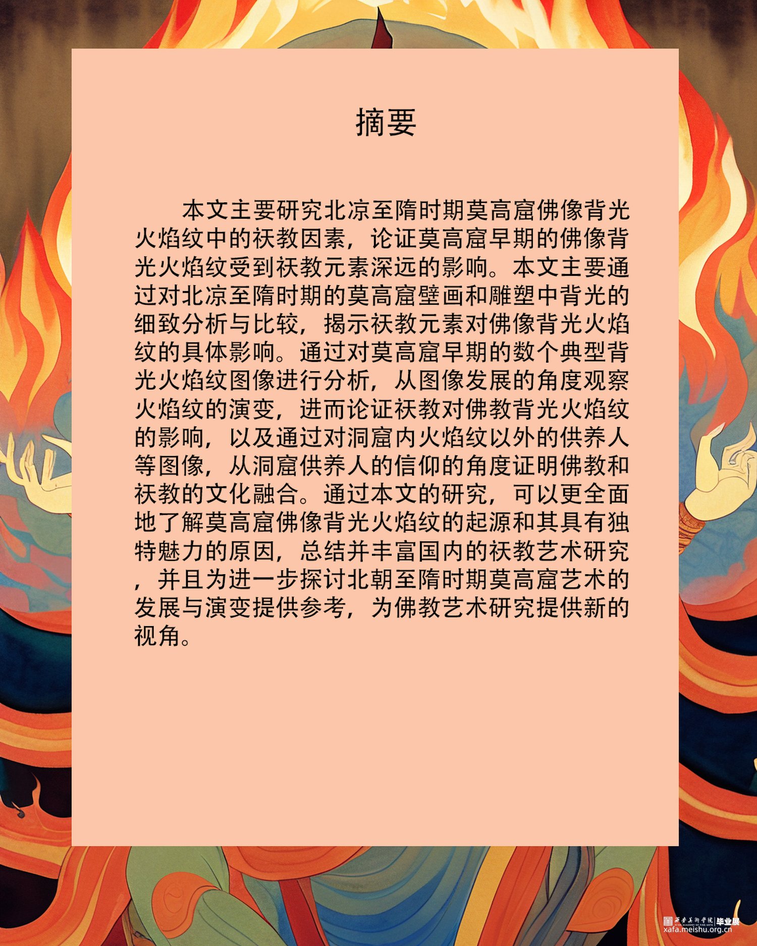 本文主要研究北凉至隋时期莫高窟佛像背光火焰纹中的祆教因素,论证莫高窟早期的佛像背光火焰纹受到祆教元素深远的影响。本文主要通过对北凉至隋时期的莫高窟壁画和雕塑中背光的细致分析与比较,揭示祆教元素对佛像背光火焰纹的具体影响。通过对莫高窟早期的数个典型背光火焰纹图像进行分析,从图像发展的角度观察火焰纹的演变,进而论证祆教对佛教背光火焰纹的影响,以及通过对洞窟内火焰纹以外的供养人等图像,从洞窟供养人的信仰的角度证明佛教和祆教的文化融合。通过本文的研究,可以更全面地了解莫高窟佛像背光火焰纹的起源和其具有独特魅力的原因,总结并丰富国内的祆教艺术研究,并且为进一步探讨北朝至隋时期莫高窟艺术的发展与演变提供参考,为佛教艺术研究提供新的视角。