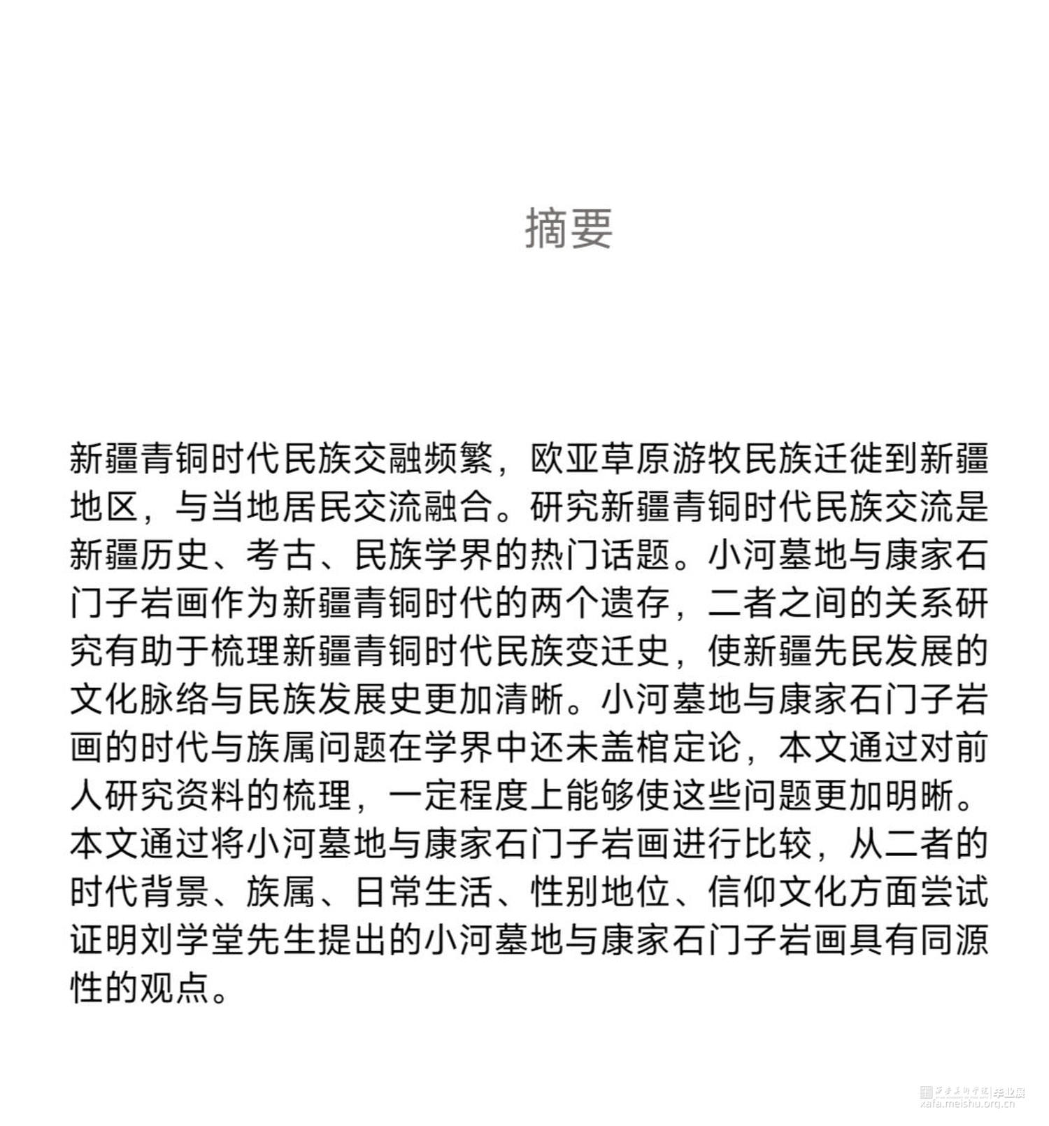 小河墓地与康家石门子岩画的文化同源性探究目的在于证明二者的同源性。二者的同源性研究是分析古代新疆亚欧人群大迁徙,了解古代新疆民族交融变迁不可忽视的一个研究内容。明确小河墓地与康家石门子岩画的关系,有利于探究古代新疆民族交融的真实历史。