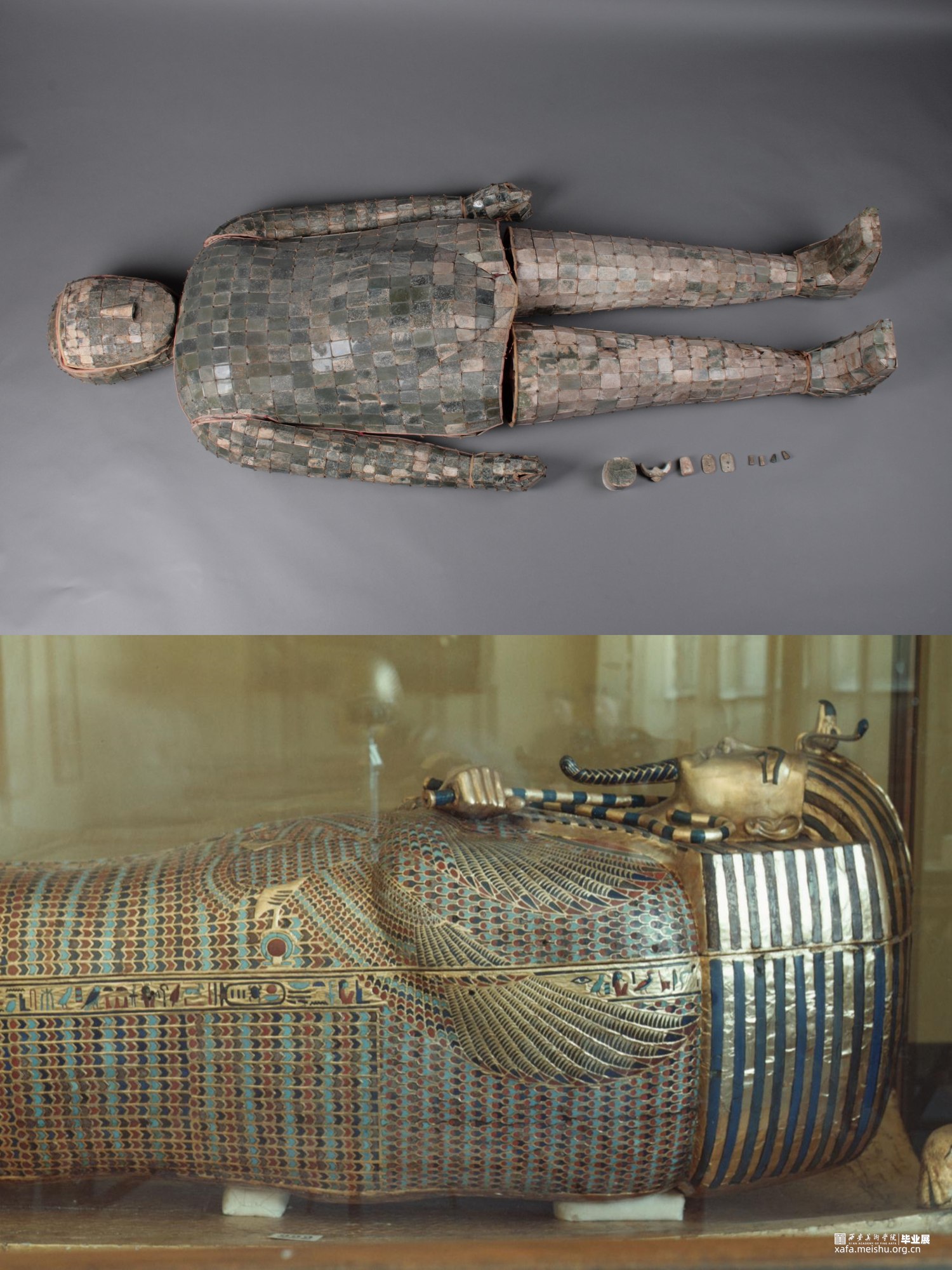 古埃及和汉代都在各自的领域将保存尸体做到了极致,但是由于不同的信仰,表现手法有很大不同。由于古埃及人信仰太阳神,所以他们将尸体做成木乃伊放进黄金打造的棺材里,因为古埃及人相信黄金就是可以触摸的太阳,由此他们的国王就能在死后复活,成为神明,继续庇佑世界宇宙的平和;汉代人有玉崇拜,相信玉有防腐和长生不老的功效,所以打造出了铠甲一样贴合尸体的玉衣,用金丝线连缀玉片,让死者的灵魂有所依。同时木乃伊和玉衣是两个文明中各自的医学和手工业水平的巅峰代表。殊途同归,两个文明都用自己的智慧守护了死者的灵魂和肉体。并且还有黄金面罩和玉覆面作为双重保险,古埃及人希望死者的灵魂能够快速找到自己的身体,所以在棺材和面具上保留了死者的面貌,汉人为了死者的灵魂留住,打造了玉覆面保护大脑。其中古埃及的棺材和面具还展现了法老人形和面貌,从中我们也能够看出古埃及的雕塑审美风格。