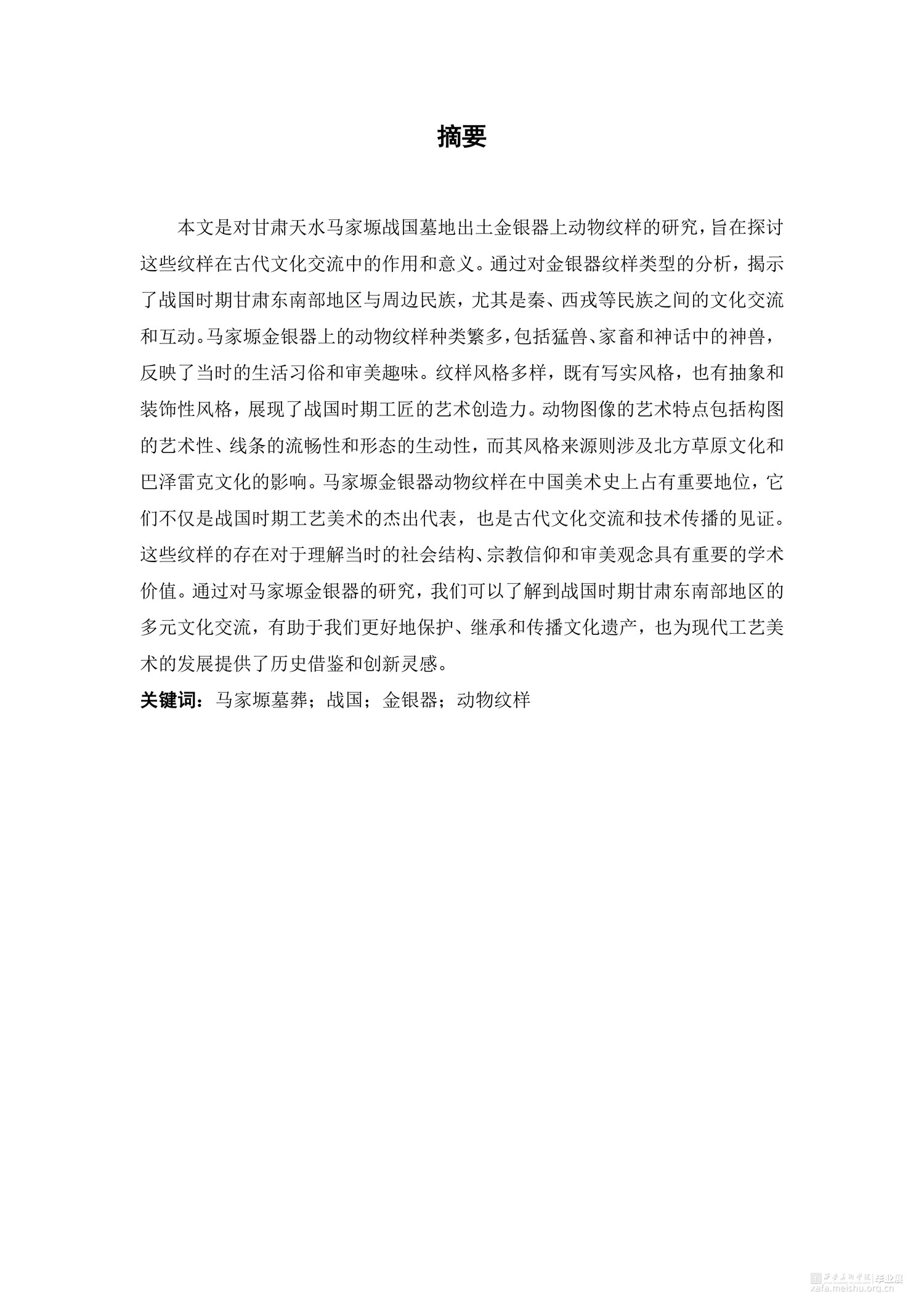 本文是对甘肃天水马家塬战国墓地出土金银器上动物纹样的研究,旨在探讨这些纹样在古代文化交流中的作用和意义。通过对金银器纹样类型的分析,揭示了战国时期甘肃东南部地区与周边民族,尤其是秦、西戎等民族之间的文化交流和互动。马家塬金银器上的动物纹样种类繁多,包括猛兽、家畜和神话中的神兽,反映了当时的生活习俗和审美趣味。纹样风格多样,既有写实风格,也有抽象和装饰性风格,展现了战国时期工匠的艺术创造力。动物图像的艺术特点包括构图的艺术性、线条的流畅性和形态的生动性,而其风格来源则涉及北方草原文化和巴泽雷克文化的影响。马家塬金银器动物纹样在中国美术史上占有重要地位,它们不仅是战国时期工艺美术的杰出代表,也是古代文化交流和技术传播的见证。这些纹样的存在对于理解当时的社会结构、宗教信仰和审美观念具有重要的学术价值。通过对马家塬金银器的研究,我们可以了解到战国时期甘肃东南部地区的多元文化交流,有助于我们更好地保护、继承和传播文化遗产,也为现代工艺美术的发展提供了历史借鉴和创新灵感。