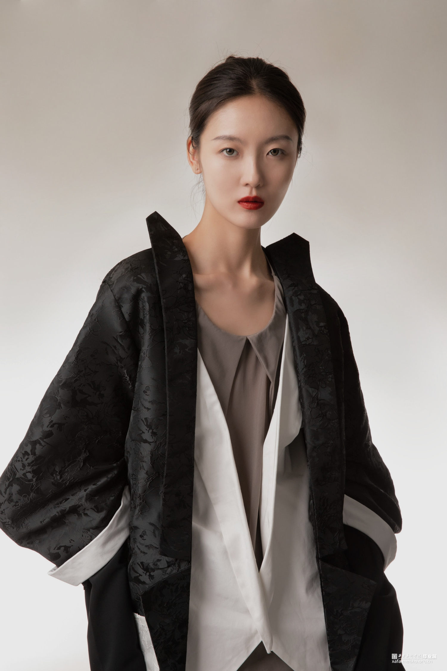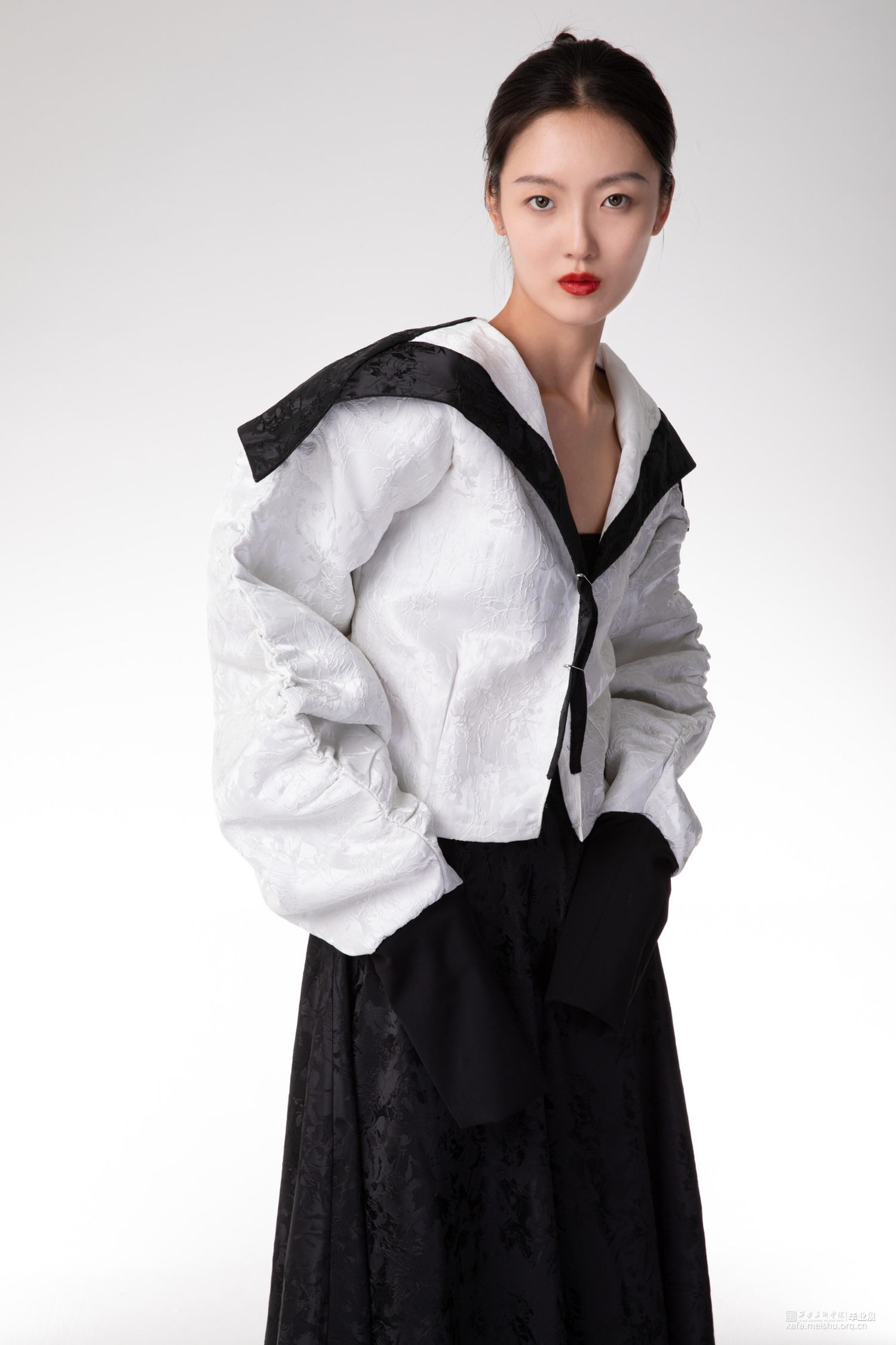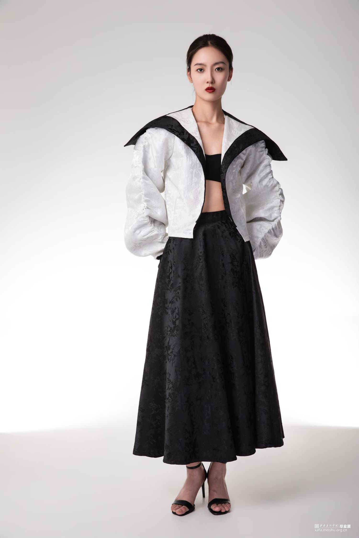 设计以中国文化为主要灵感,提花面料的使用为灵感来源,通过对提花材质和提花面料的使用的深入学习和研究,将其提取、创新,并融入进毕业创作中。在毕业设计创作的过程中,将传统文化提花面料与现代时尚的廓形相融合,打造不一样的设计风格,通过提花面料的创作成衣设计,传达出传统与时尚相互碰撞,为设计增添创新。设计提取了经典配色黑白灰,最终决定主色为黑、白两色,整体非黑即白,再以灰色为点缀均匀使用服装整体色调给人很缓和的状态,黑白灰是一种态度,不浮不躁,不卑不亢。每一套服装中都运用提花面料,在酷酷的同时添加一点亮点,颜色从深到浅无规则地层层递进,使服装的色彩浑然一体,亮色在内搭和配饰上的点缀让人眼前一亮