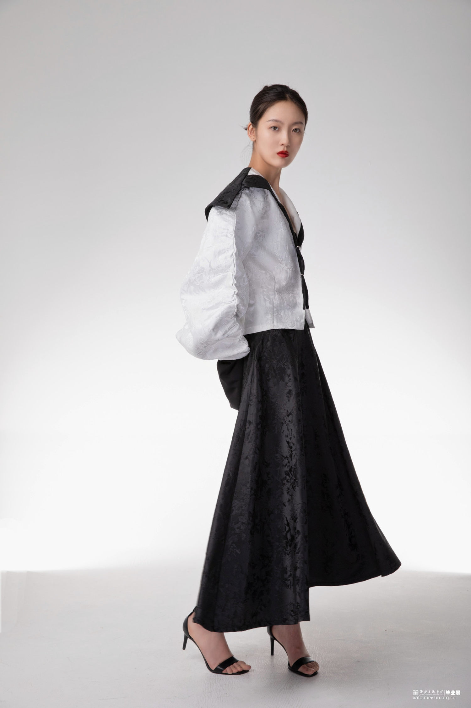 设计以中国文化为主要灵感,提花面料的使用为灵感来源,通过对提花材质和提花面料的使用的深入学习和研究,将其提取、创新,并融入进毕业创作中。在毕业设计创作的过程中,将传统文化提花面料与现代时尚的廓形相融合,打造不一样的设计风格,通过提花面料的创作成衣设计,传达出传统与时尚相互碰撞,为设计增添创新。设计提取了经典配色黑白灰,最终决定主色为黑、白两色,整体非黑即白,再以灰色为点缀均匀使用服装整体色调给人很缓和的状态,黑白灰是一种态度,不浮不躁,不卑不亢。每一套服装中都运用提花面料,在酷酷的同时添加一点亮点,颜色从
