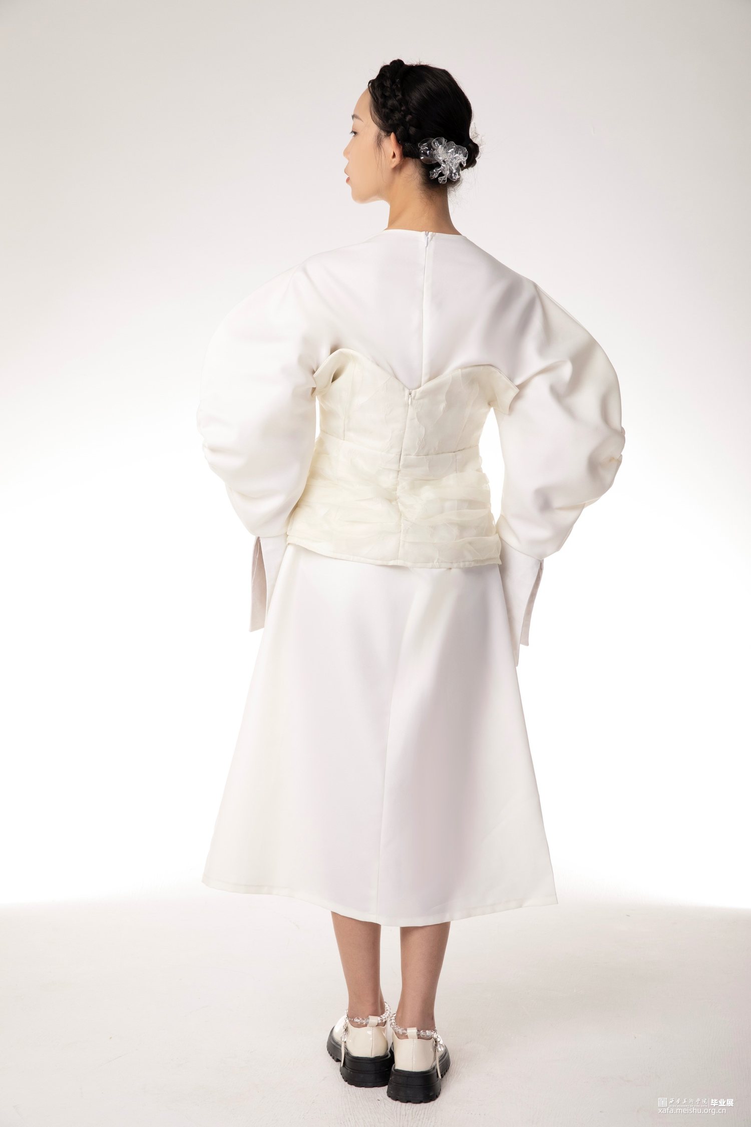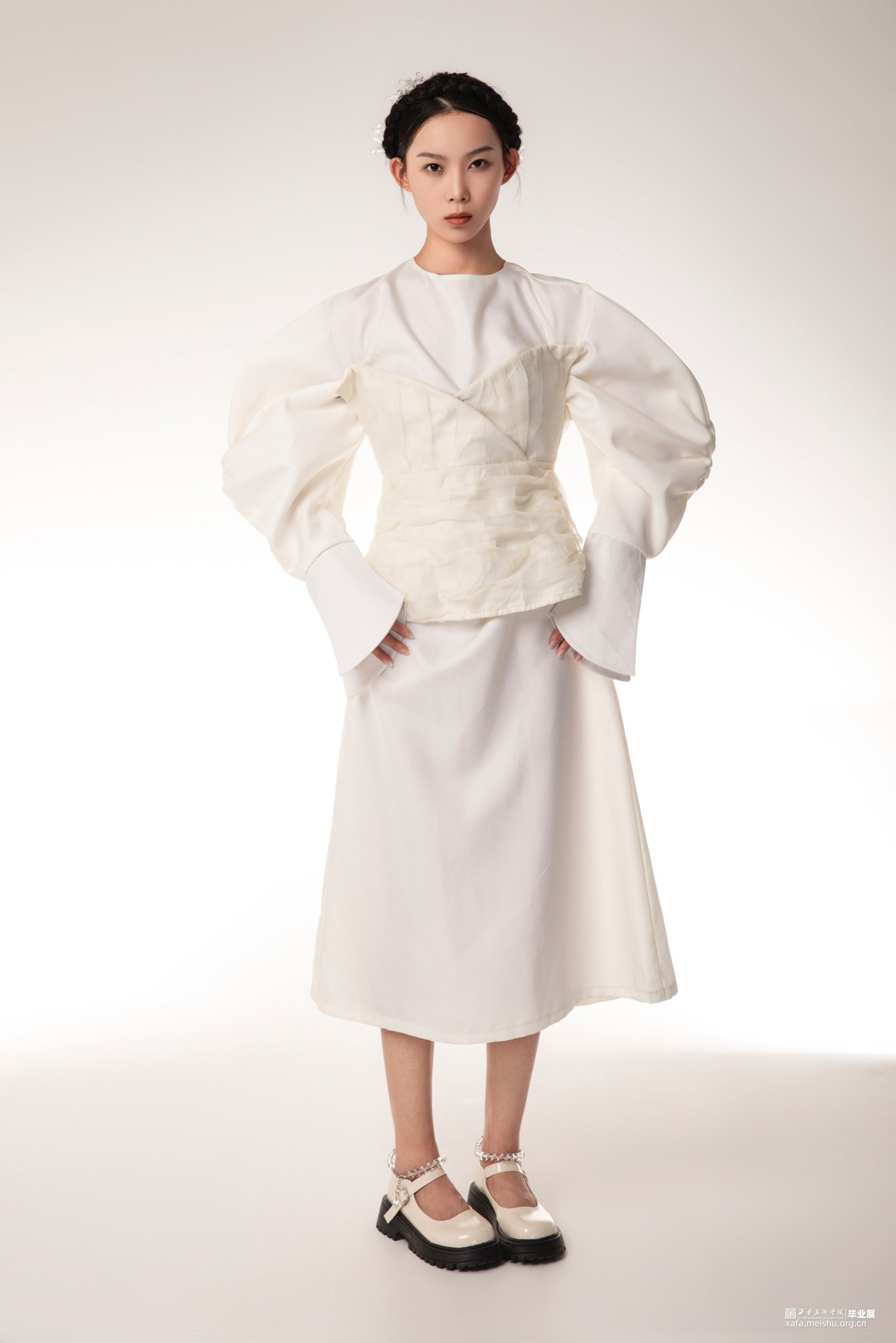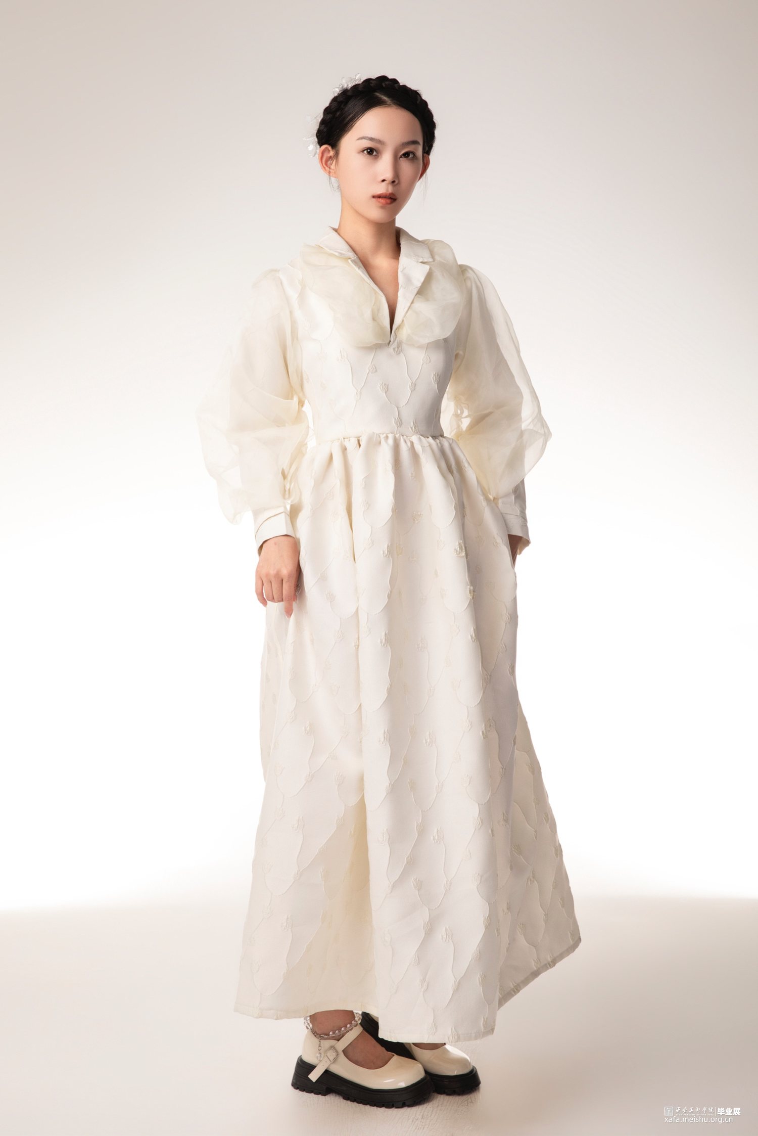 本人毕业设计以“宫”为主题,体现东西方宫廷韵味,灵感来源是西方巴洛克艺术风格,通过了解巴洛克时期的服装造型,在本人的毕业设计中服装廓形使用了泡泡袖、羊腿袖、A字型裙摆、束腰这些元素,毕业创作款式设计图,放大了服装的体量感,符合巴洛克艺术风格的服装设计,设计中,半透明的层次效果,增加了服装的空间感,纱料的泡泡袖叠加在里层提花面料上,让原本较为厚重的质感,更显的轻快活泼,加上巴洛克风格的荷叶边领口,使用的是更清透的纱料,复古与现代的结合,让服装不显的沉闷无聊。整个系列设计想表达的是充满浪漫气息的休闲女装。