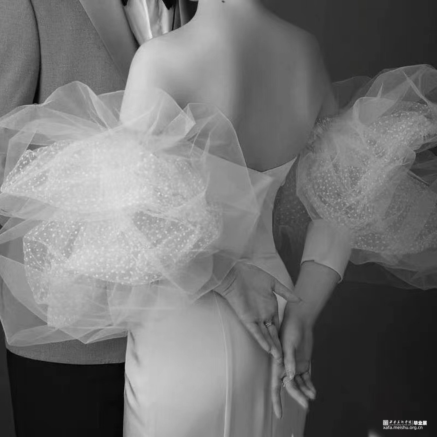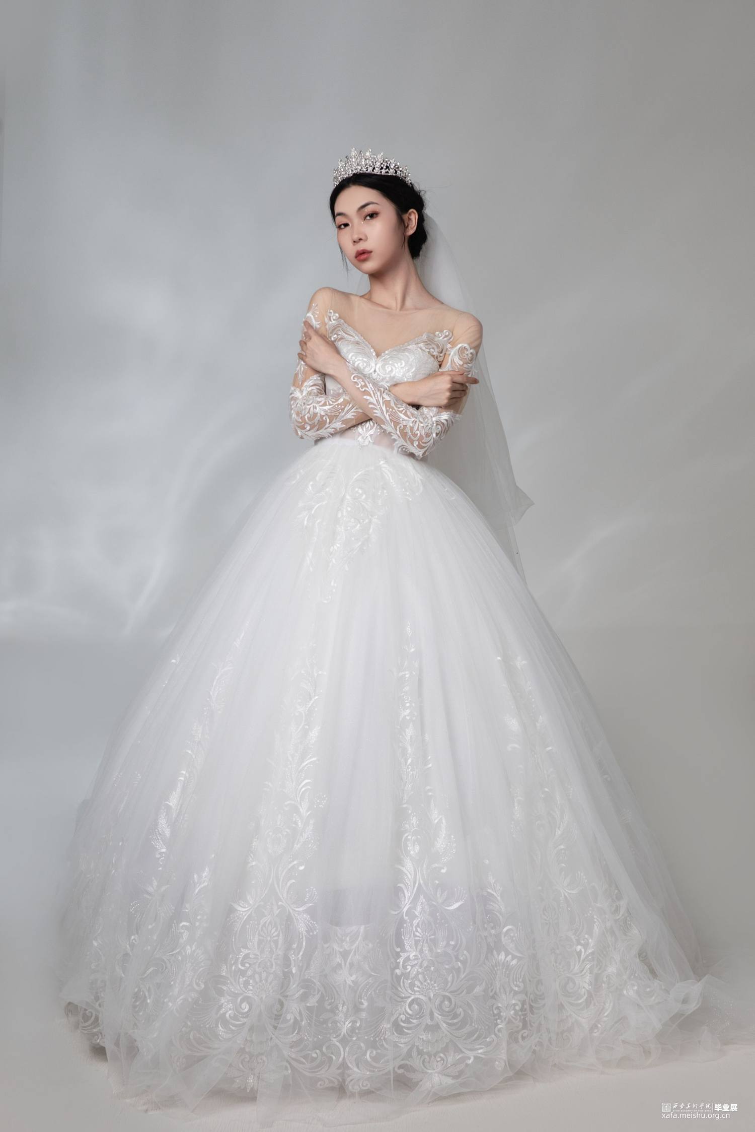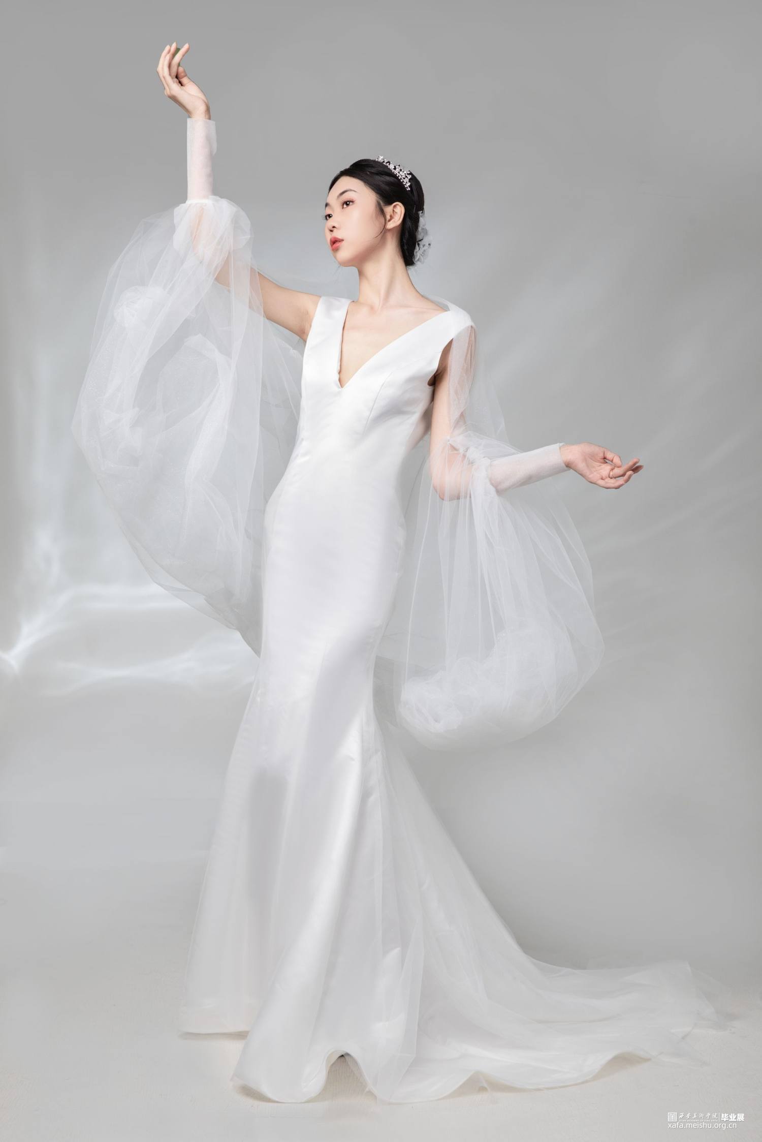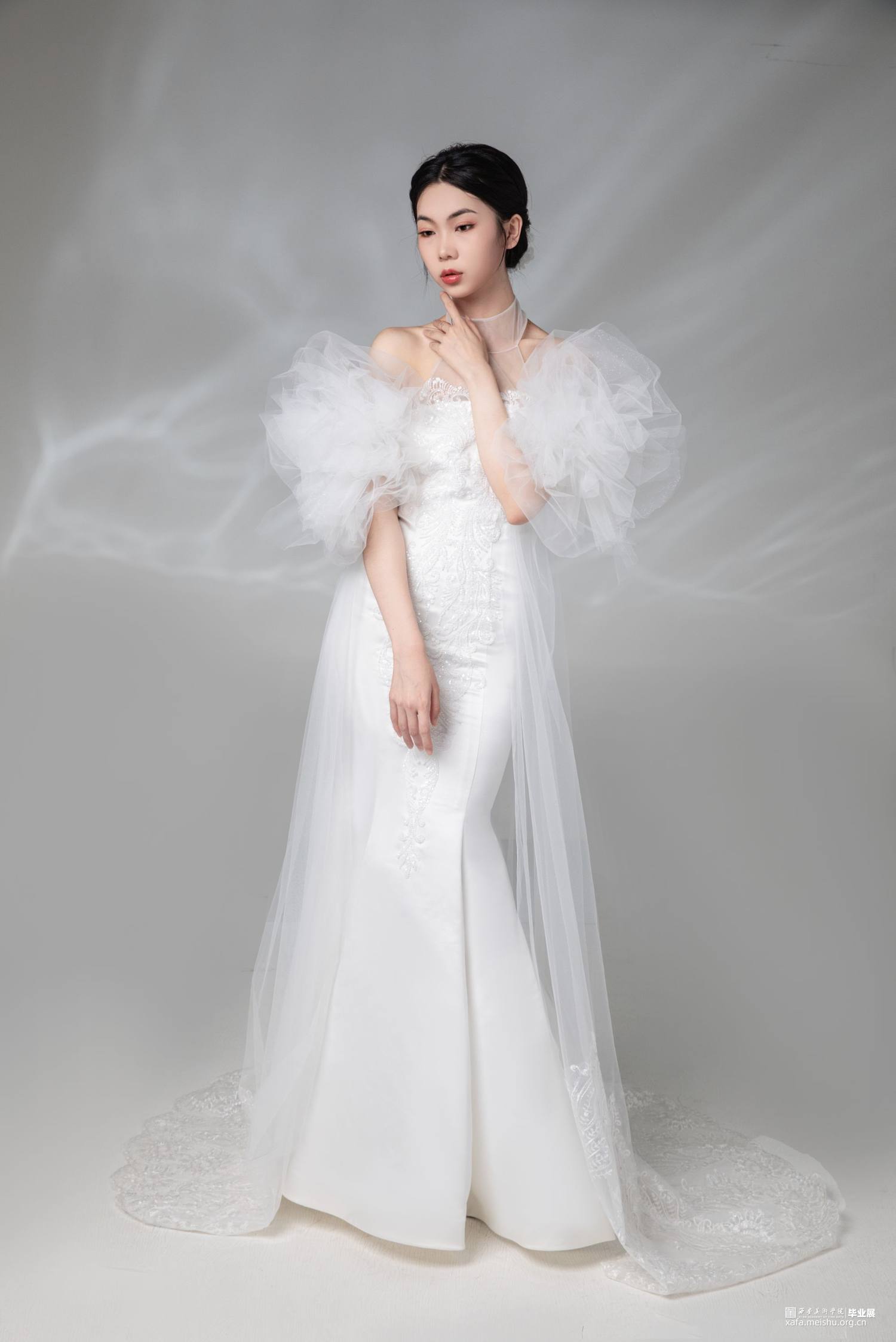 我的设计灵感来源于西方童话《仙度瑞拉》(《灰姑娘》),运用大量的纱与水晶点缀来体现贯穿故事主线的“水晶鞋”,设计作品将传统的大摆蓬蓬裙与体现女性曲线美的鱼尾长礼服作为主要载体,以半透软网纱与钉珠蕾丝刺绣体现西方传统宫廷礼服繁复精致的造型,增加作品的梦幻感与童话感。