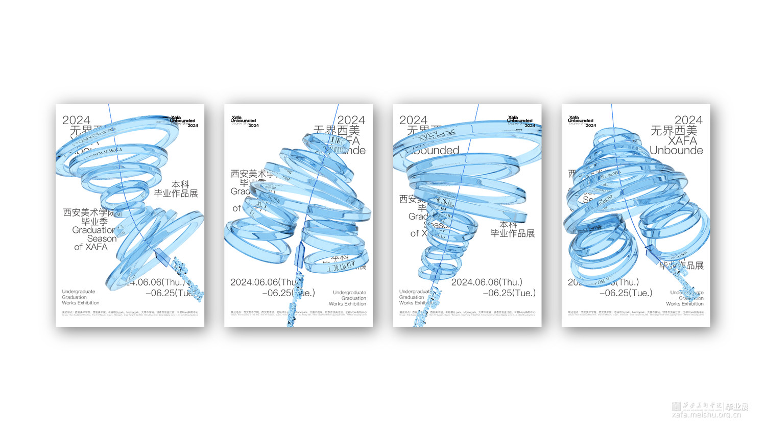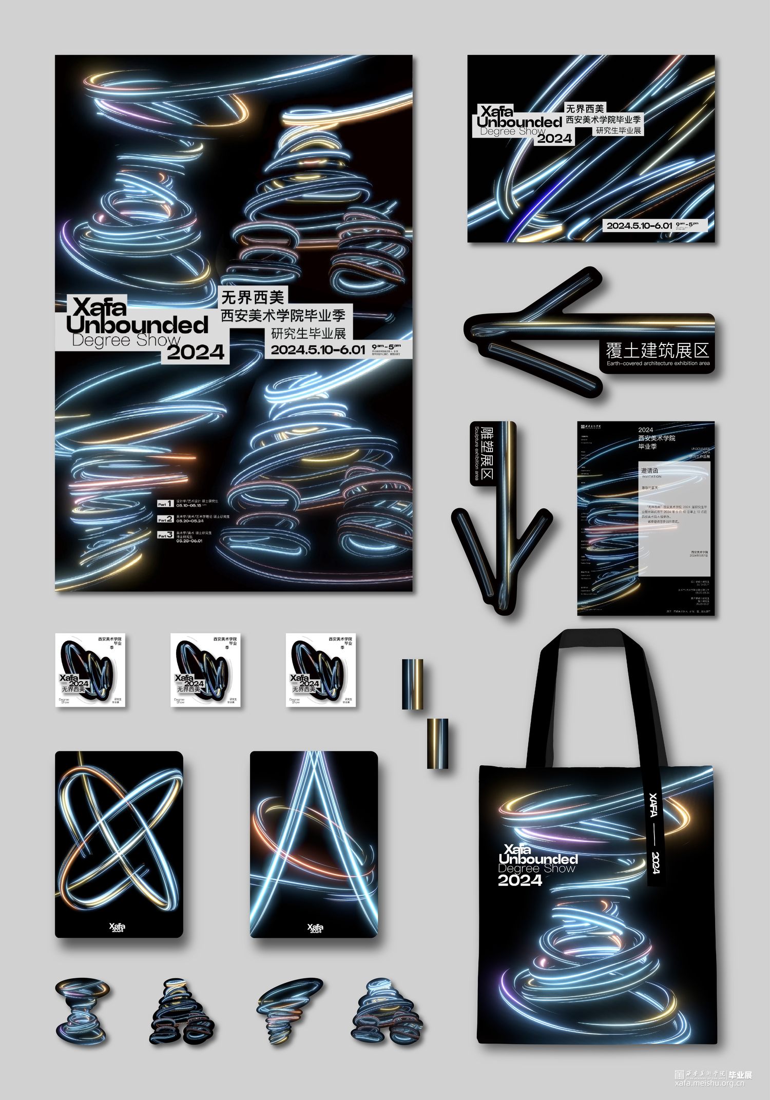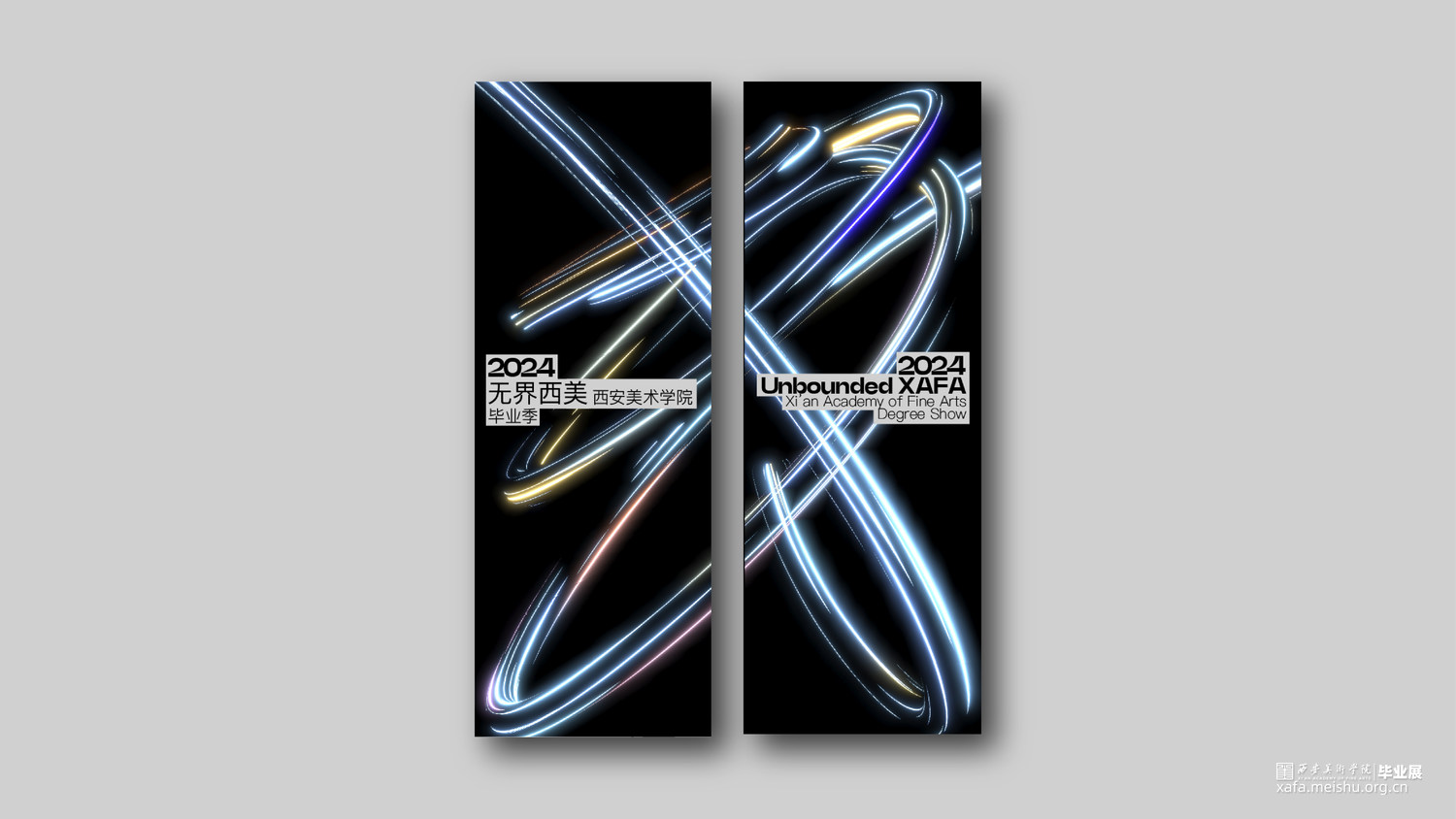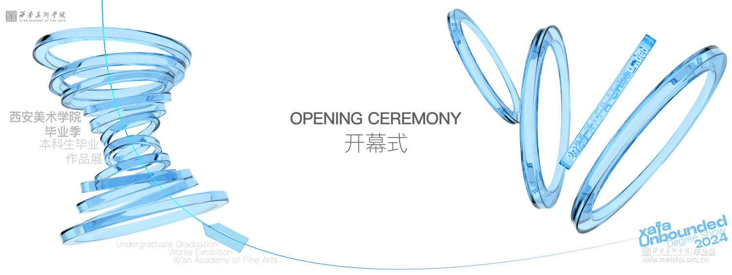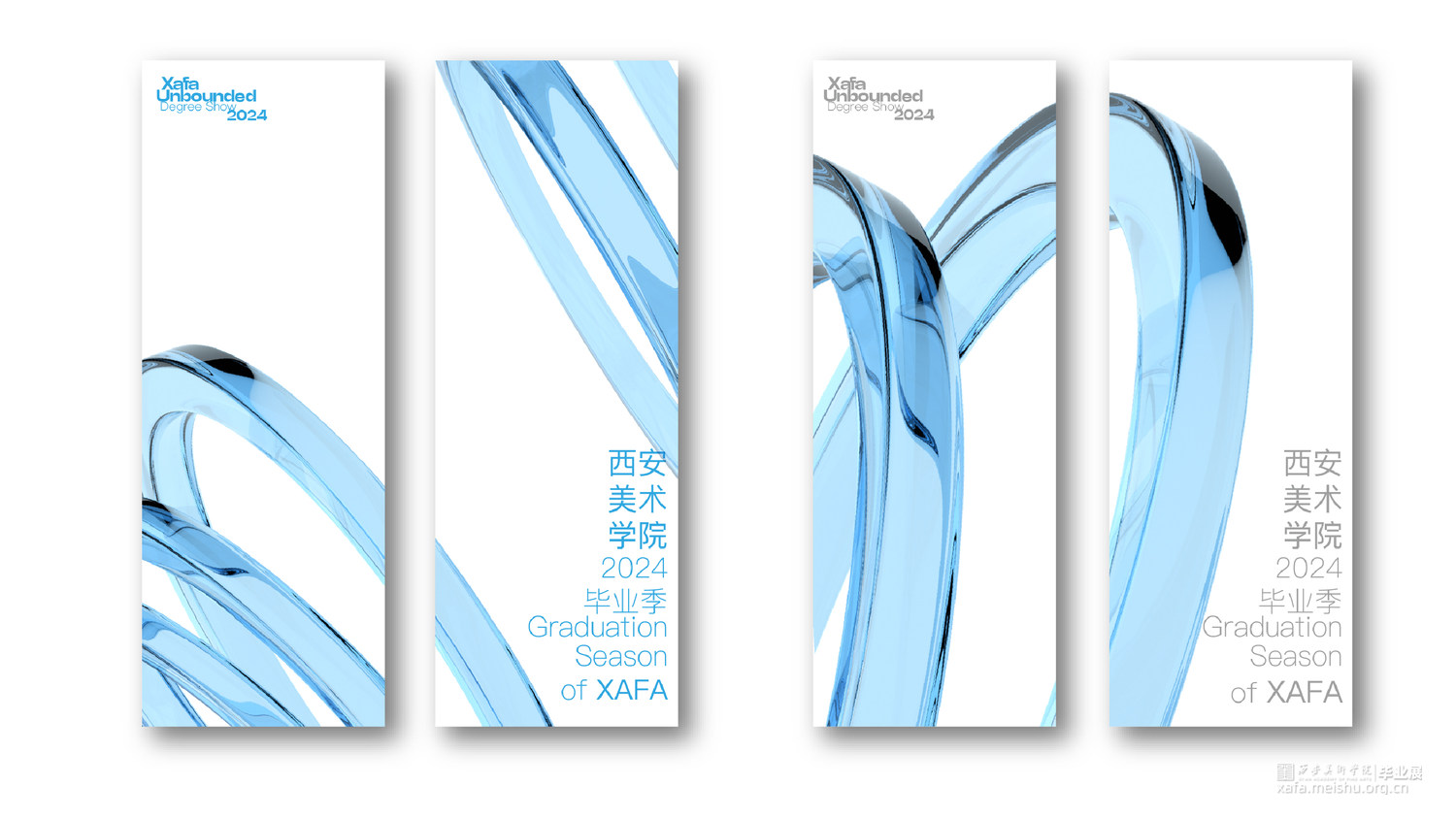 本次毕业季以“风”的律动为元素进行视觉延展,轻盈飘逸的“无界之风”吹动,飘逸动感的蔚蓝之环,传递出阵阵动人心弦的磬灵之声,而形成西安美术学院(XAFA)的风动场域。跨越技能、专业和学科边界;以古都西安为起点,通过西美艺术的无界之风,走出校园,走进生活,展现“城市之风”,引领“未来之风”。