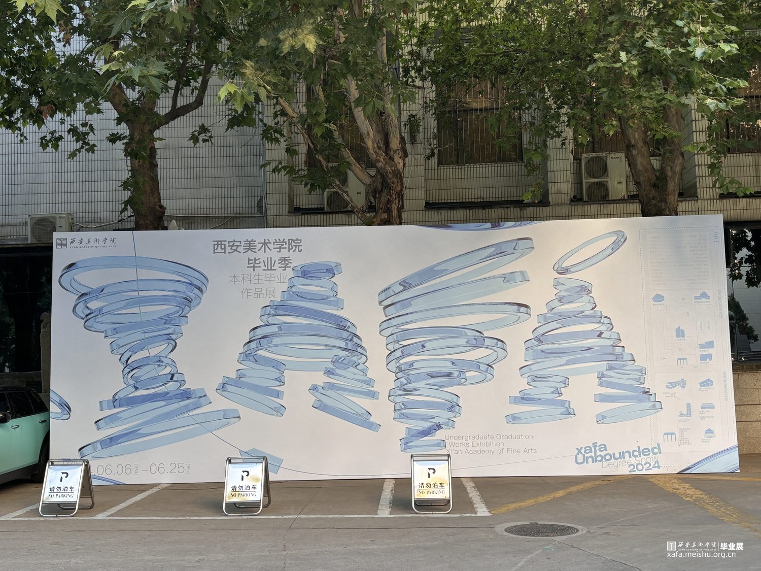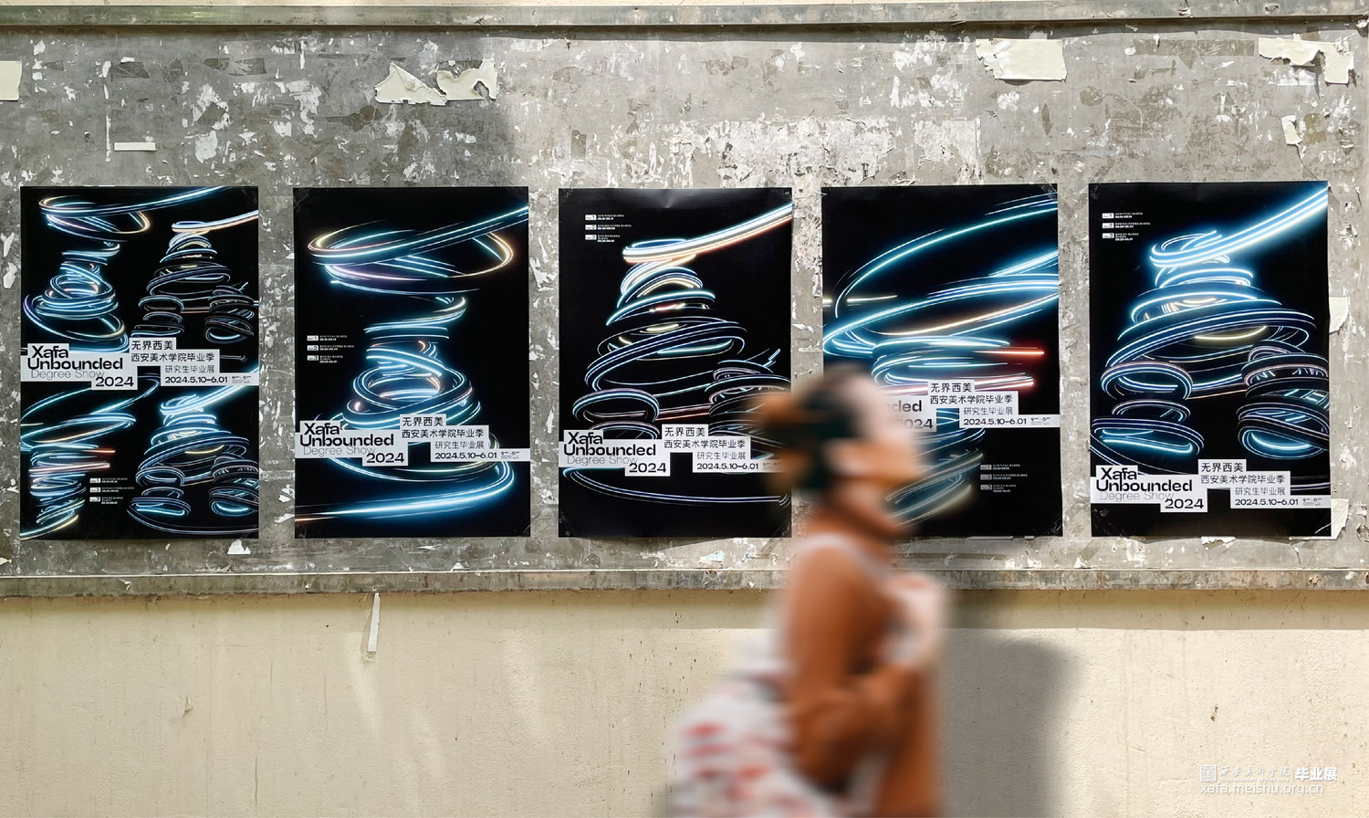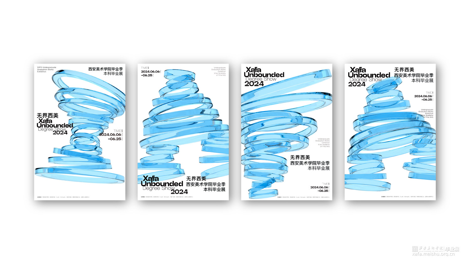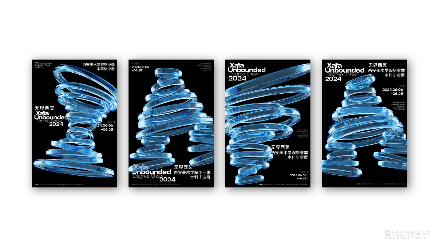 本次毕业季以“风”的律动为元素进行视觉延展,轻盈飘逸的“无界之风”吹动,飘逸动感的蔚蓝之环,传递出阵阵动人心弦的磬灵之声,而形成西安美术学院(XAFA)的风动场域。跨越技能、专业和学科边界;以古都西安为起点,通过西美艺术的无界之风,走出校园,走进生活,展现“城市之风”,引领“未来之风”。