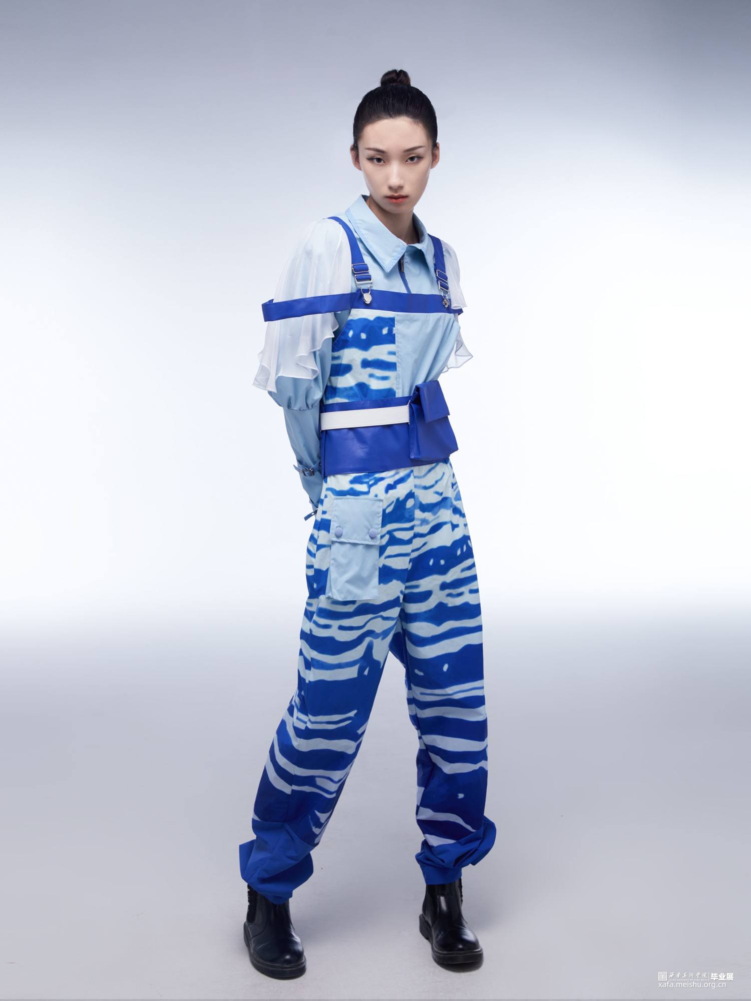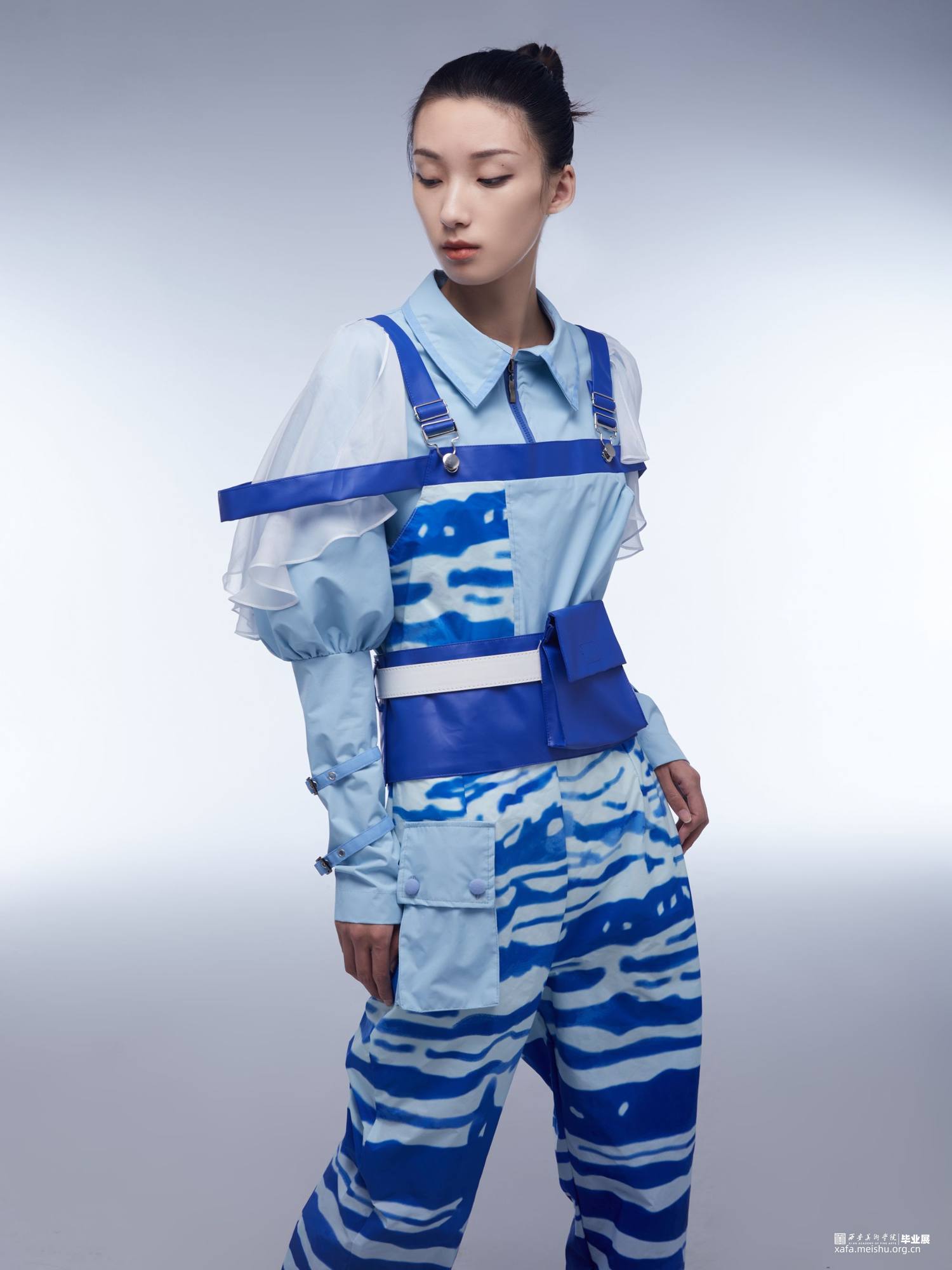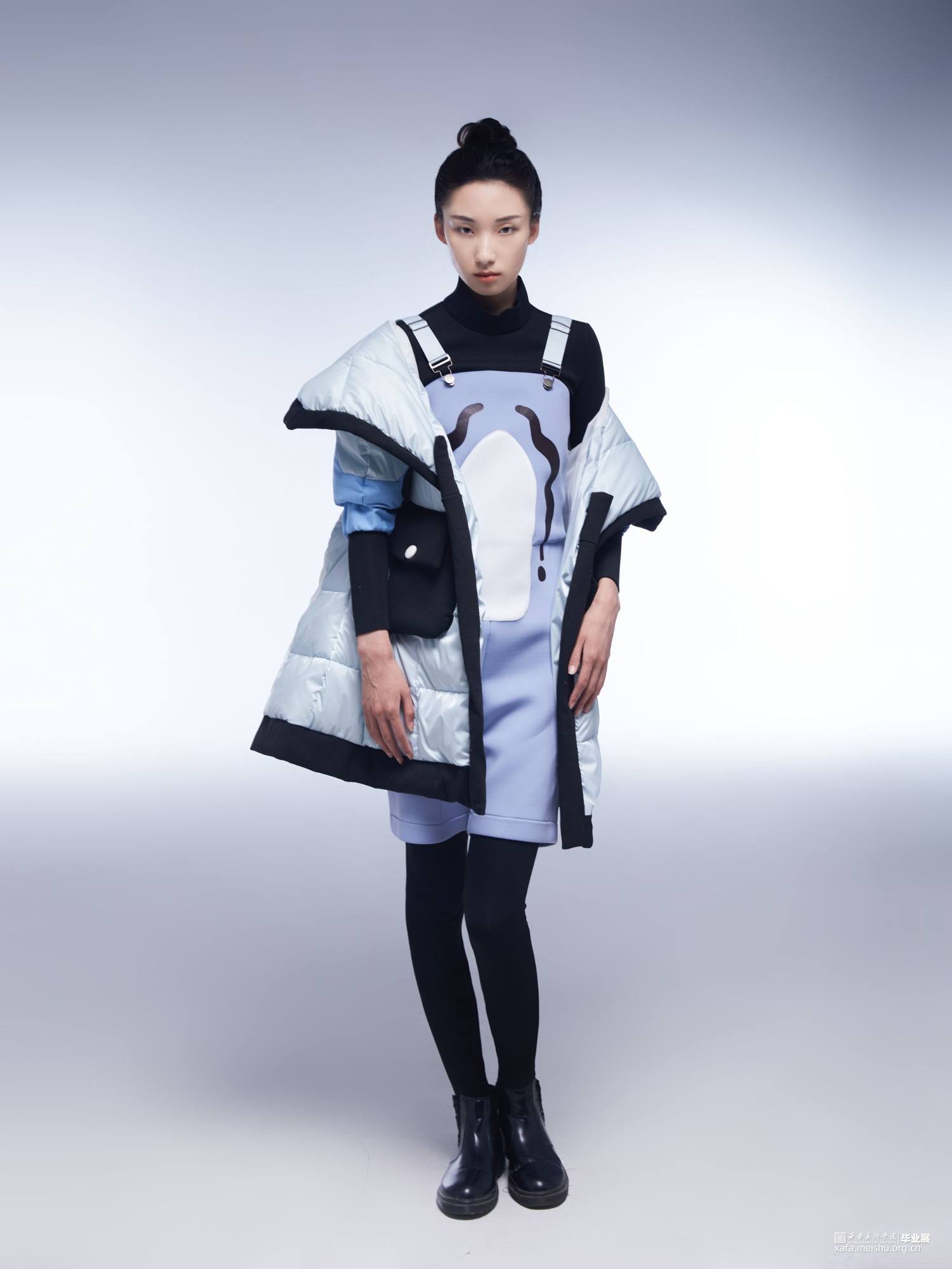 本次服装的设计主题为海洋生物,服装当中的花纹、形态、以及部分构成都来源于隐藏在深海中缤纷多彩的海洋生物们。之所以想到以此作为主题,是因为滑雪这项运动一般都在山中进行,若是将深海中的元素带到雪山上,想必也会为滑雪这项运动增添一丝视觉上的趣味性。同时在查找资料的过程中,无数多姿多彩的海洋生物们的身姿也十分适合作为滑雪服设计当中丰富的素材库。本次仿生元素的摘取中,服装上的图案十分具象,可以直观的看出它们是直接取自水母、海牛、热带鱼等生物身上自带的花纹。而服装整体的分割缝线及廓形,则是较为主观抽象的模仿了它们的形状。羽绒外套的鼓起包括反光的材质与水母相似、背带两侧的飘纱如同透明的鱼鳍。