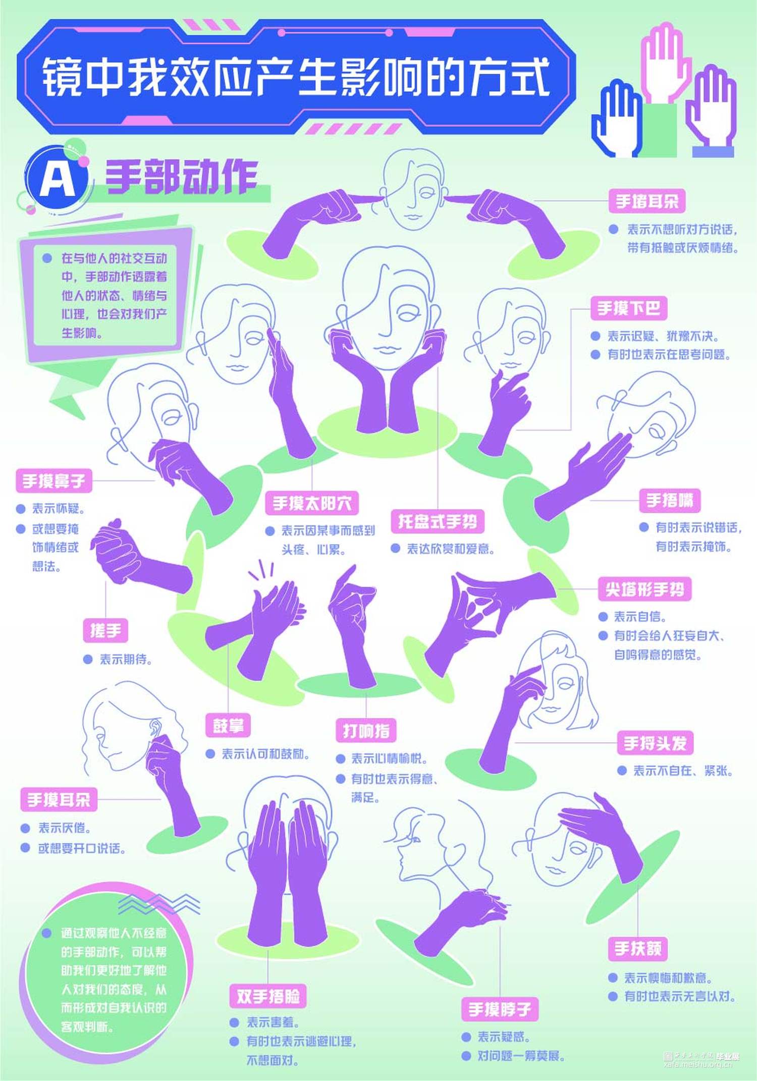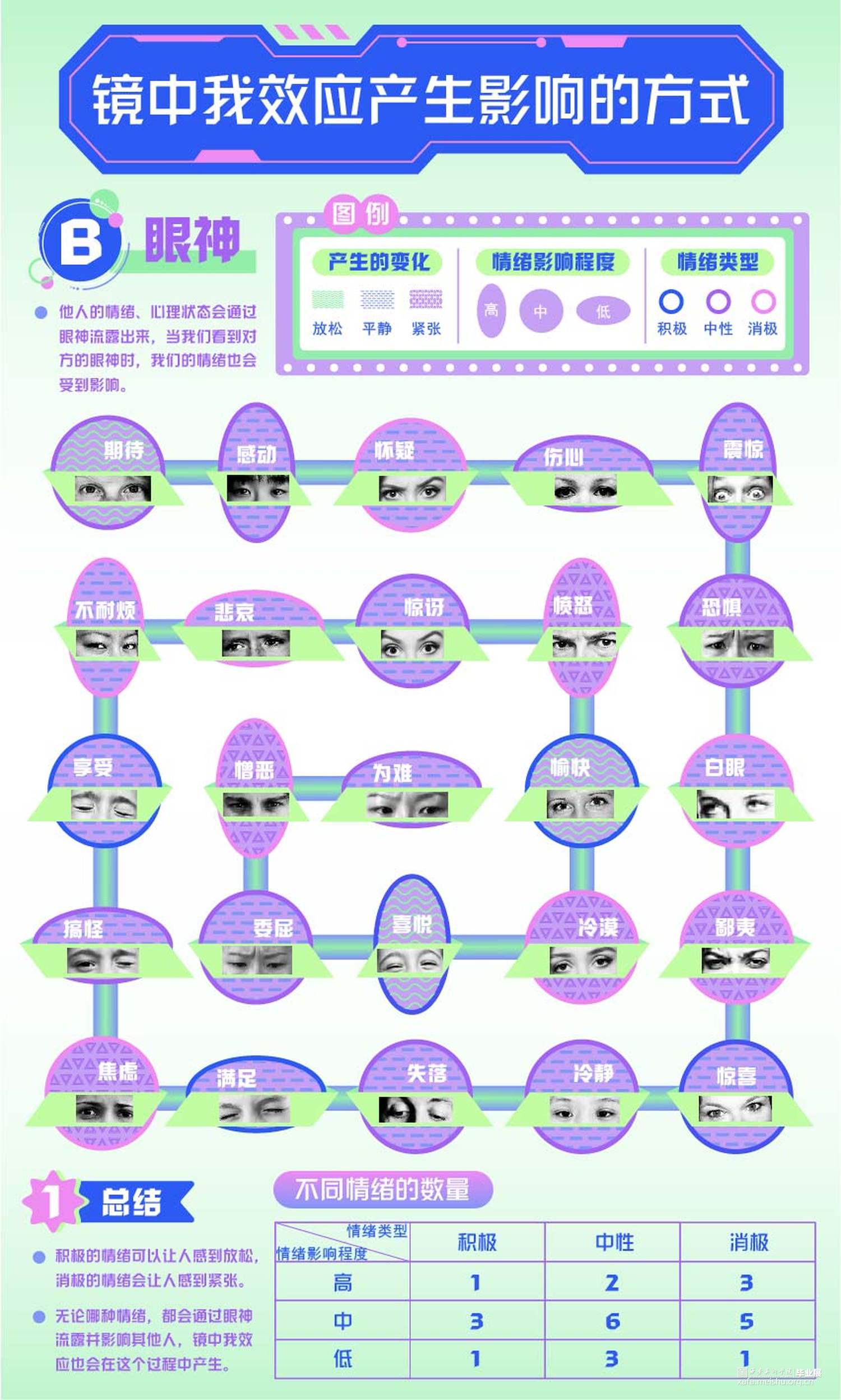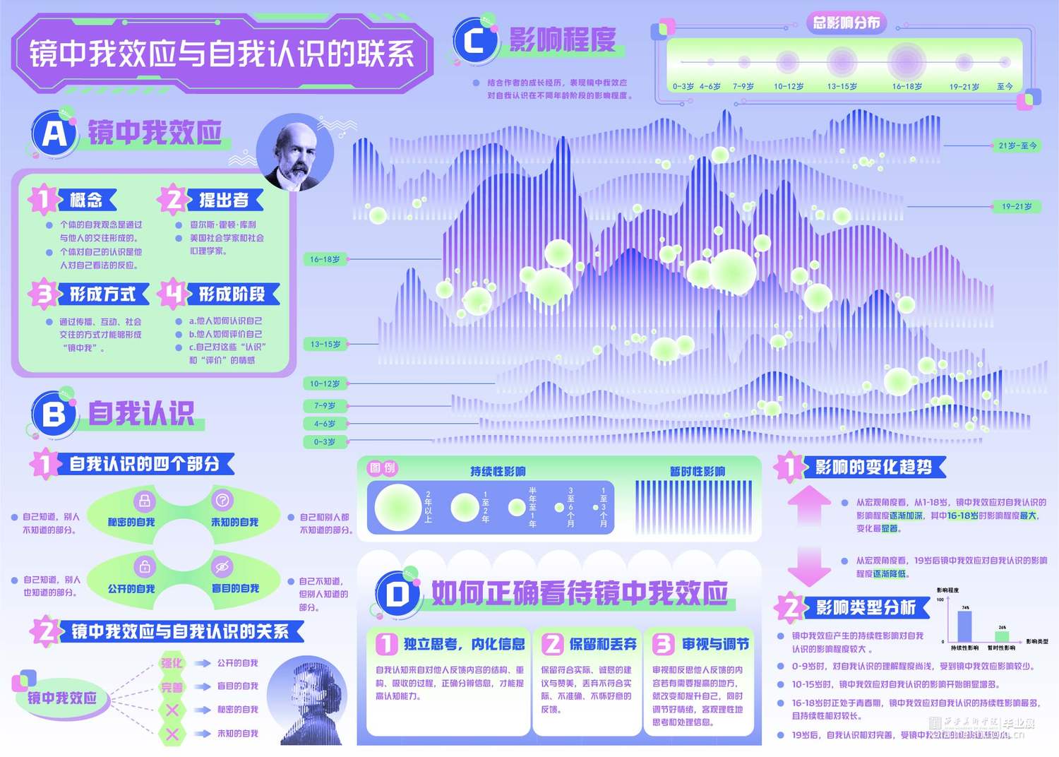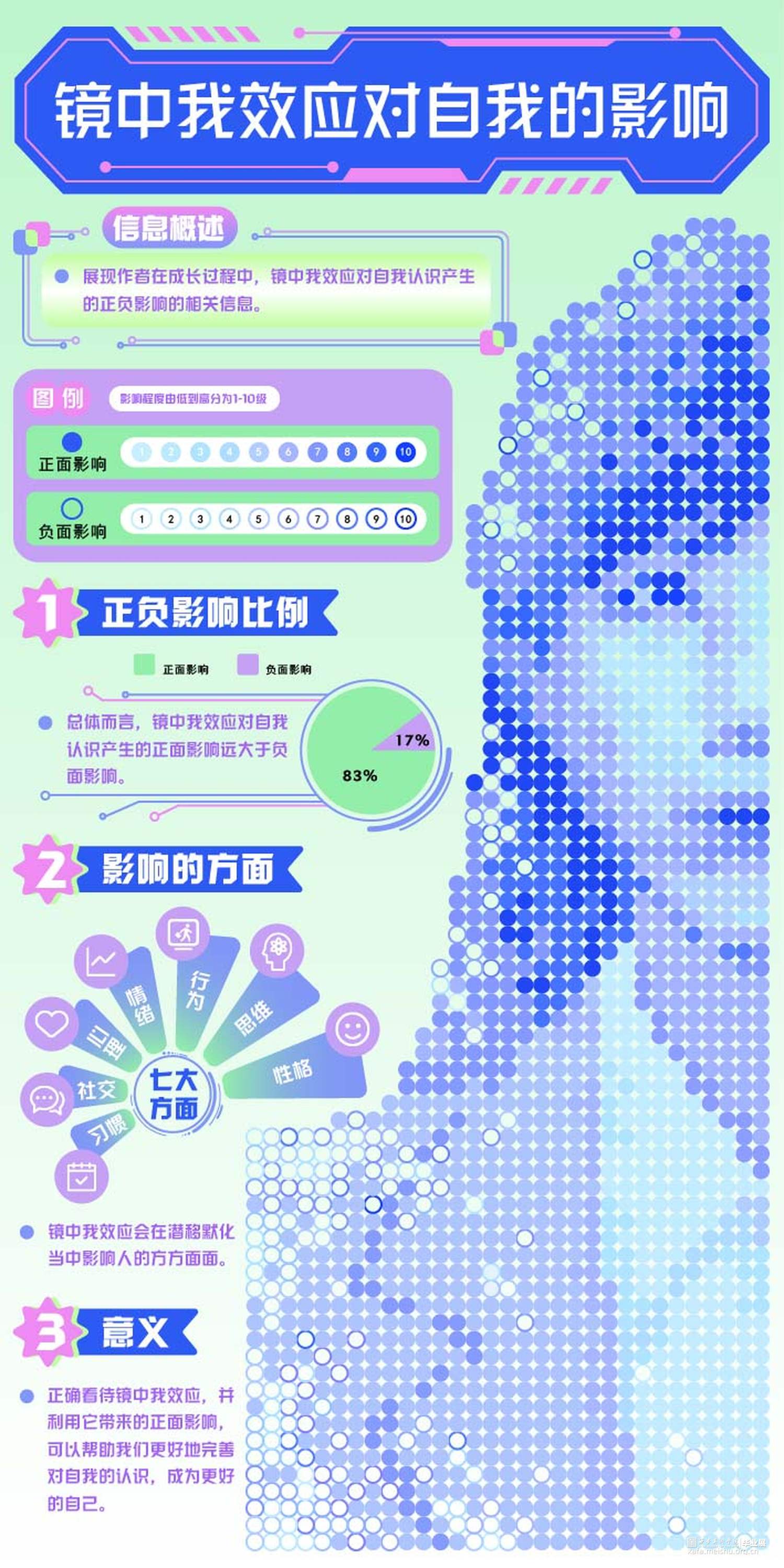作品以“镜中我效应”作为设计和创作的主要内容,重点剖析“镜中我效应”对人产生的影响和带来的应用价值。结合信息设计、动态设计、装置设计等形式进行创作和表达。作品以信息设计为主,将抽象概念转化为直观的视觉语言,希望让更多人了解“镜中我效应”,从中感受和思考它是如何潜移默化地影响和改变一个人的,并能够理性看待、正确利用“镜中我效应”,成为更好的自己。