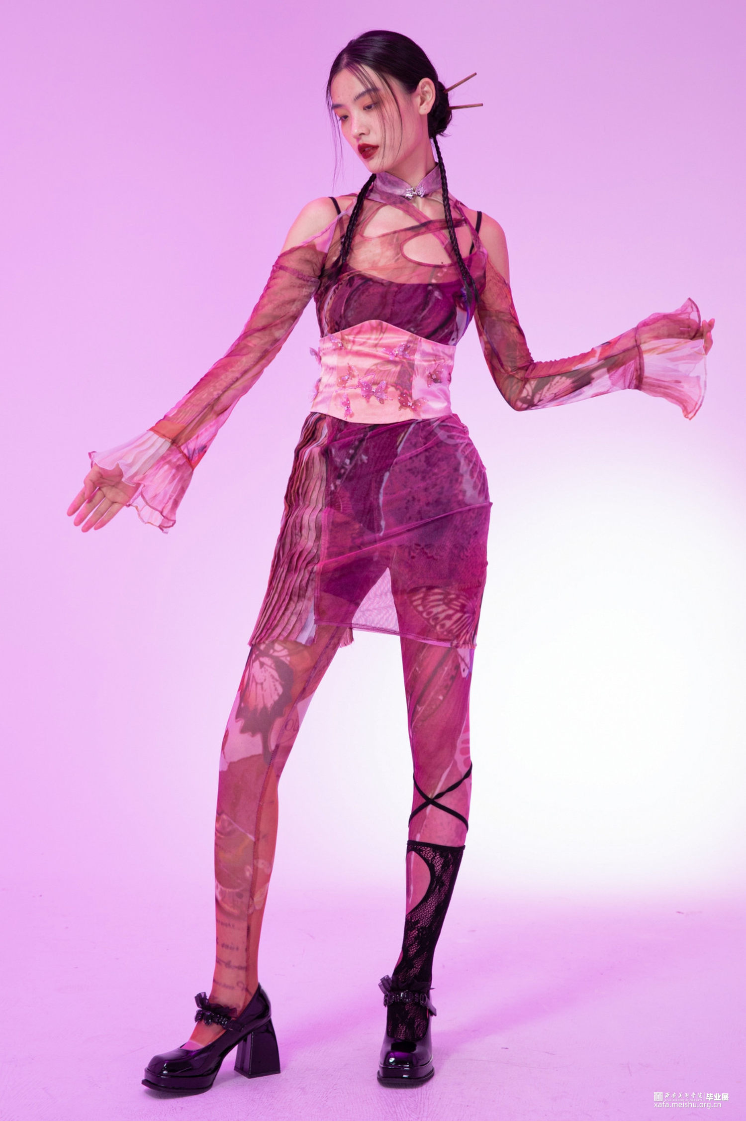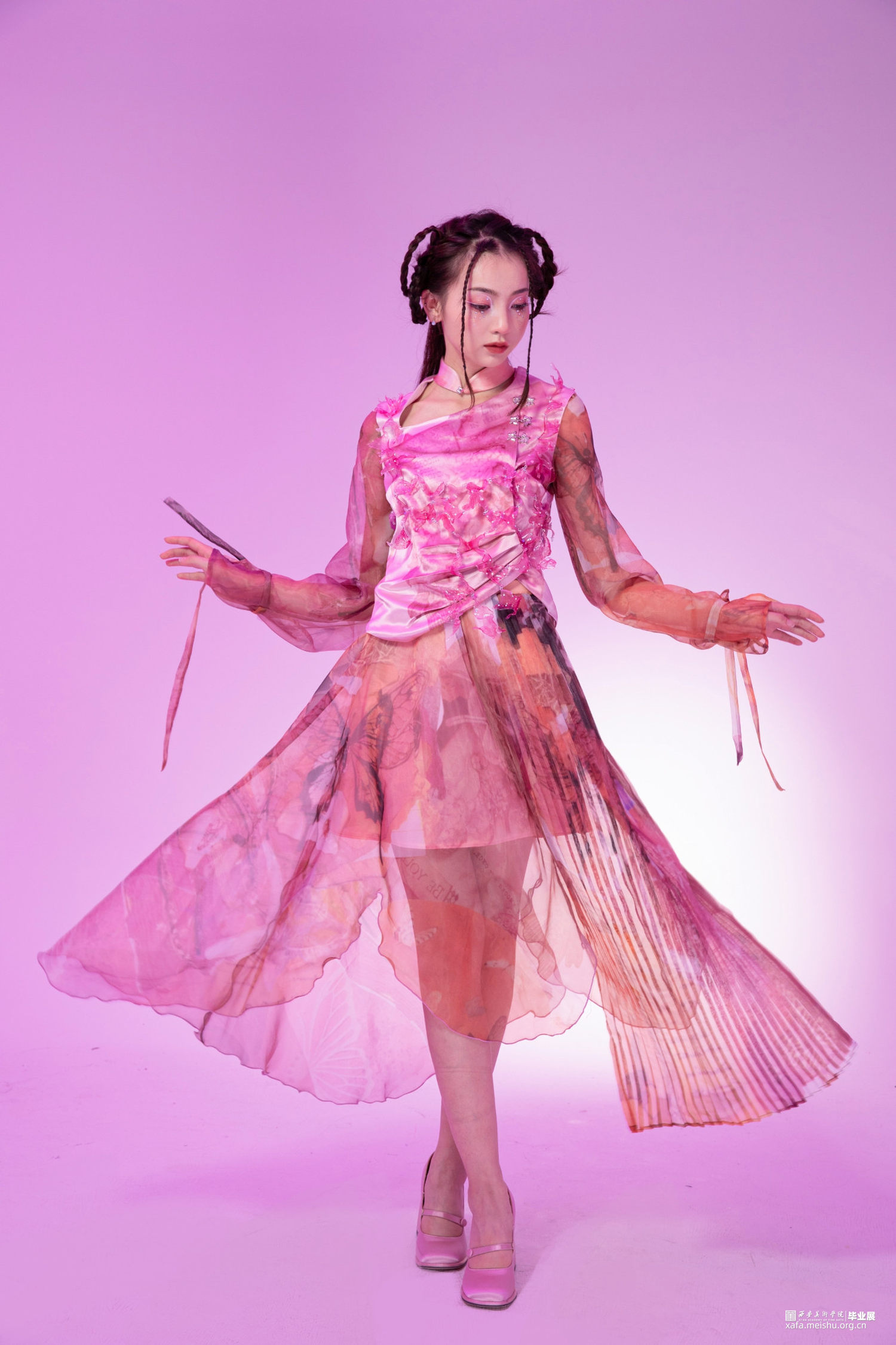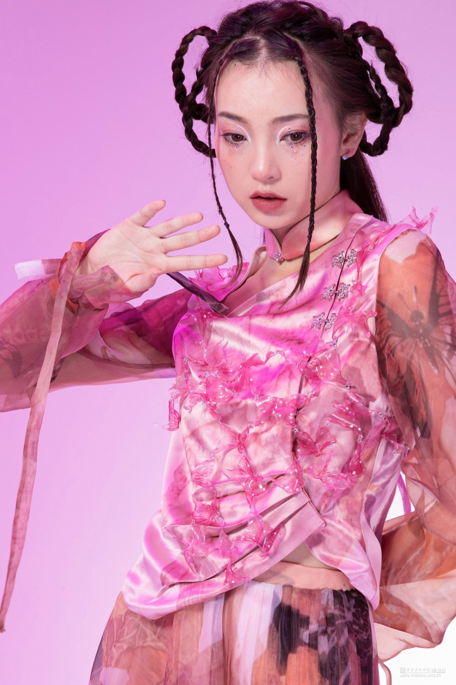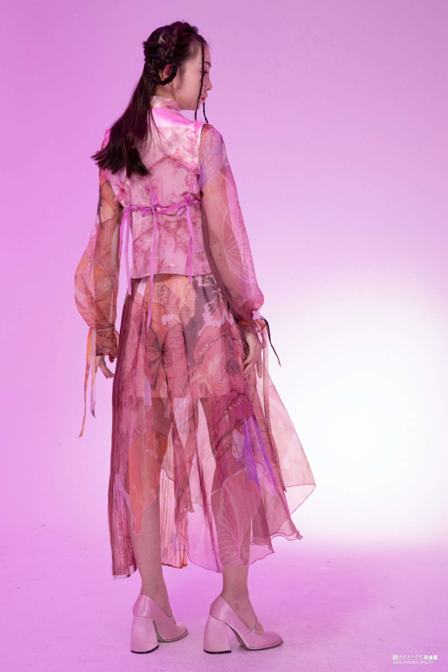 作品选取花卉纹理、镜花水月的意象作为元素提取,将东方洛可可与新中式相融合,色彩上以粉、蓝、白色为主,意在打造少女与浪漫的风格。印花图案从庄周梦蝶的故事出发结合传统国画和,用花朵、蝴蝶和手绘图案组成,意在表现虚幻与真实的结合。
