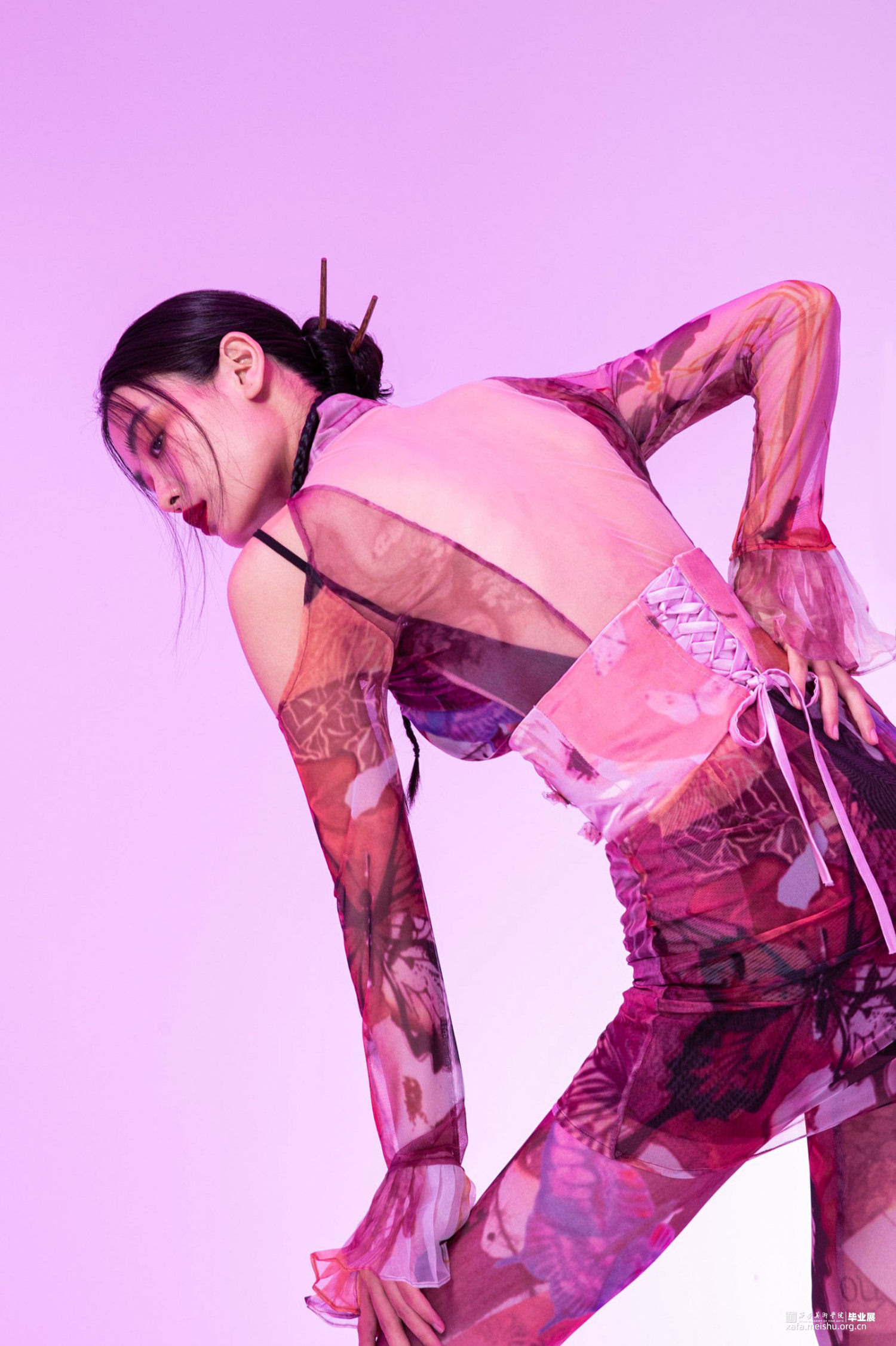 从庄周的浪漫主义、无为、逍遥的思想到其本质对于世间万物的深刻思考,深入浅出地用“梦蝶”提出对世界不确定性的设问。我们从对中式传统服装的研究,选取花卉纹理、镜花水月的意象作为元素提取,希望用camp style诠释“东方女孩,穿我想穿”的概念。