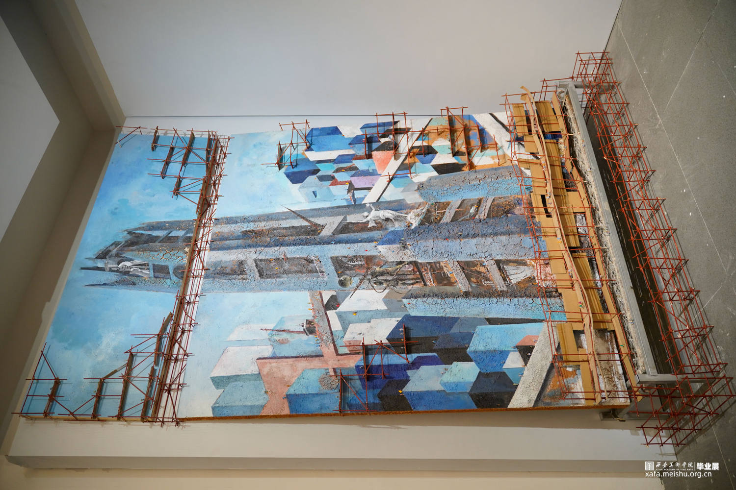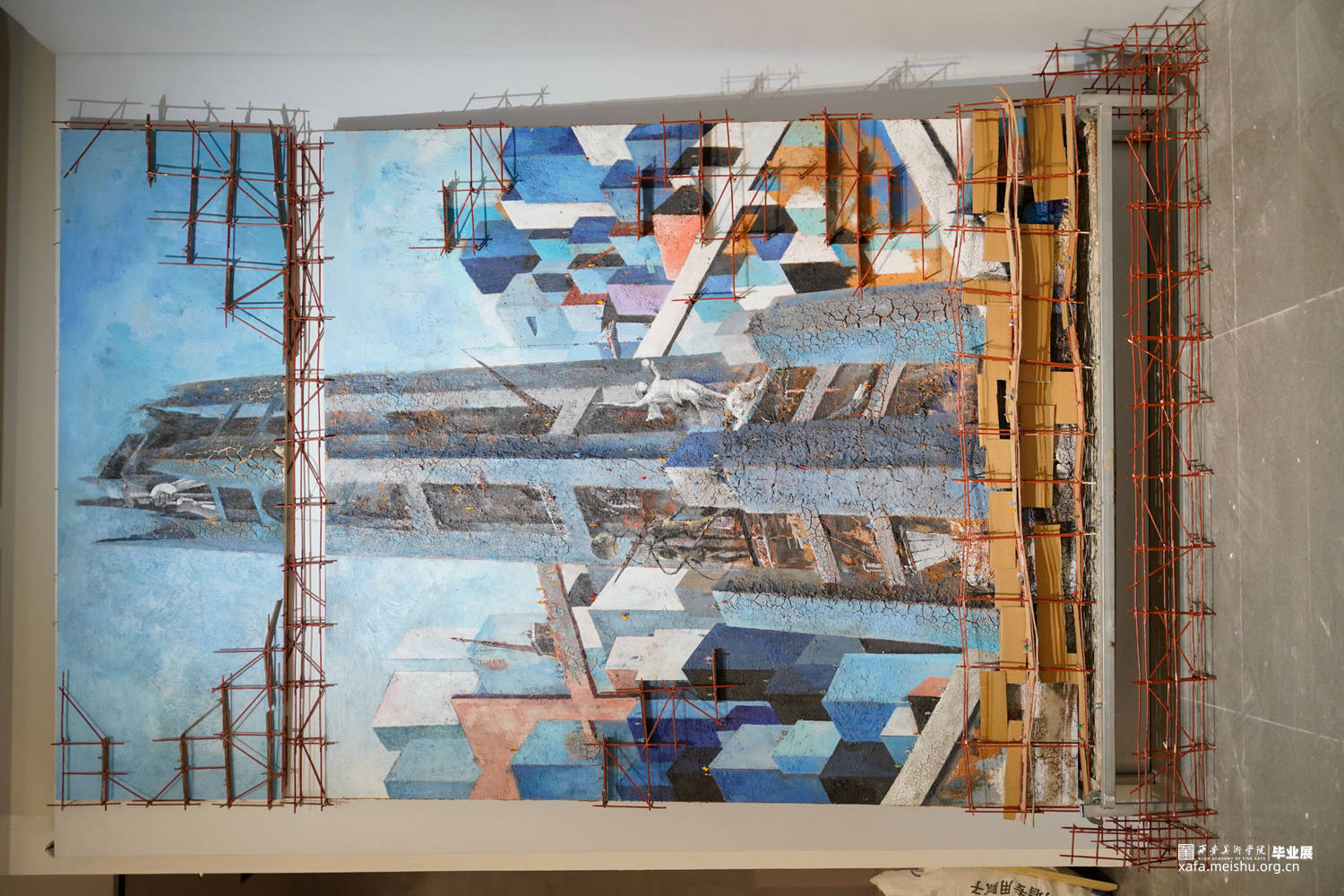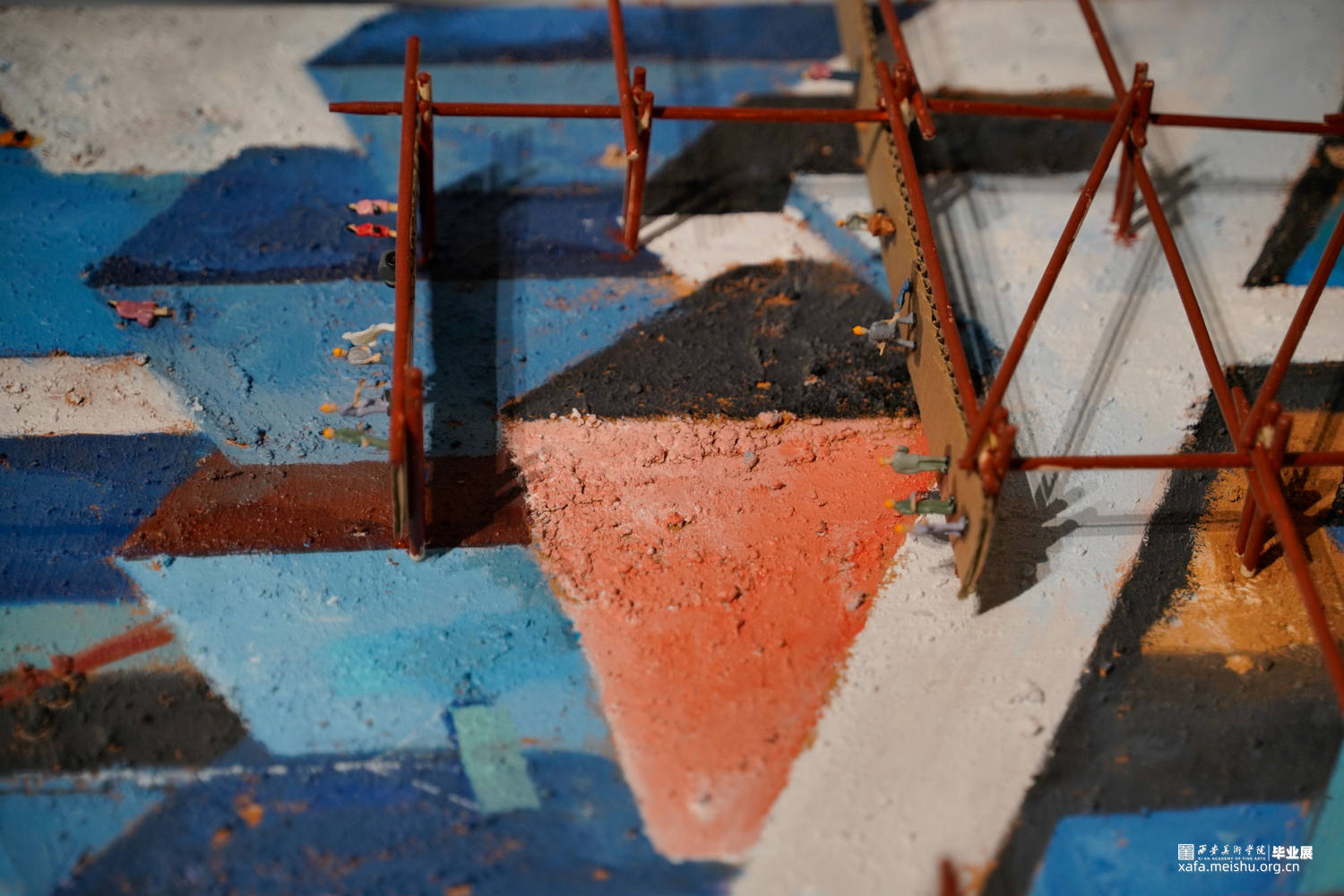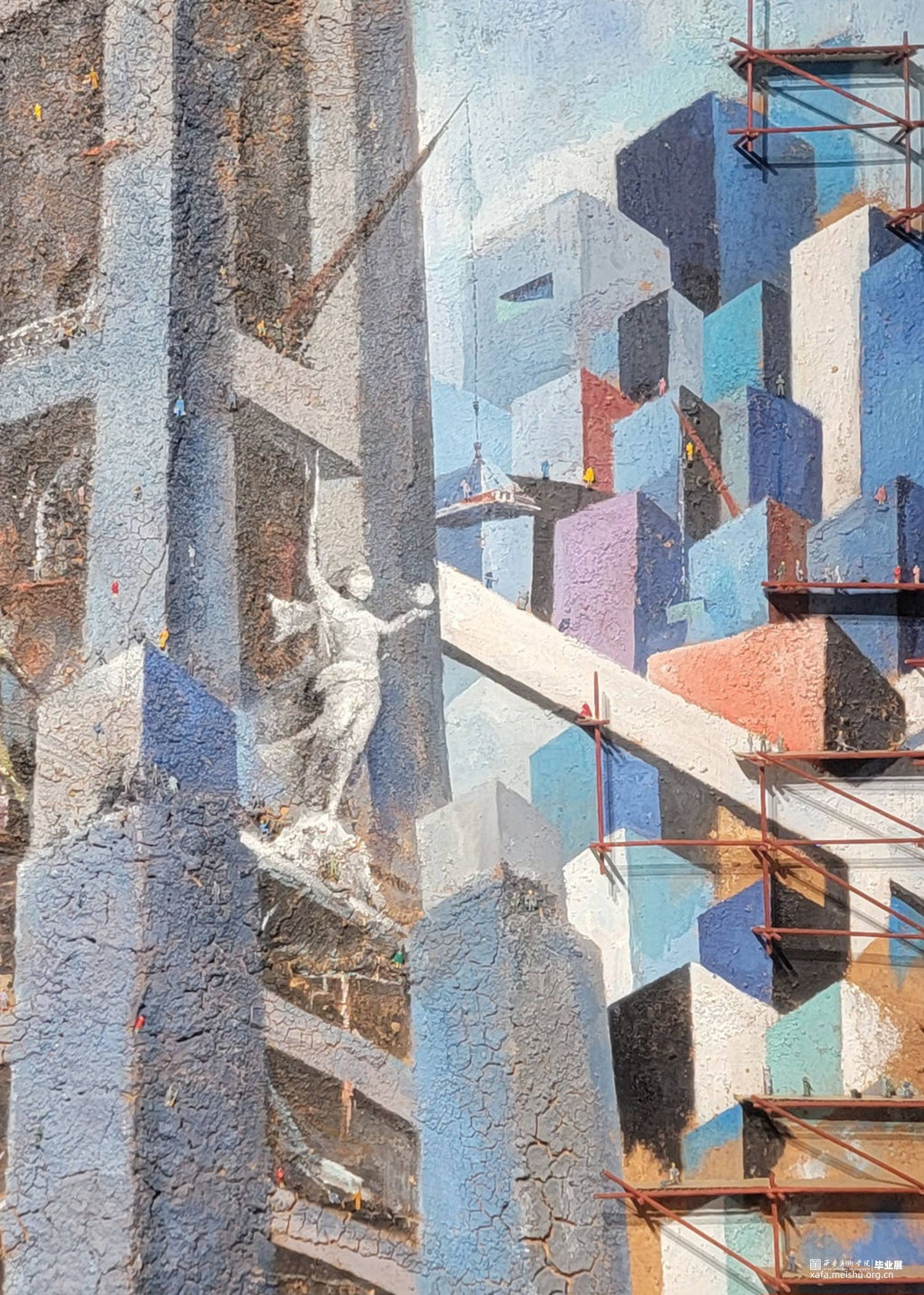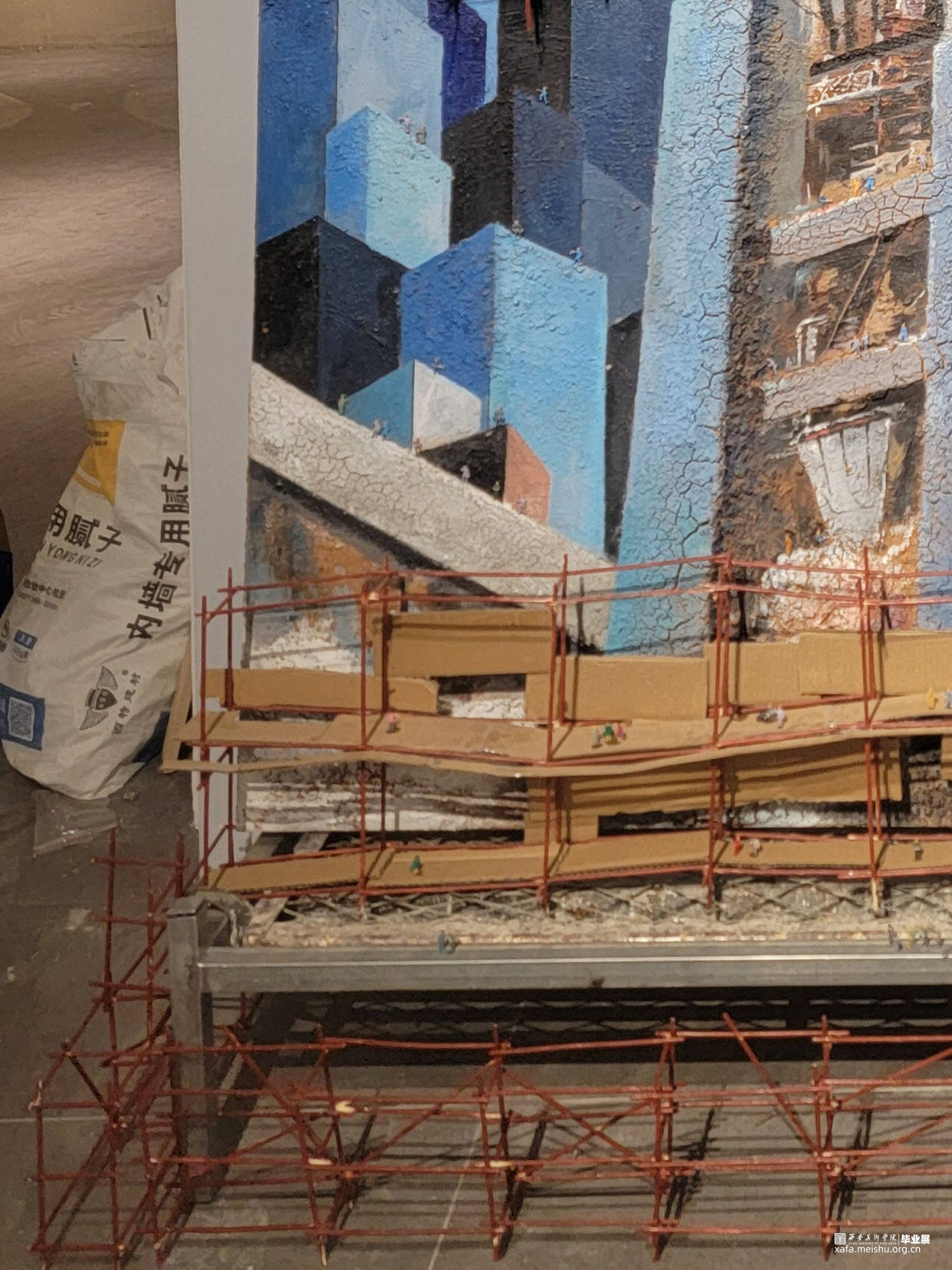 整个作品构成了一个“纪念碑”的形态,我希望在作品中突出“未完成”的状态。作品分为两个部分,第一为画内工人在建设属于自己的纪念碑。第二为画外工人在建设这幅画,即“我们正在看工人在建设自己在建设纪念碑的作品”。这个作品想要去批判性的探讨“歌颂”这一行为。生活在光鲜亮丽的城市中的人们歌颂工人,将工人视为伟大的人,而工人到底是为谁建造?我希望这个作品能够让观众感受到工人的强大力量和对他们遭遇的同情,以及我们对未来的“乌托邦”式的想象。