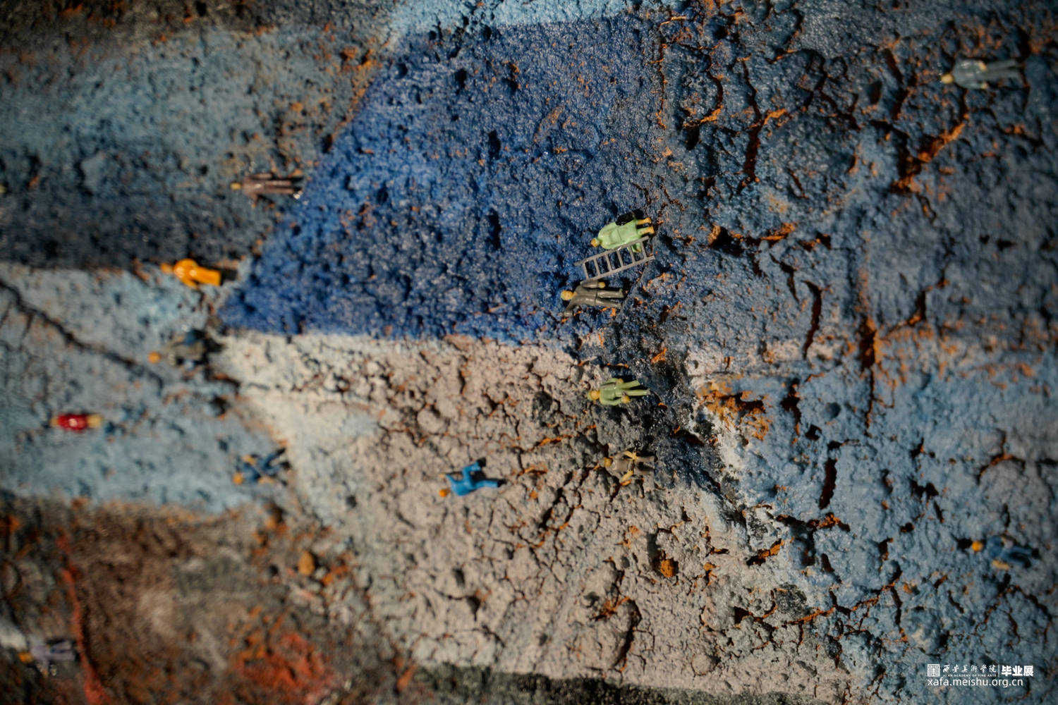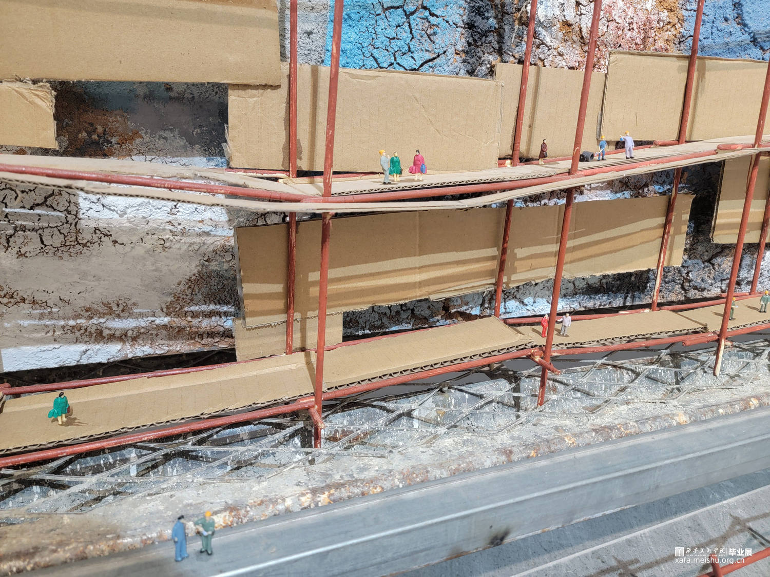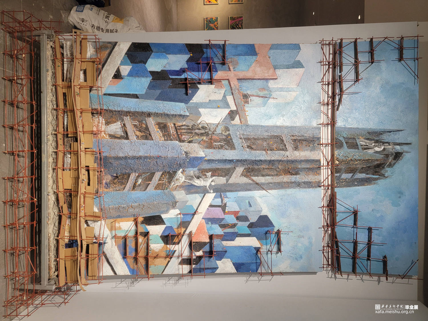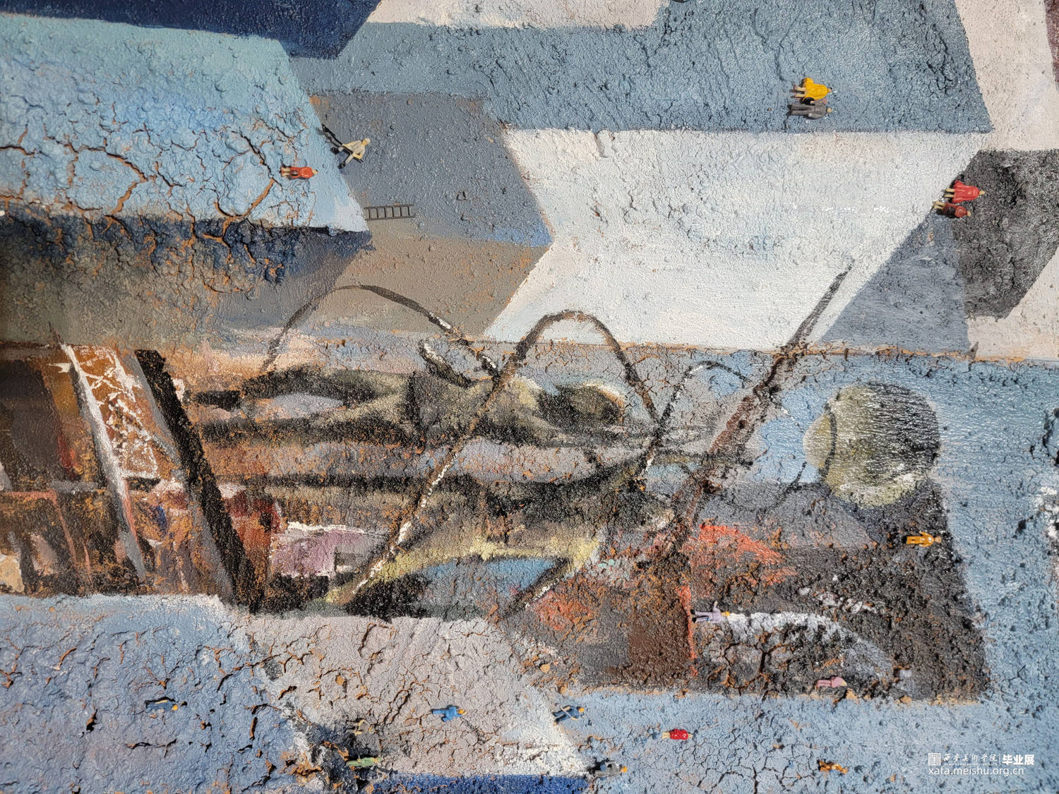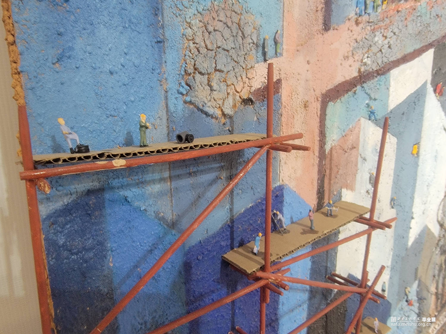 整个作品构成了一个“纪念碑”的形态,我希望在作品中突出“未完成”的状态。作品分为两个部分,第一为画内工人在建设属于自己的纪念碑。第二为画外工人在建设这幅画,即“我们正在看工人在建设自己在建设纪念碑的作品”。这个作品想要去批判性的探讨“歌颂”这一行为。生活在光鲜亮丽的城市中的人们歌颂工人,将工人视为伟大的人,而工人到底是为谁建造?我希望这个作品能够让观众感受到工人的强大力量和对他们遭遇的同情,以及我们对未来的“乌托邦”式的想象。