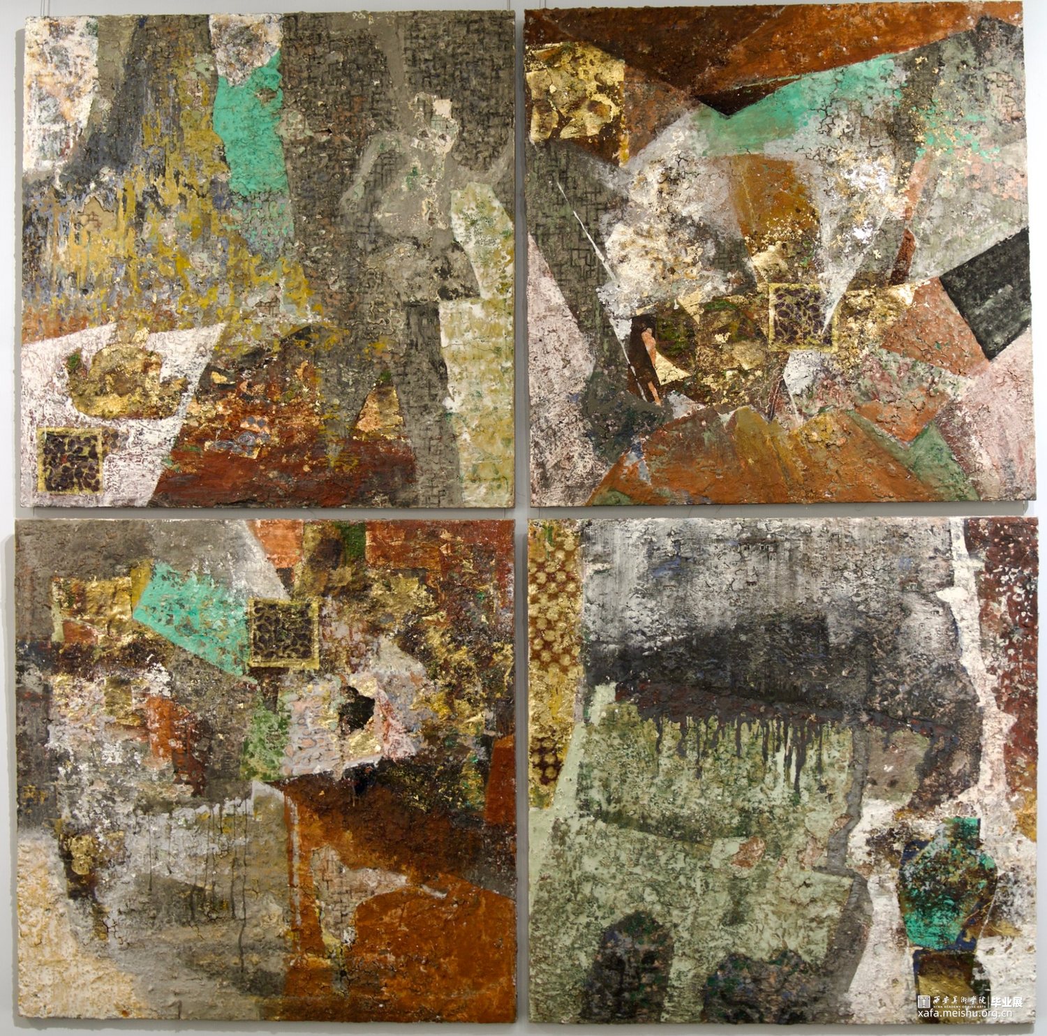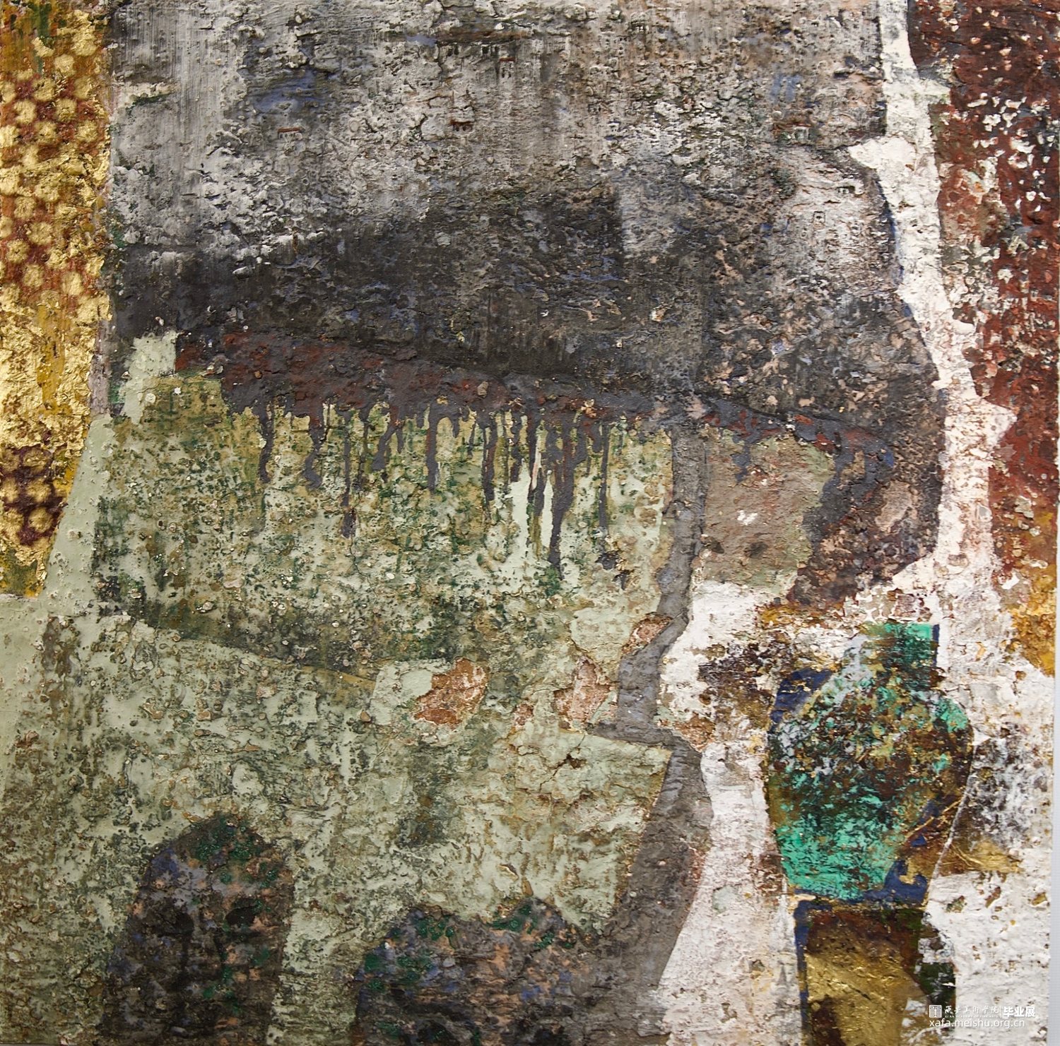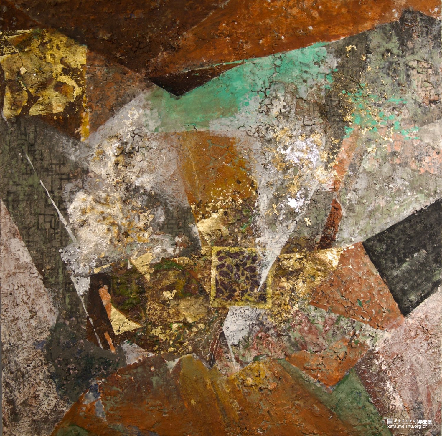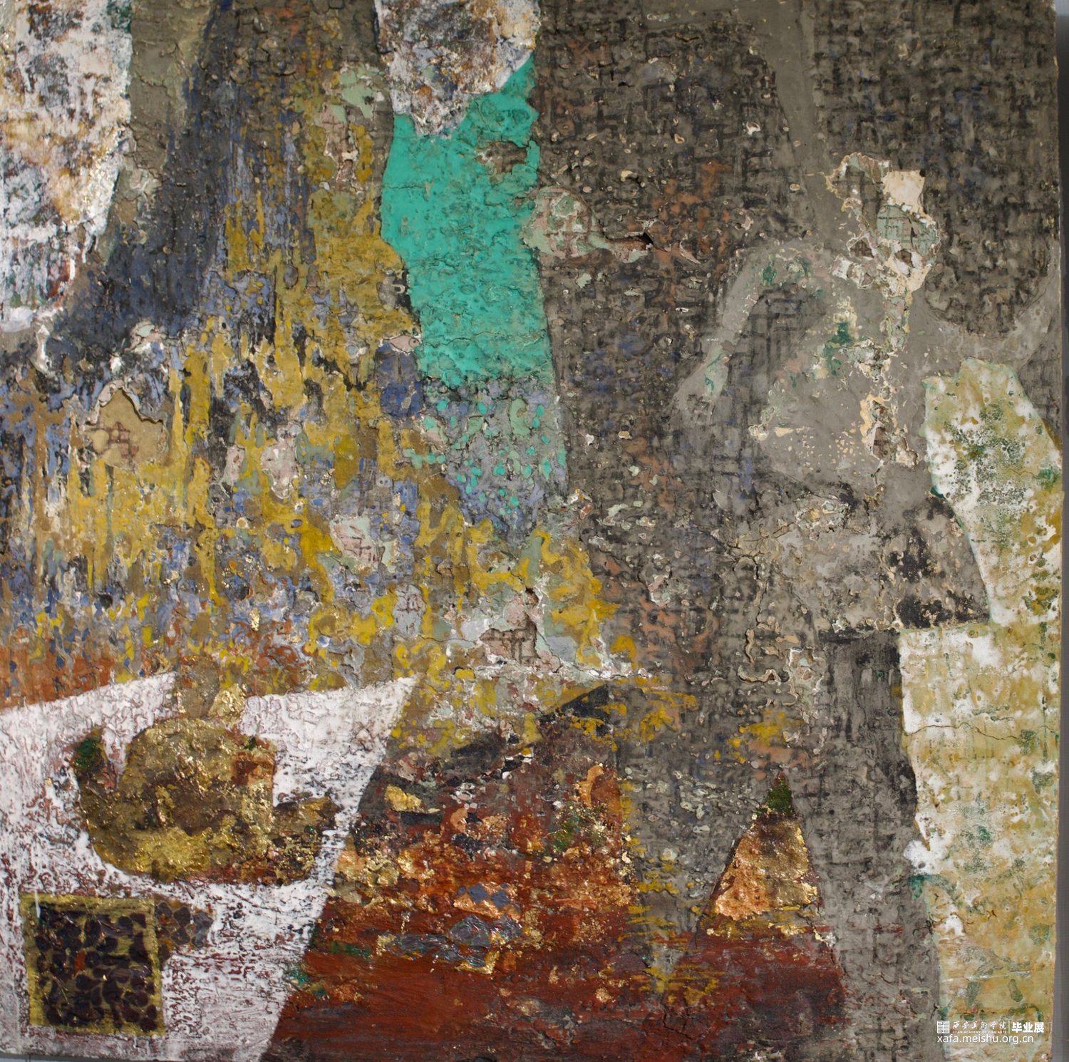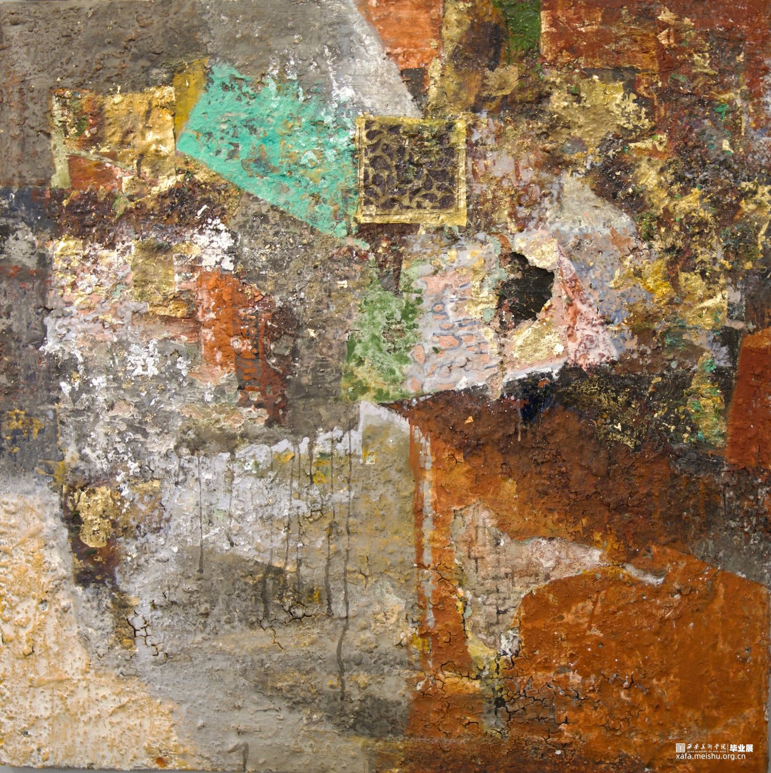作品《观傩》源于我对家乡古老而神秘的巫傩文化的深厚兴趣,我通过将巫傩文化中的图腾、仪式、舞蹈与祭祀等元素进行抽象化处理,在丰富的泥质底层上呈现出一种如岁月沉积般厚重斑驳的肌理效果。线条和色块的交织恰如巫傩仪式中的舞蹈动作一般,充满韵律与随机性,既有规律可循,又充满不可预测的神秘气息。作为中华民族多元一体格局中独具特色的地域文化之一,巫傩文化丰富的内涵和独特的形式吸引着我在不断的尝试中探索其与现代艺术表达的融合。