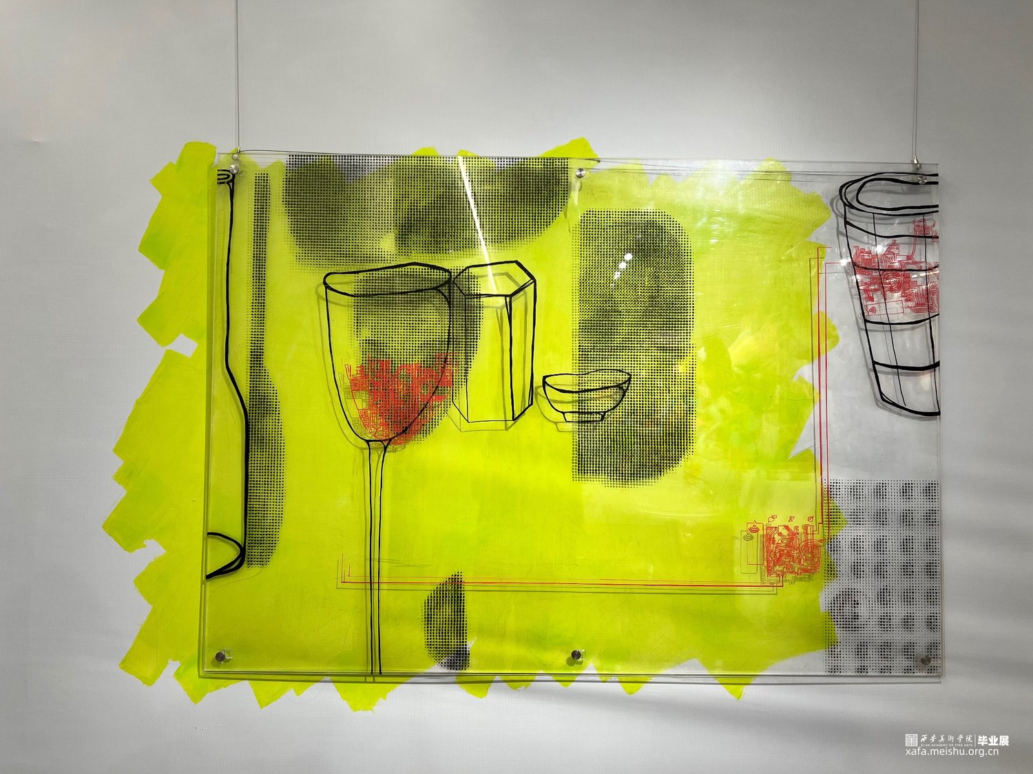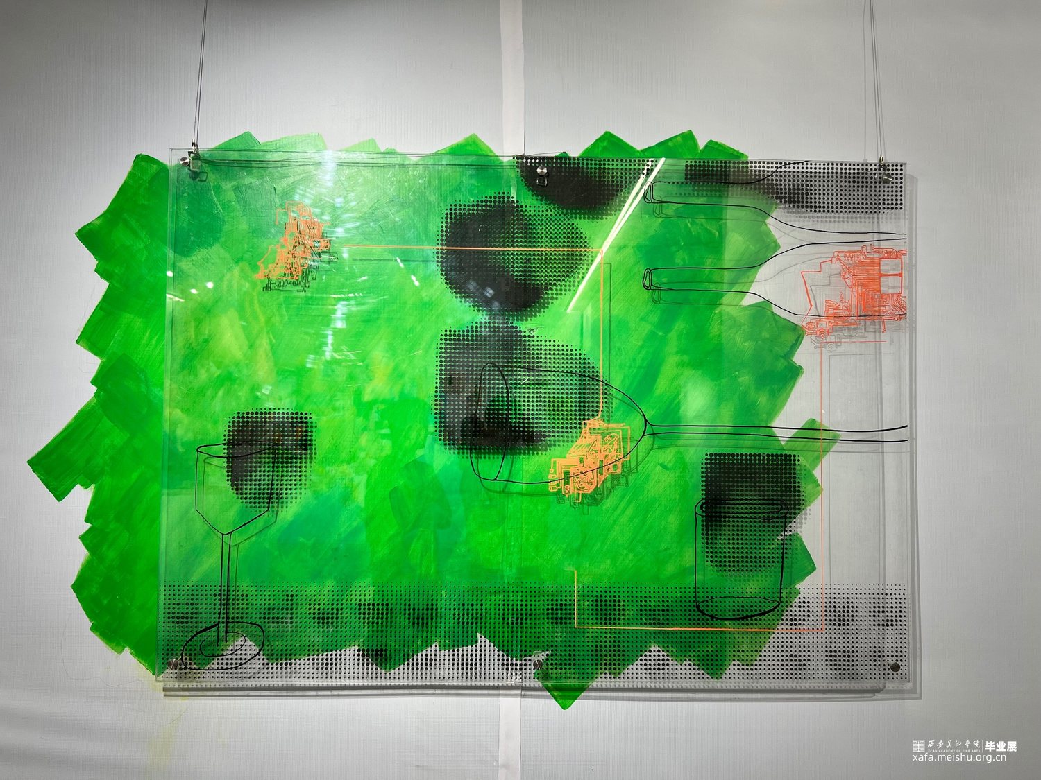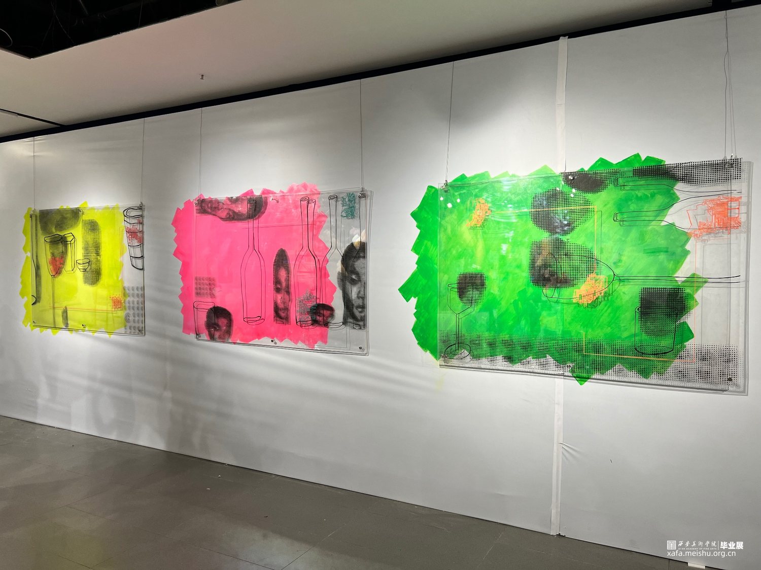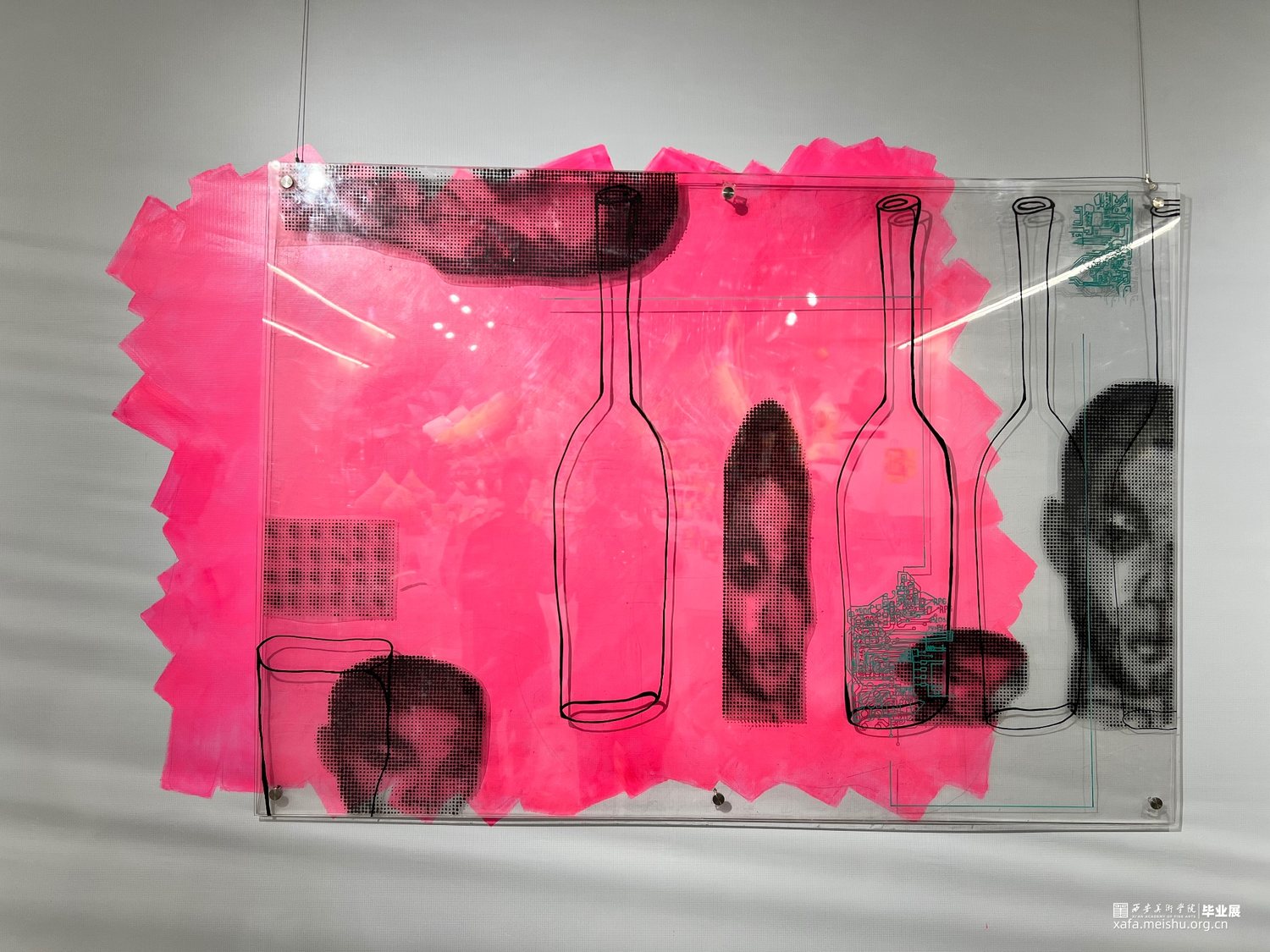 本作品在多层亚克力板上用手绘的方式将人物波点化,扭曲化,意在表达虚拟现实社交的多层次性,虚拟性,模糊性。