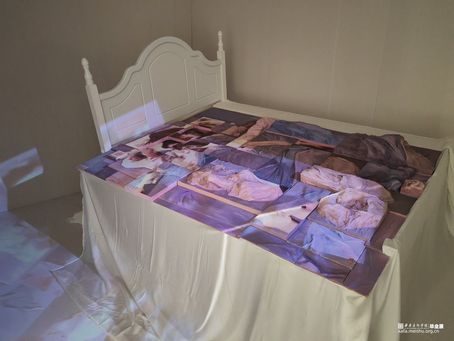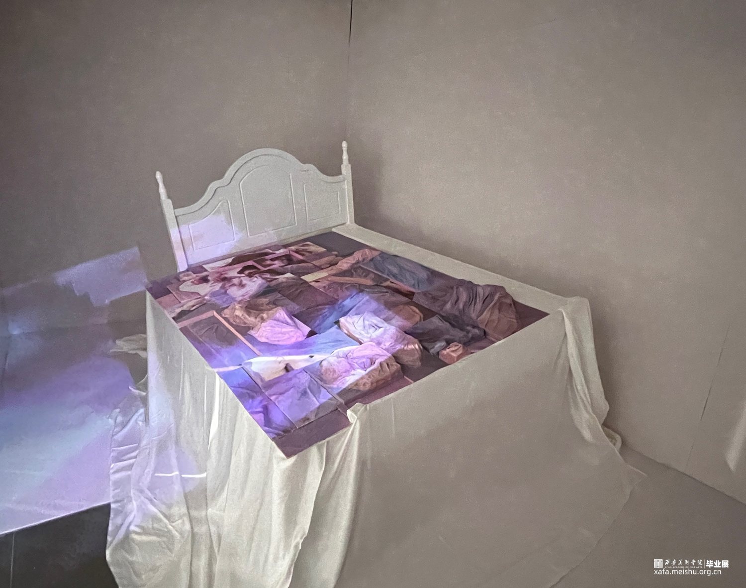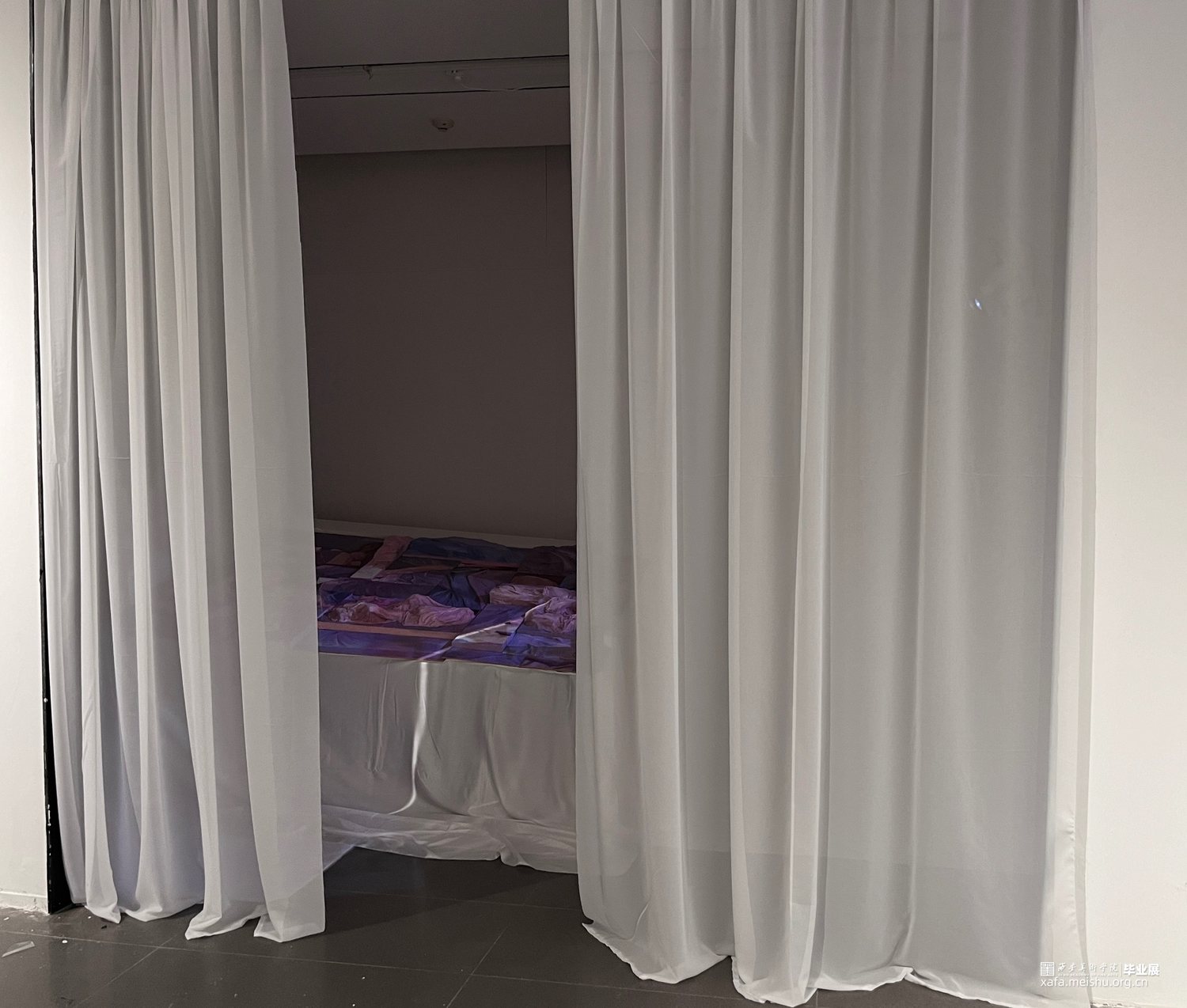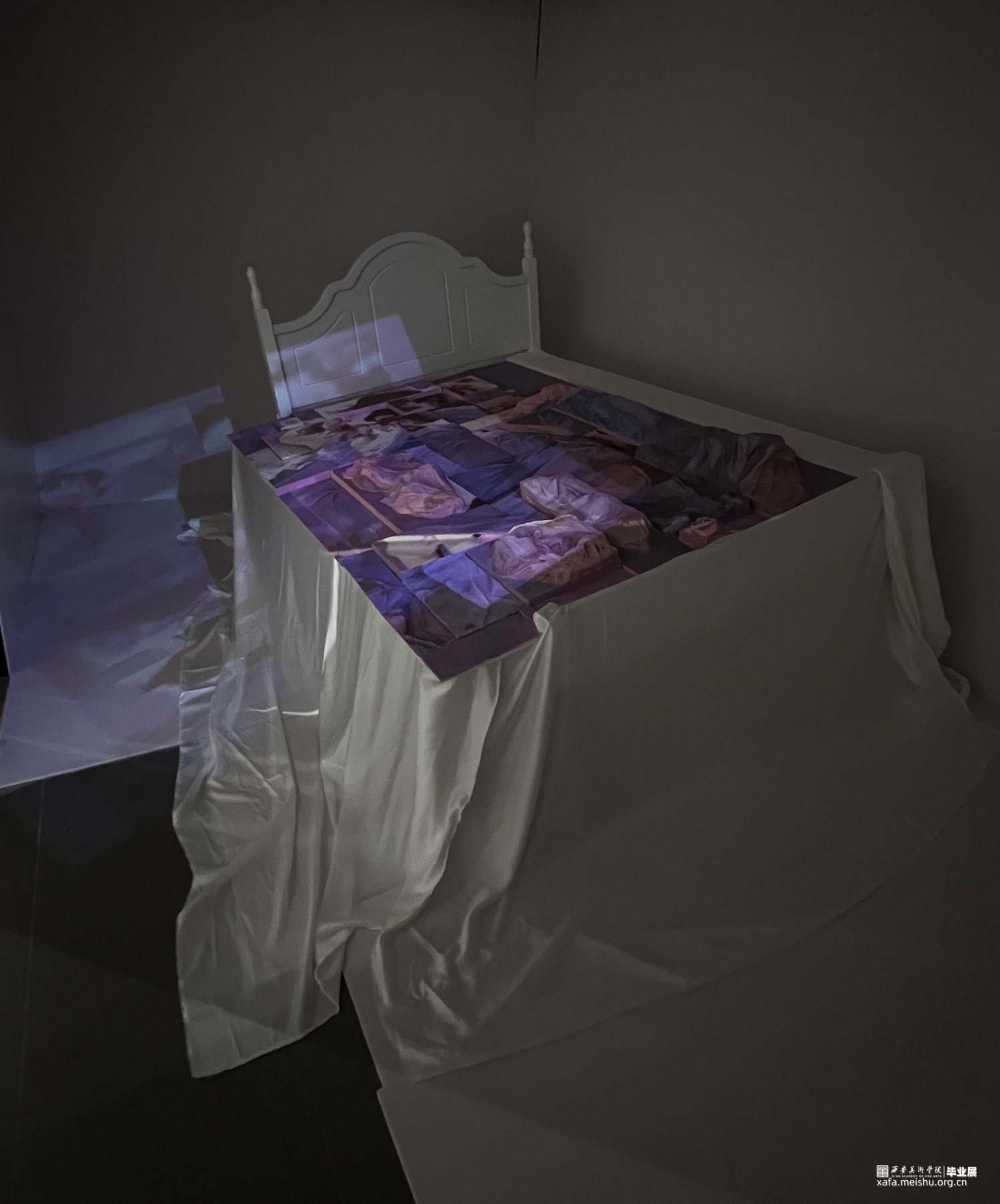 《流绪微梦》是一件综合材料装置艺术作品。该作品以作者个人长期失眠的真实经历为创作灵感,将失眠者的内心状态以多重视角和画面切割拼接的方式具象化。 象征着失眠者身处舒适的梦幻空间,但思维错乱而活跃,无法入睡,身体与心灵在煎熬中变得脆弱,用一张倾斜的床来承接。飘忽流动的思维,细微的梦境,思绪如水流得缝过,微眠无法入梦,表达失眠时意识错乱时间模糊以及身体的不适。