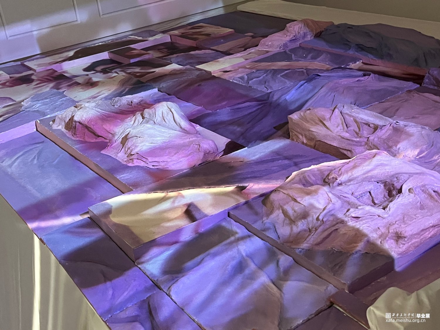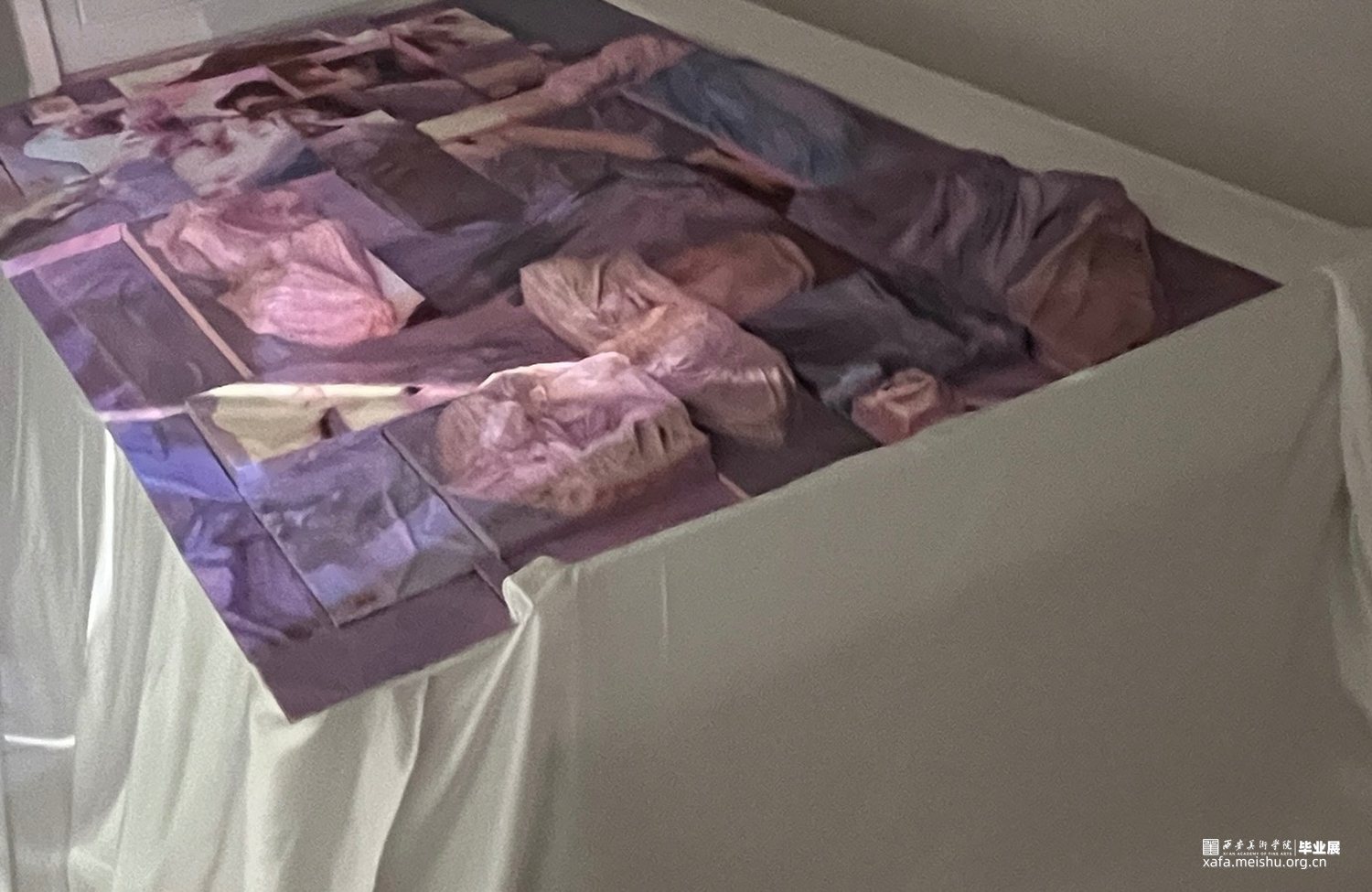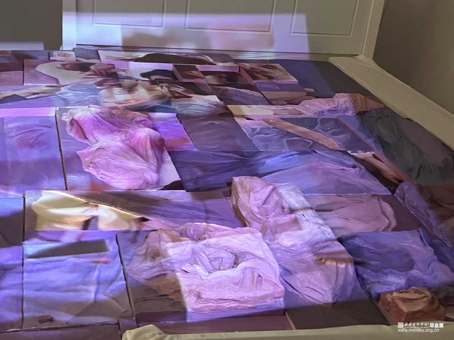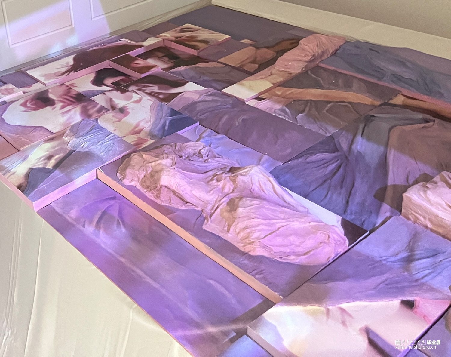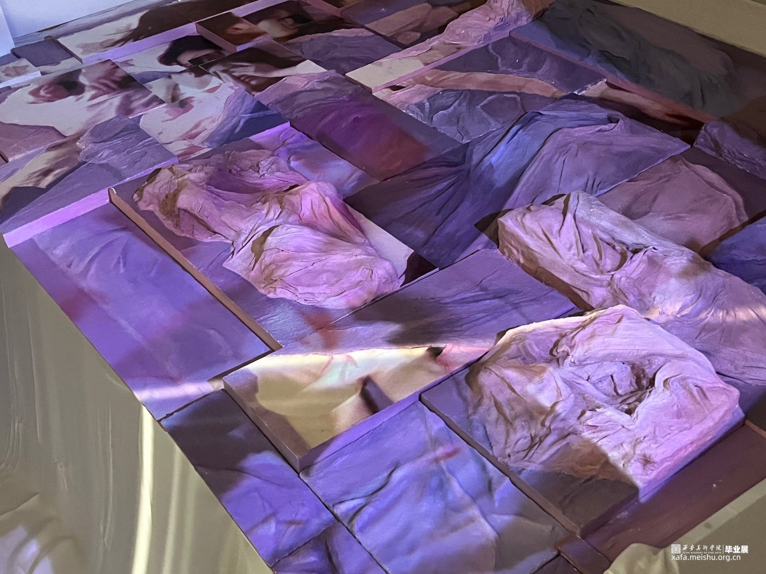 《流绪微梦》是一件综合材料装置艺术作品。该作品以作者个人长期失眠的真实经历为创作灵感,将失眠者的内心状态以多重视角和画面切割拼接的方式具象化。 象征着失眠者身处舒适的梦幻空间,但思维错乱而活跃,无法入睡,身体与心灵在煎熬中变得脆弱,用一张倾斜的床来承接。飘忽流动的思维,细微的梦境,思绪如水流得缝过,微眠无法入梦,表达失眠时意识错乱时间模糊以及身体的不适。