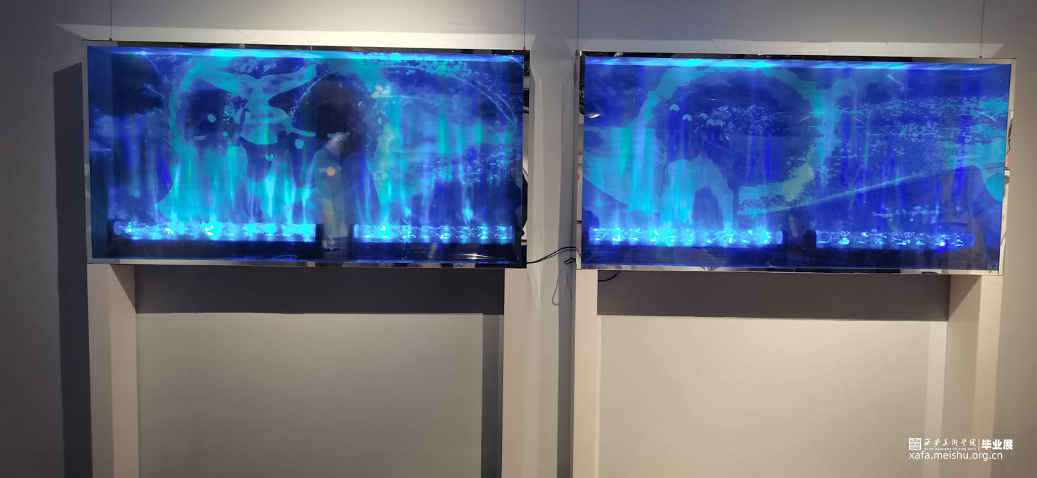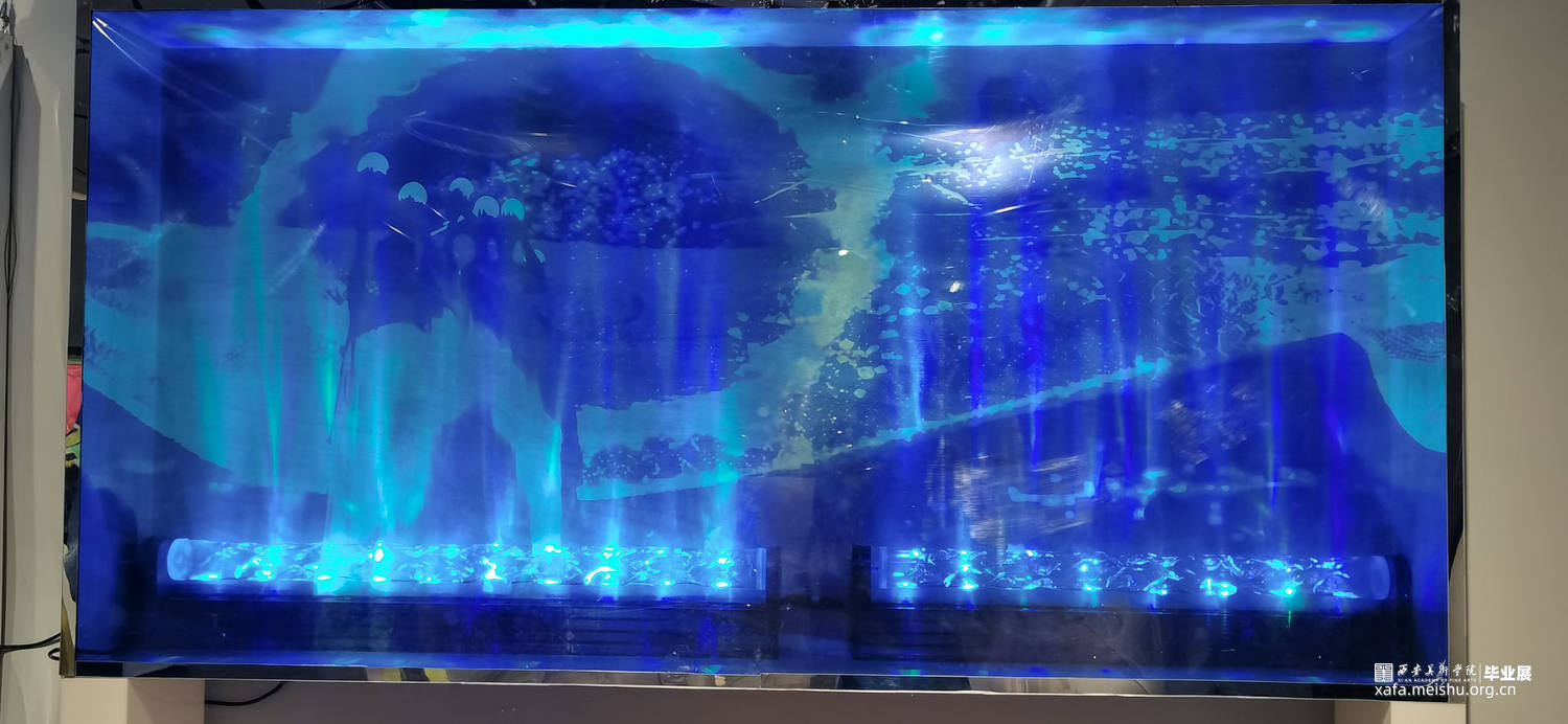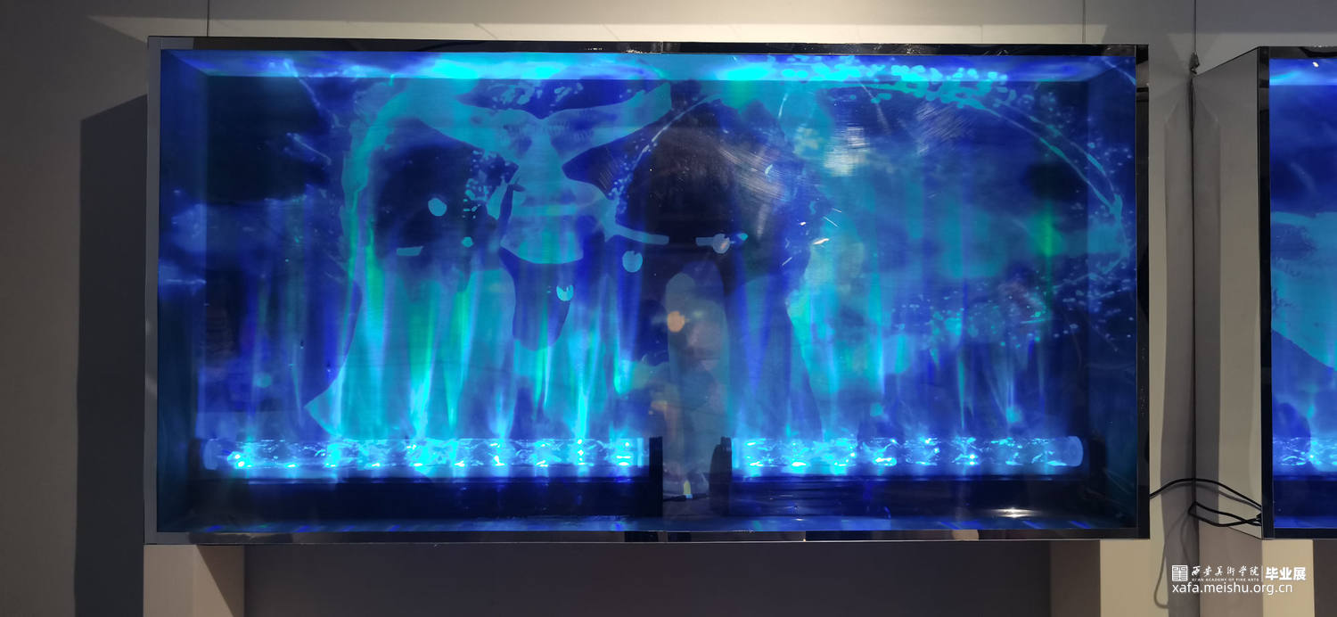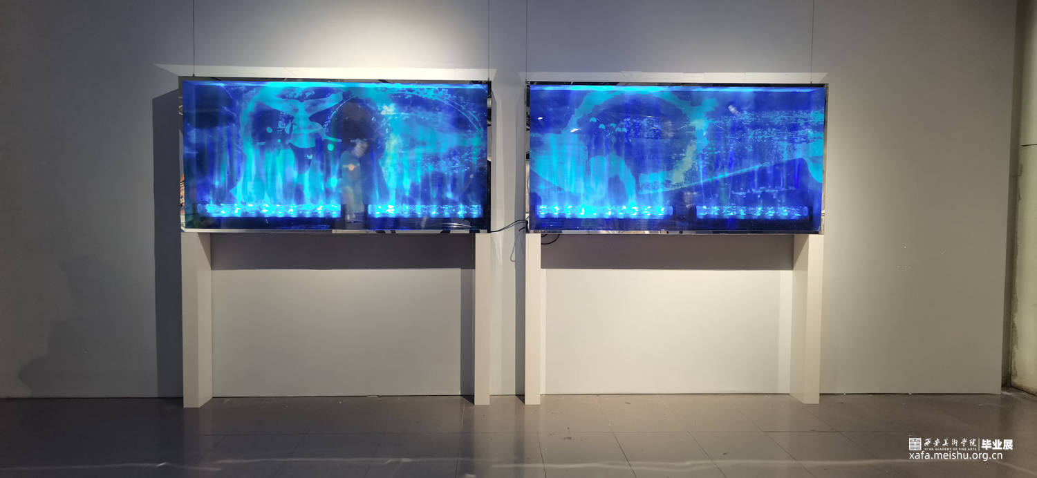 生命是永恒的,不断延续的。一鲸落,万物生。鲸鱼坠落深海的同时也庇护了海洋的“生命”。这组装置表现的是鲸鱼坠落前濒死的幻觉,是一个生命的落幕,也是一群生命的新生。