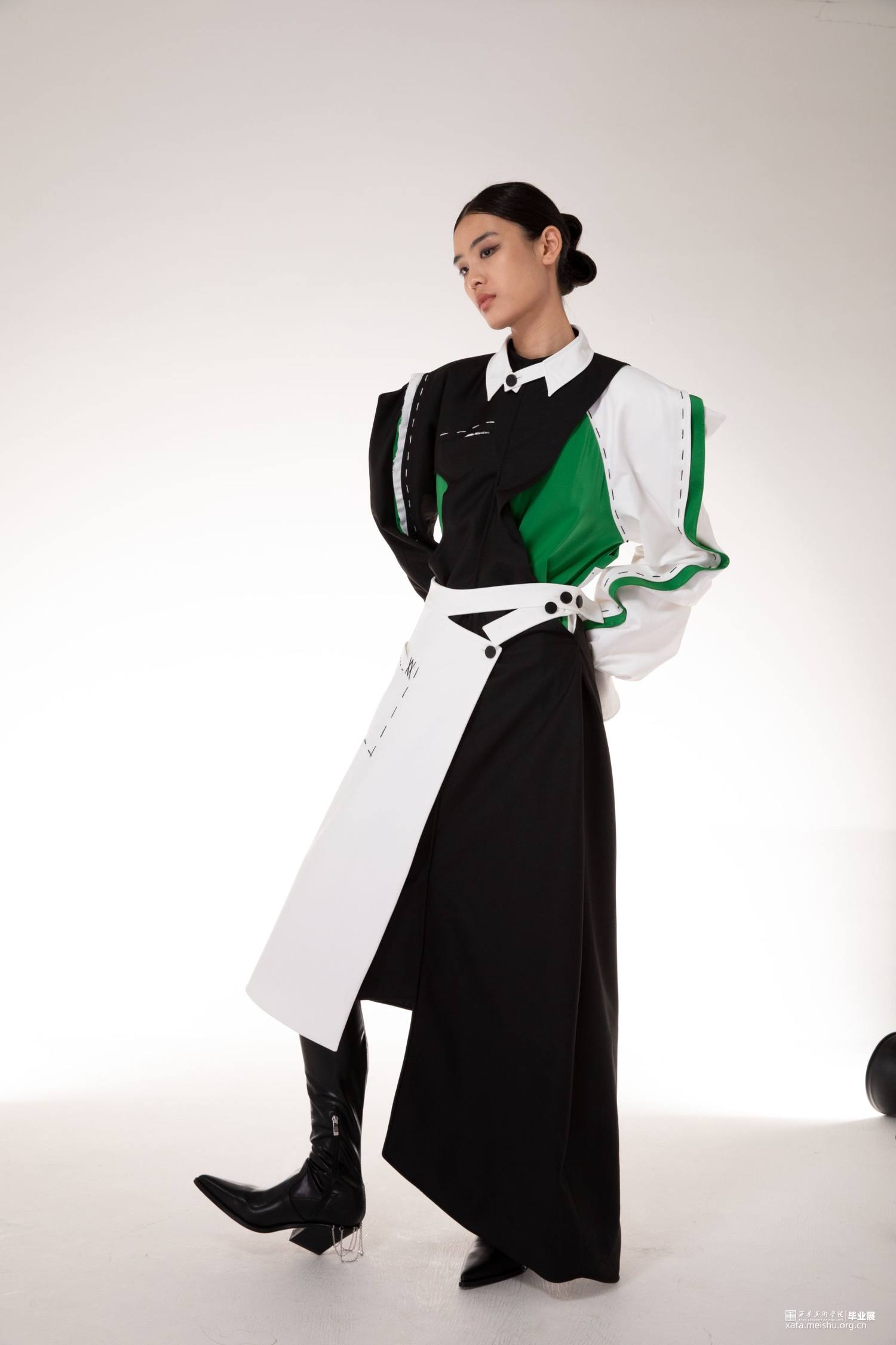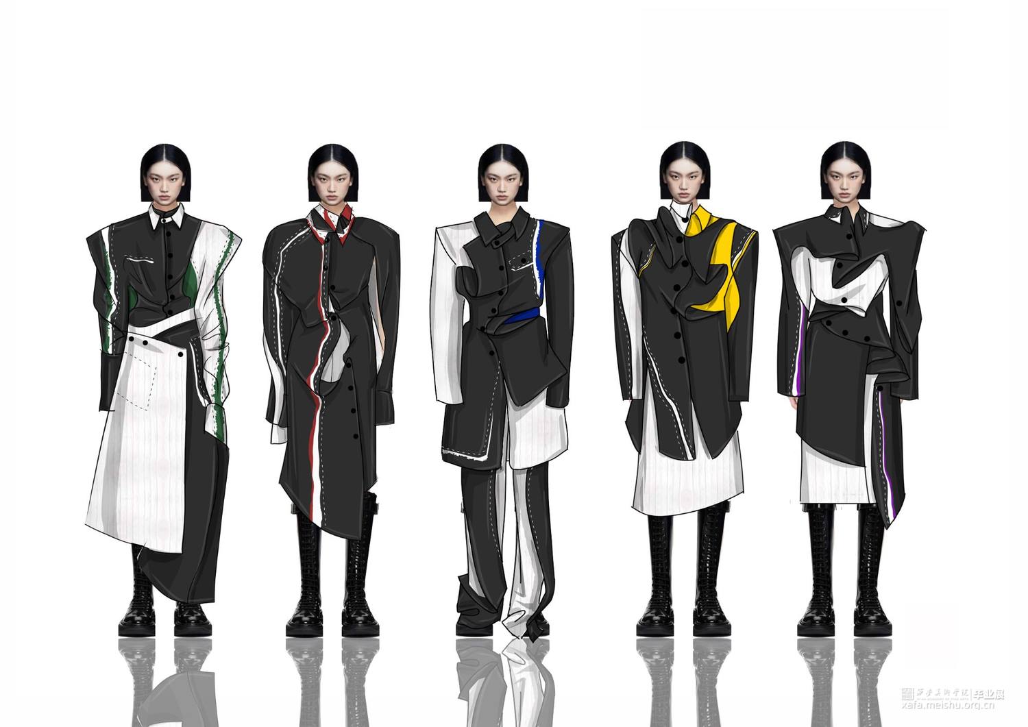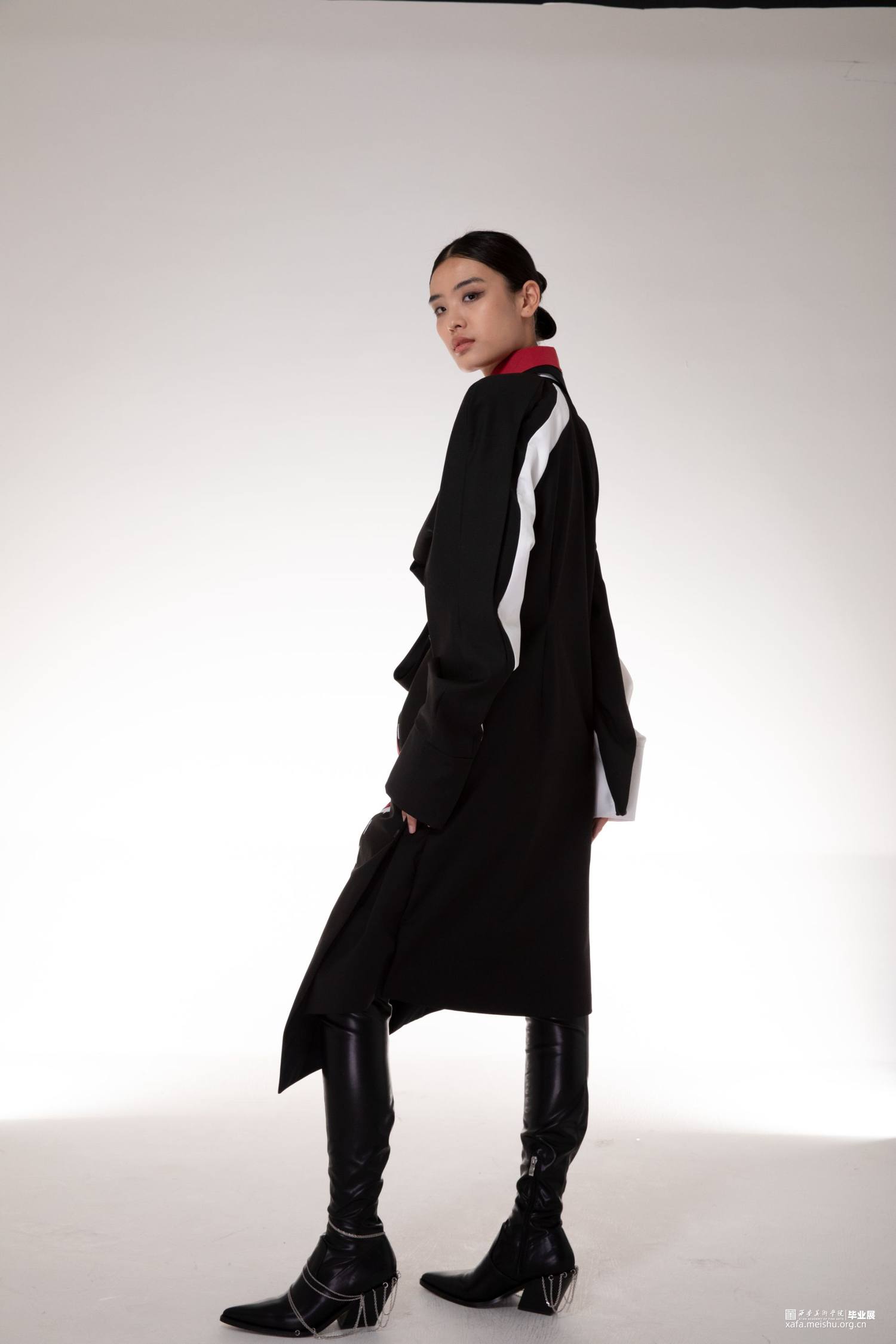 整个系列服装通过对西装、衬衫等进行解构,将衣服的内部结构各组零件分解再进行重新的组合,部分衣片表现出脱落起伏,再加上明线设计,整体服装反常和未完全的状态,从而表达对束缚的挣脱。在服装的色彩选择上,选用大面积黑白和少量的彩色将其表现出颜色的碰撞,从而表达出挣脱束缚后的希望。