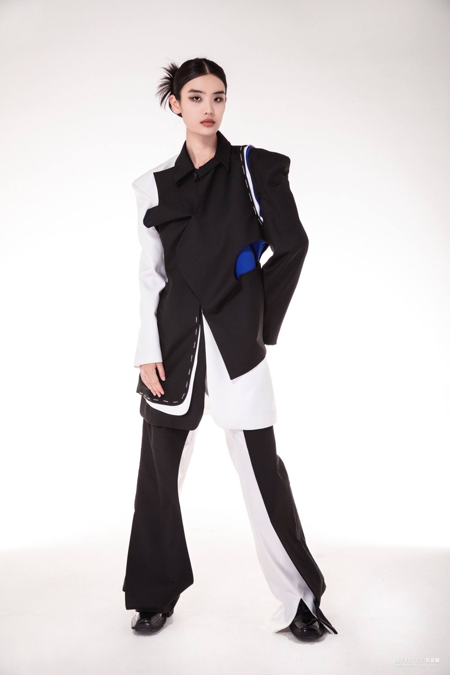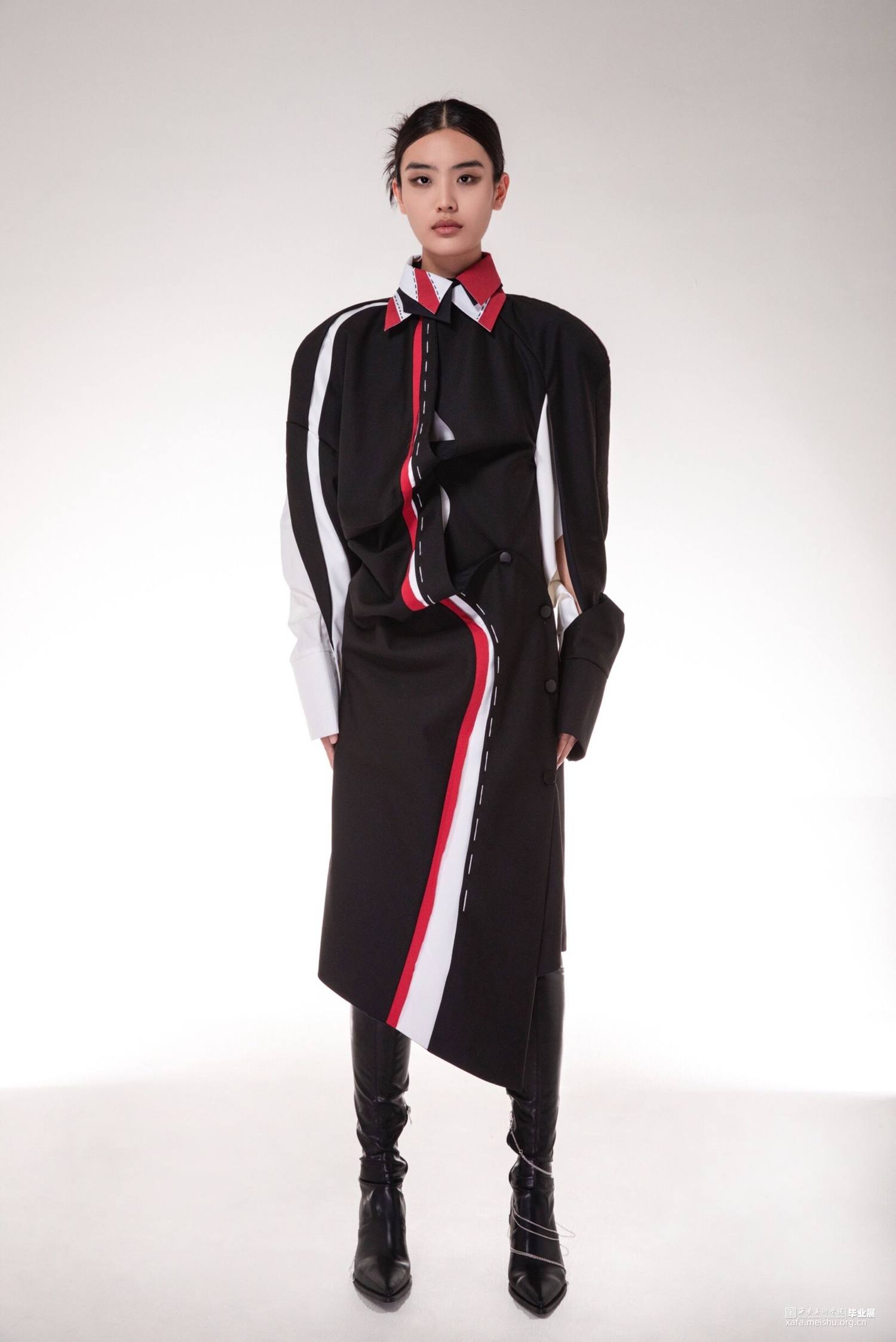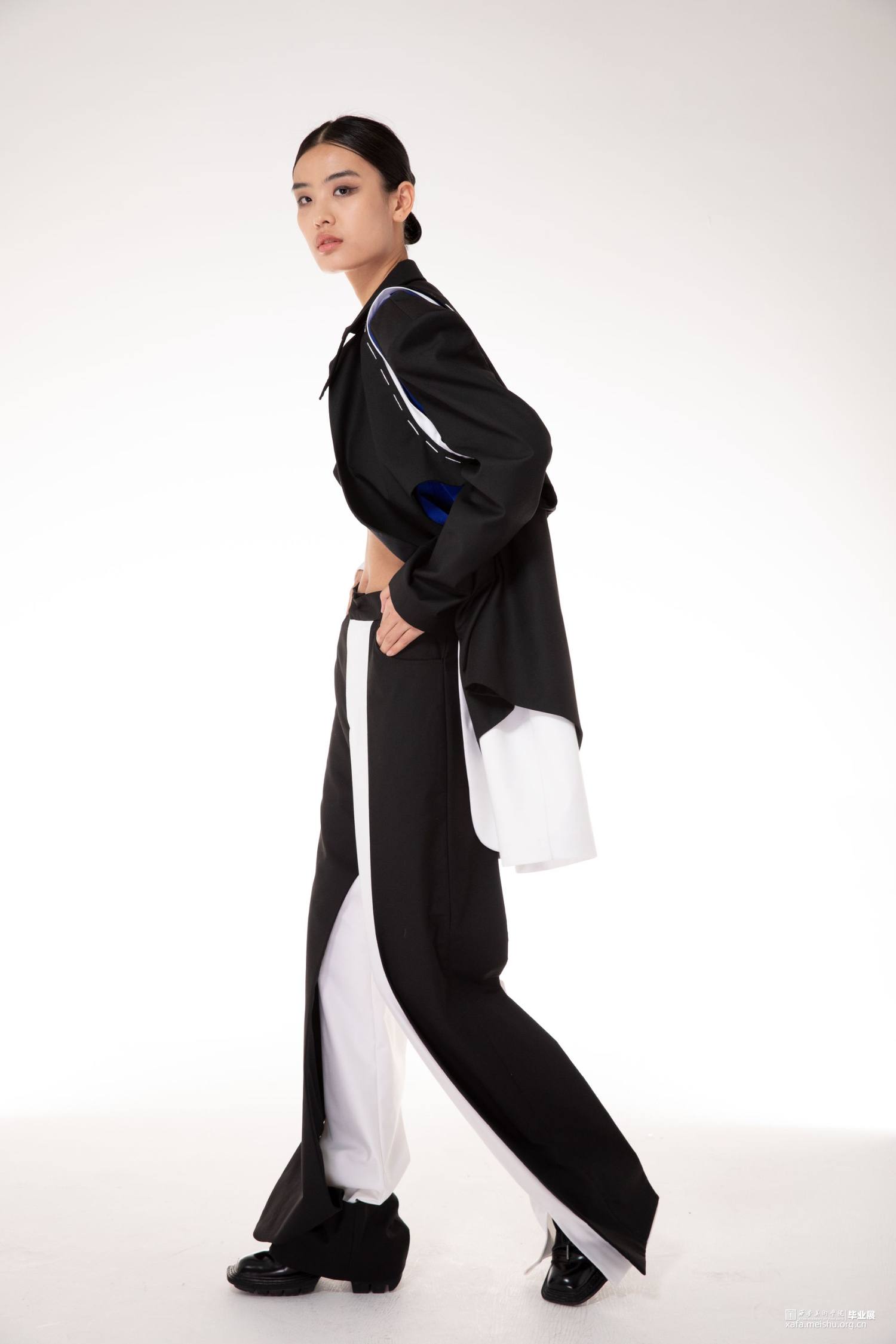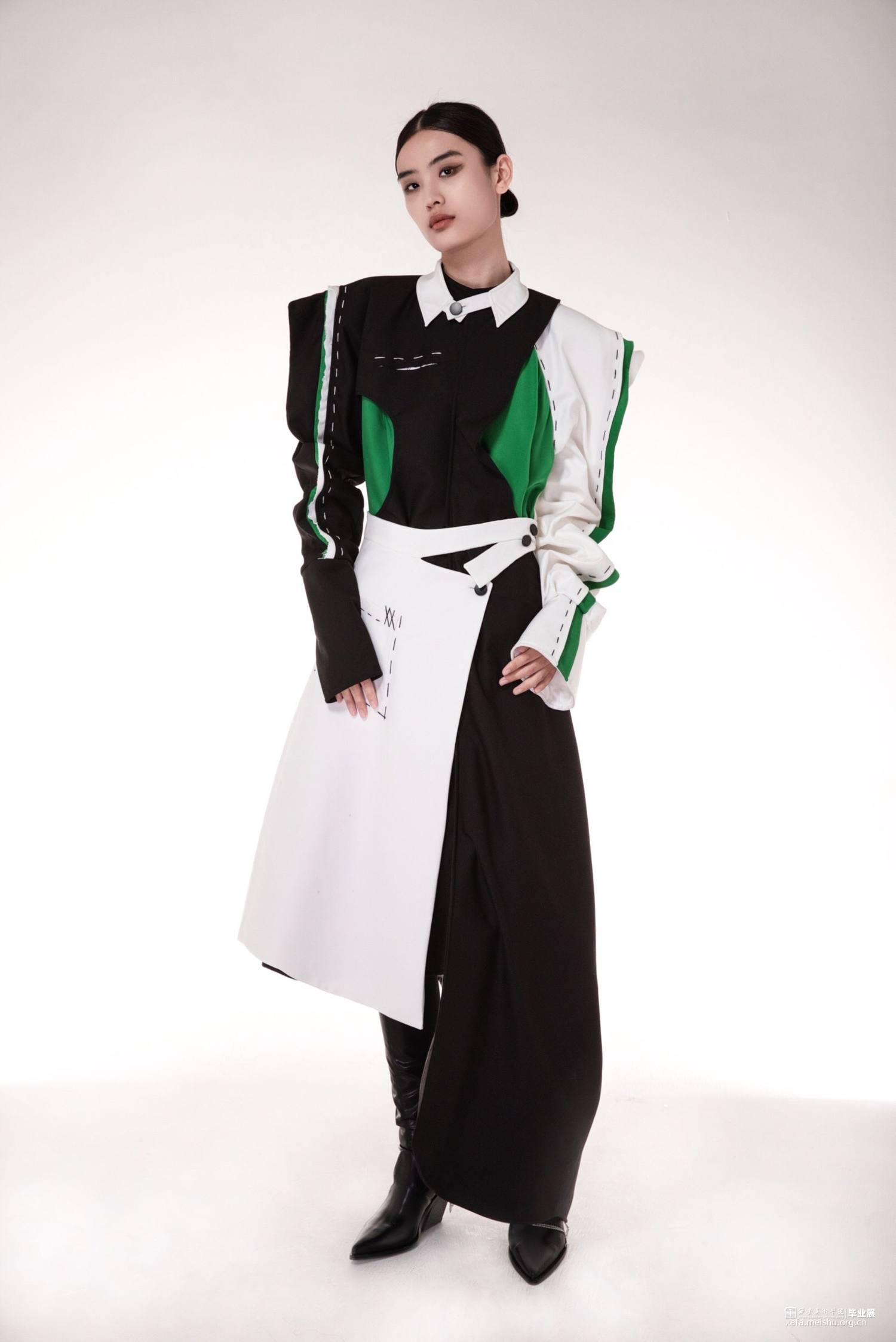 整个系列服装通过对西装、衬衫等进行解构,将衣服的内部结构各组零件分解再进行重新的组合,部分衣片表现出脱落起伏,再加上明线设计,整体服装反常和未完全的状态,从而表达对束缚的挣脱。在服装的色彩选择上,选用大面积黑白和少量的彩色将其表现出颜色的碰撞,从而表达出挣脱束缚后的希望。