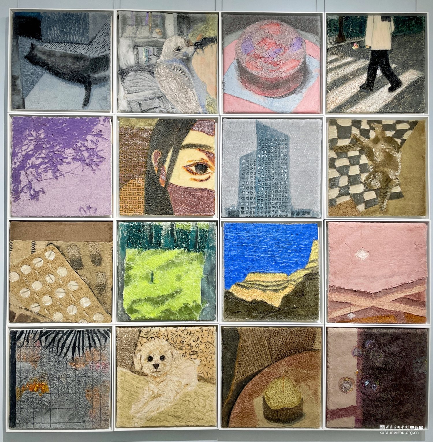 在毛绒布料上进行绘画尝试 用材料本身的肌理感代替笔触 不同浓度的颜料形成的肌理也有不一样的味道 利用凹凸虚实将生活中的美好场景制作出来 打造一个毛绒绒的美好世界 好似日常生活里我们所处的环境就是毛绒绒的世界