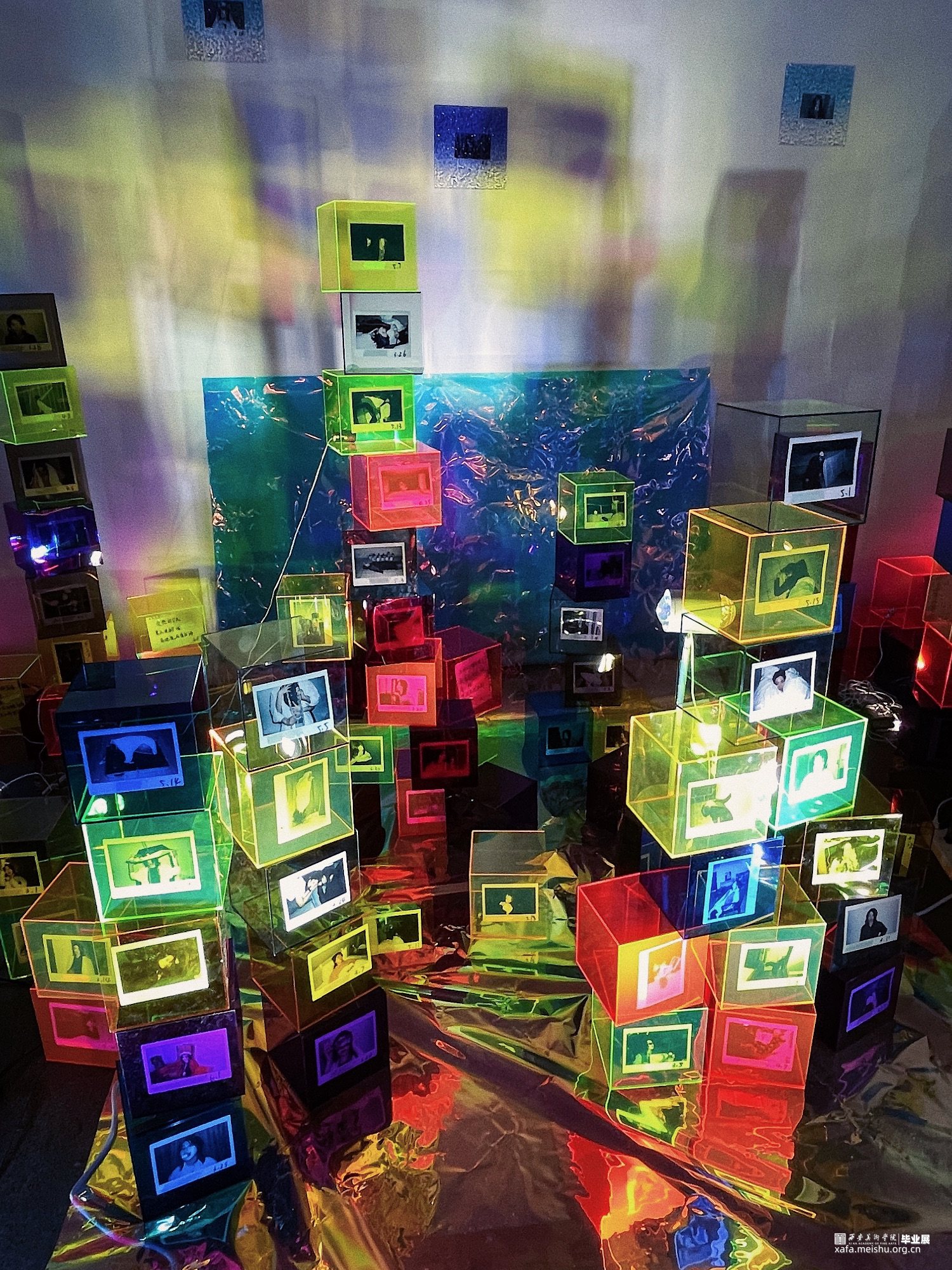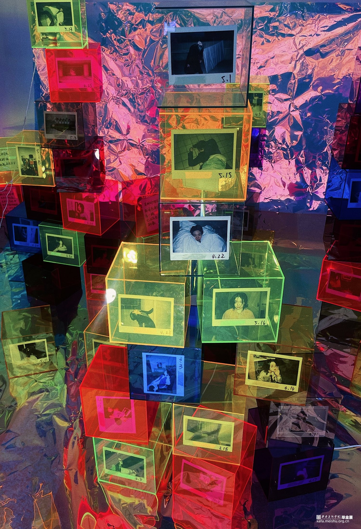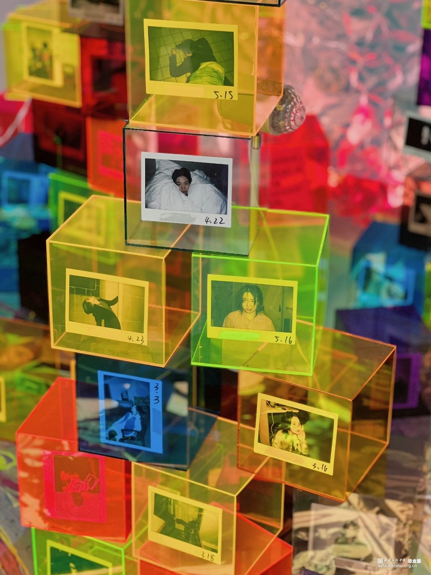 这些是我毕设前100天每日对自己拍摄的一次性成相。 我是个向来敏感内心较封闭的人。而将这些不同状态的“我”直接展示,是对自我、他人眼中的我、他人眼中的自己,一场感受上的共鸣交流。 相片、日记碎片,放进百个亚克力盒,呈现被包裹的状态,是自我的保护。 对日常记录倾向于黑白灰,但盒子色彩鲜明,是对我真正内心的投射。 灯光透过所有的“我”,墙面地面映射出五彩的光线。这是不只浮于相片表面、拥有更多色彩、更鲜活的自我。