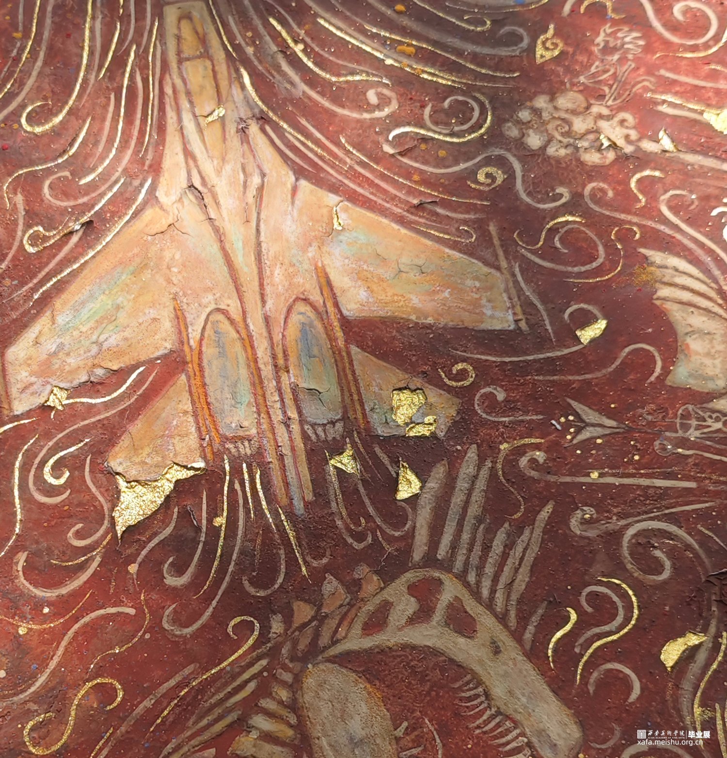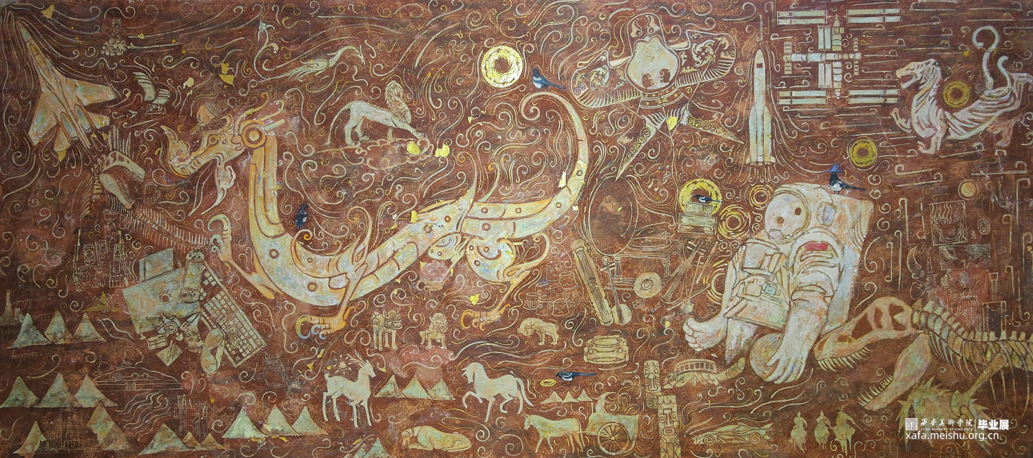 毕业作品《曾经星空下》融合敦煌壁画和史前壁画元素,将个人爱好与古代文物互动,借鉴现代产品改进,反映了古今文化交融的主题。作品简化细节,呈现简约风格,注重空间感和古朴感,汉代云纹增添神秘感,讴歌文化传承与创新的正能量。
