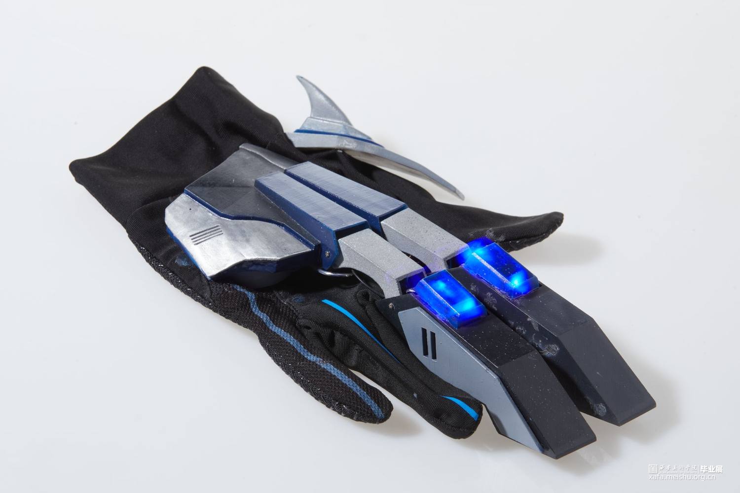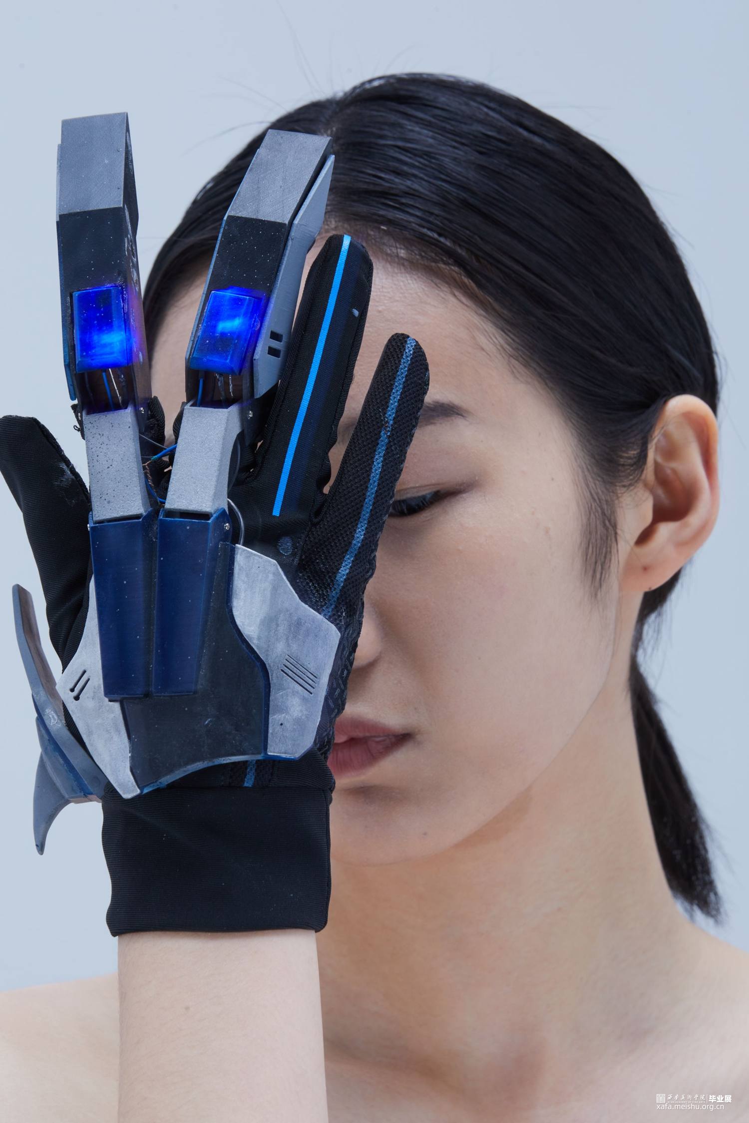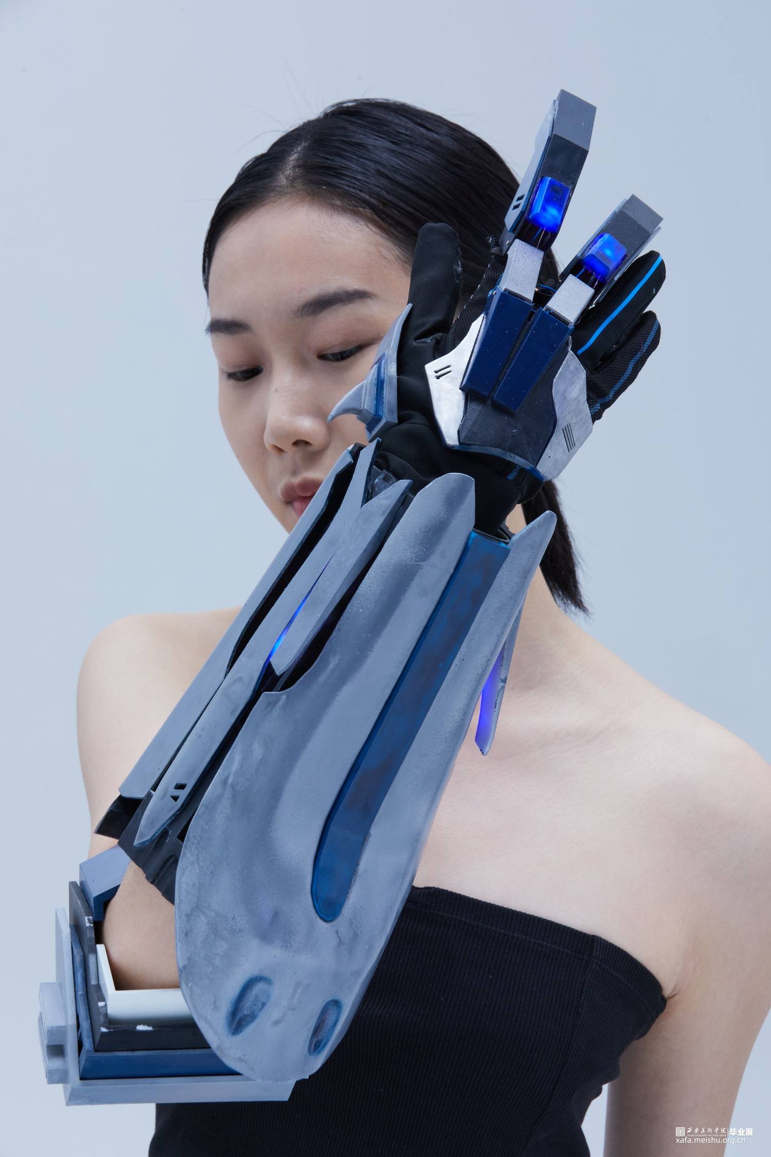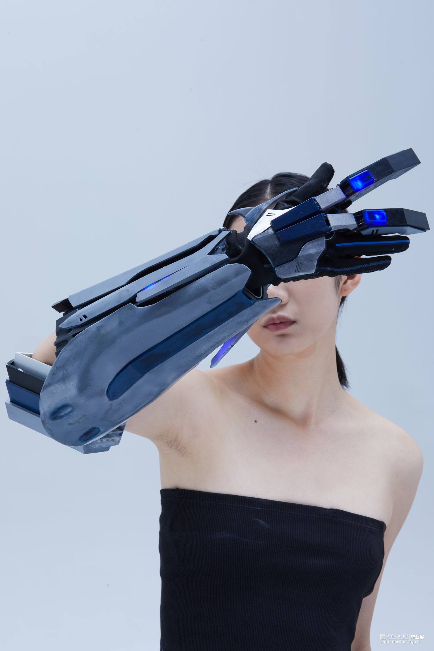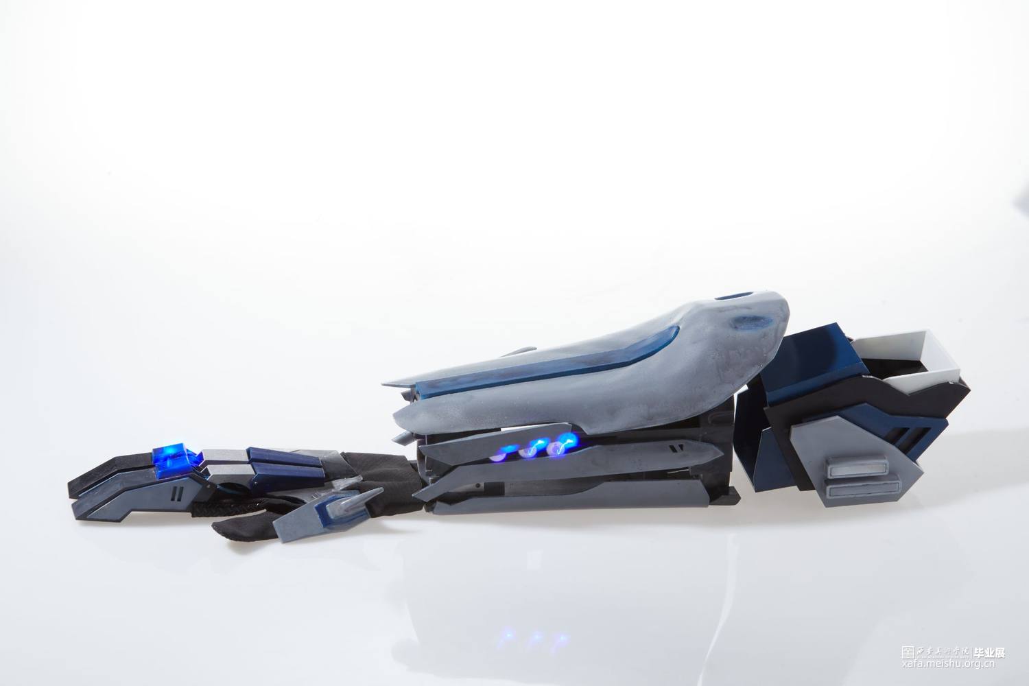 作品使用3d打印技术制作,所使用材料为光敏性树脂,配色方面采用传统的蓝白黑色以凸显作品的科技感及厚重感,并适当添加灯光效果点缀修饰来营造出科幻未来的效果。作品整体采用类似护具和机械结构,设计时既确保了穿戴的可能性还保证了每个关节一定的可动性,增强了其作为首饰的实用性。