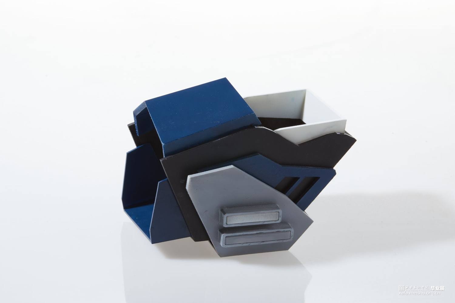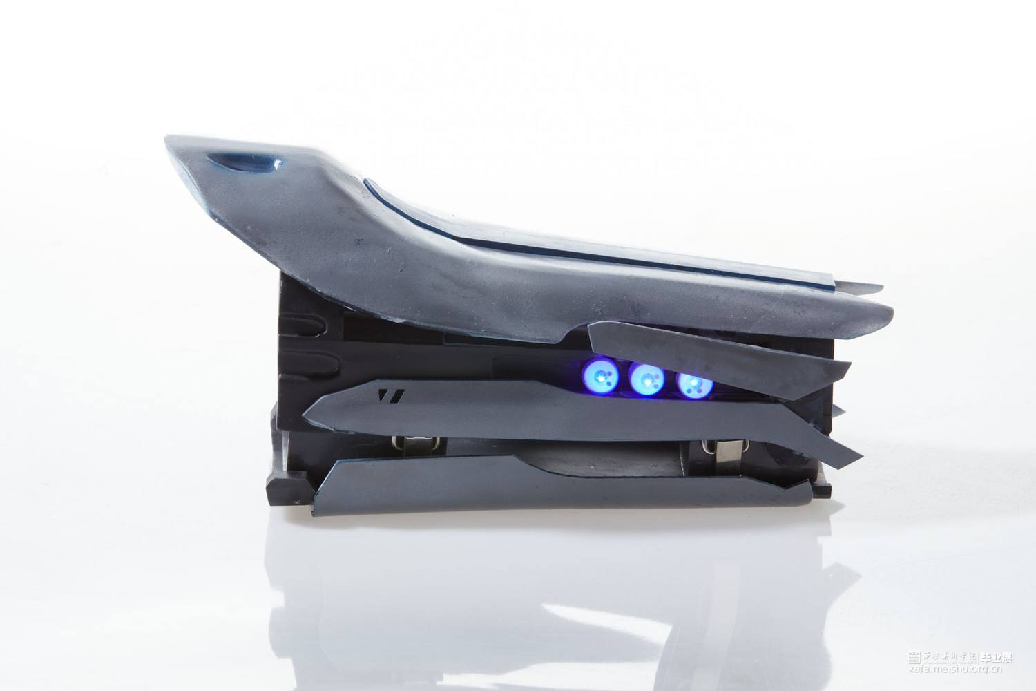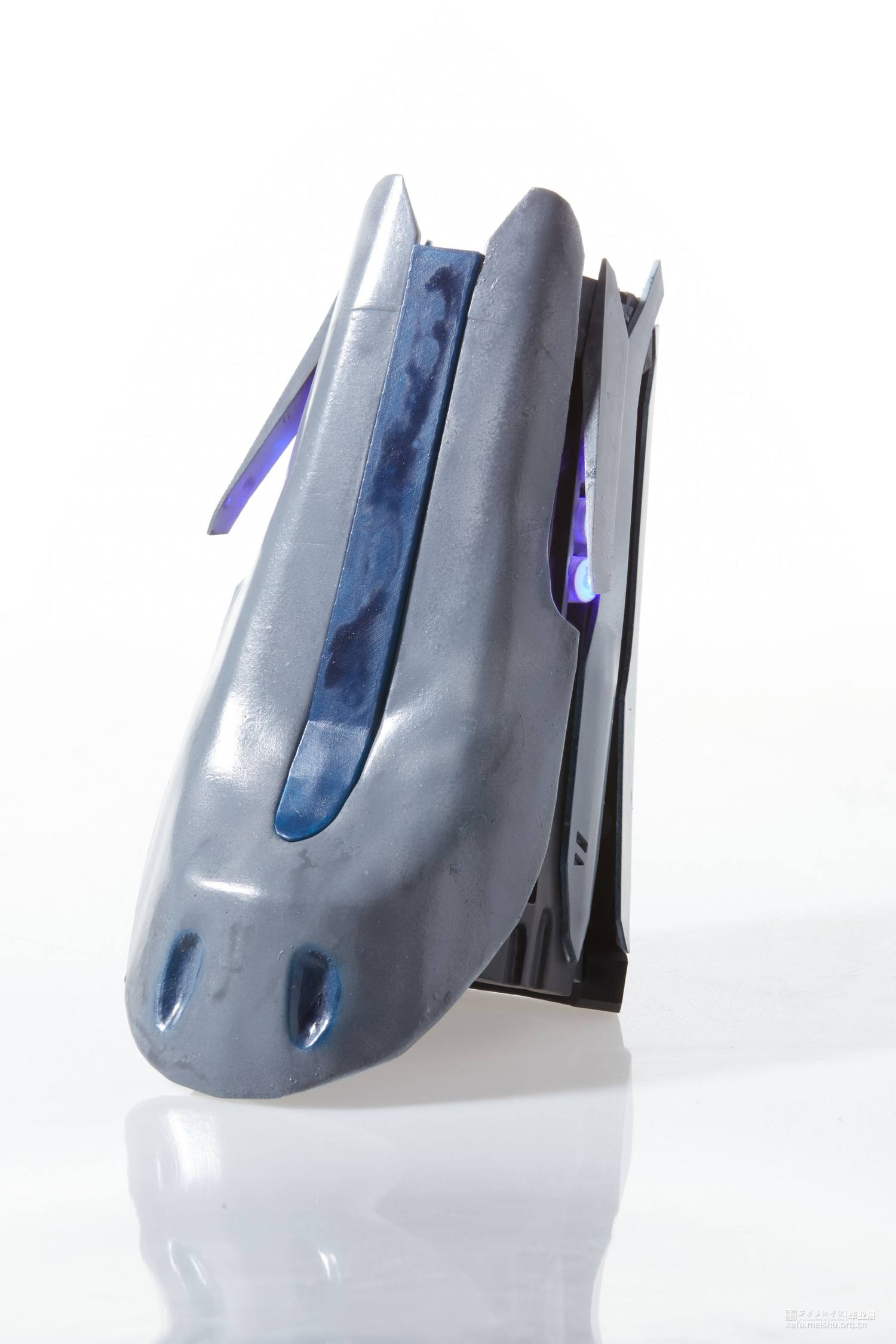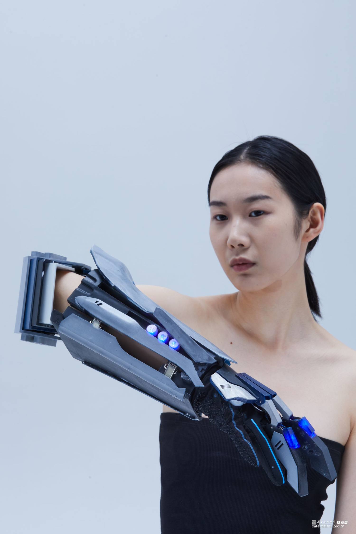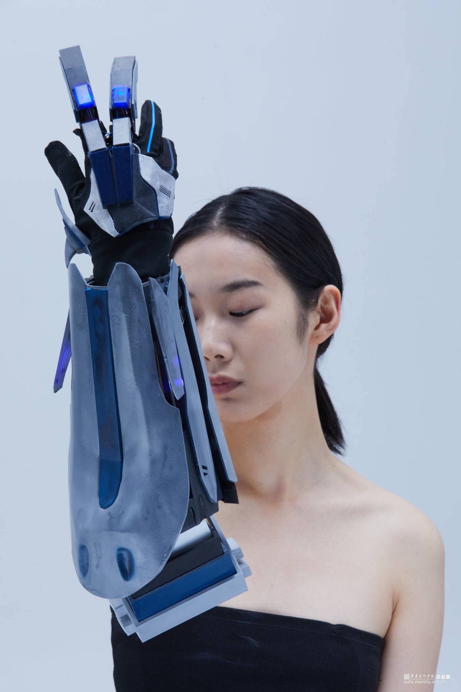 作品使用3d打印技术制作,所使用材料为光敏性树脂,配色方面采用传统的蓝白黑色以凸显作品的科技感及厚重感,并适当添加灯光效果点缀修饰来营造出科幻未来的效果。作品整体采用类似护具和机械结构,设计时既确保了穿戴的可能性还保证了每个关节一定的可动性,增强了其作为首饰的实用性。