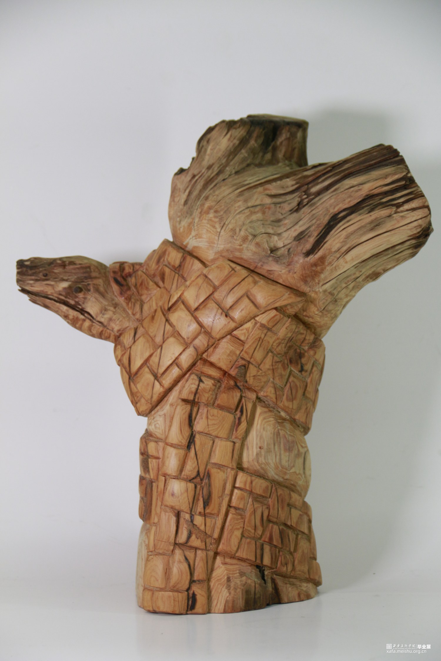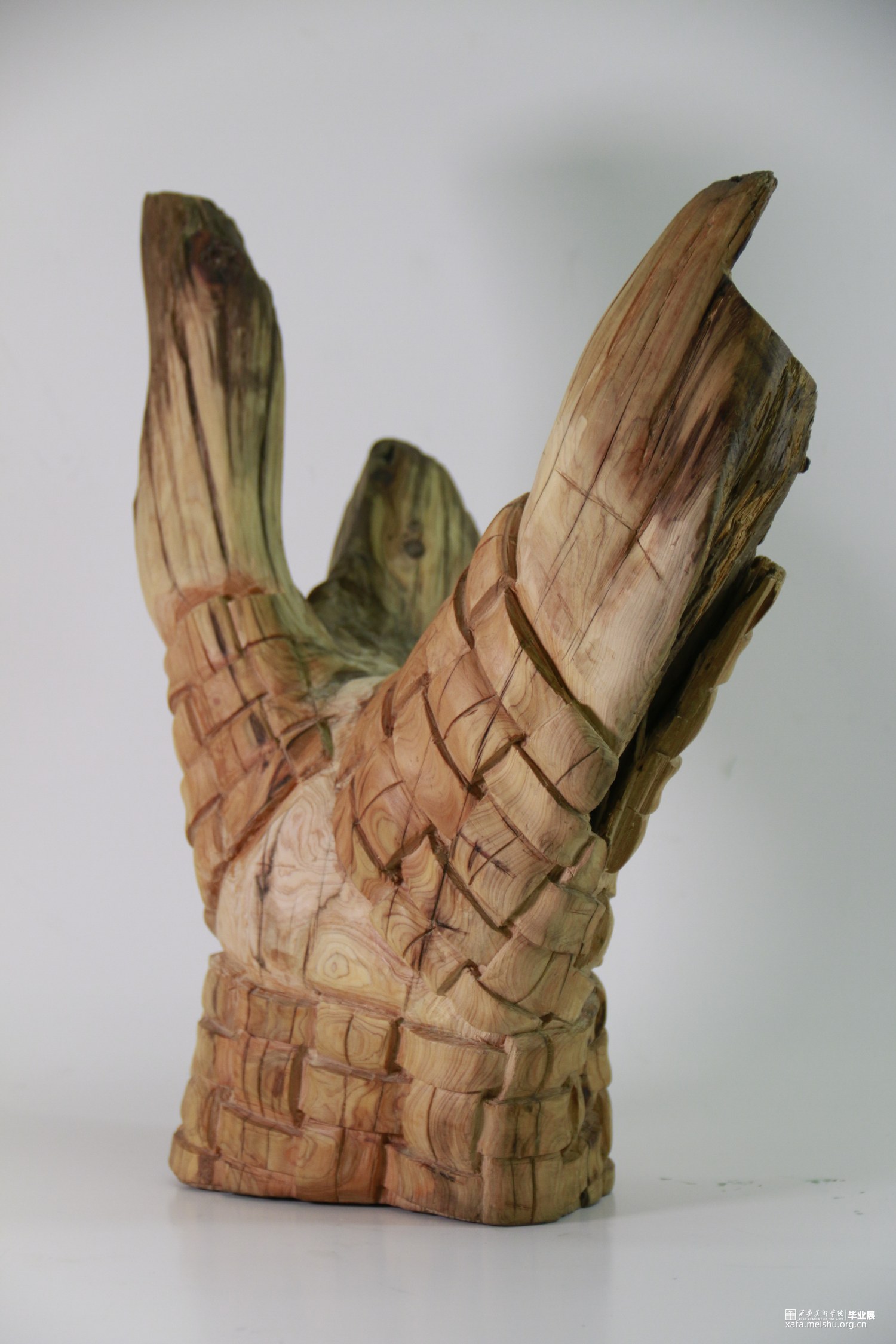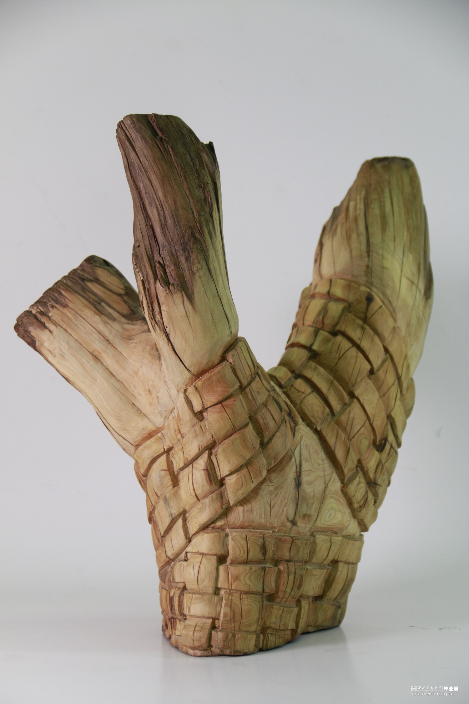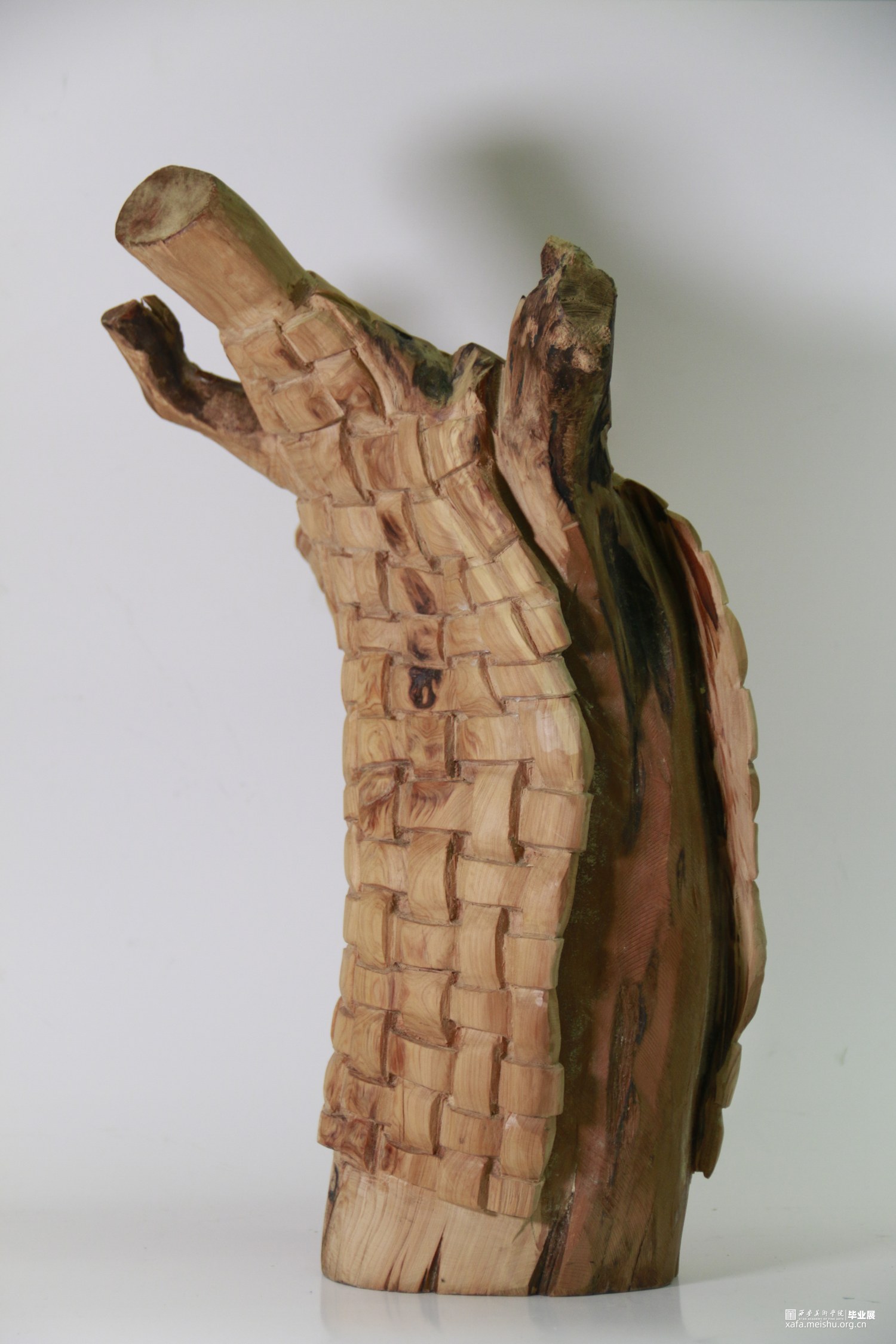 毕业作品《束缚与“生灵”》,运用木雕工艺技术。粗糙肌理与光滑表面的相互作用,将皮革转化成艺术元素,通过木雕的表现形式加以创新,呈现出新的艺术表现形式。反映了人与自然、人与人、人与规则之间的碰撞所产生的关系。