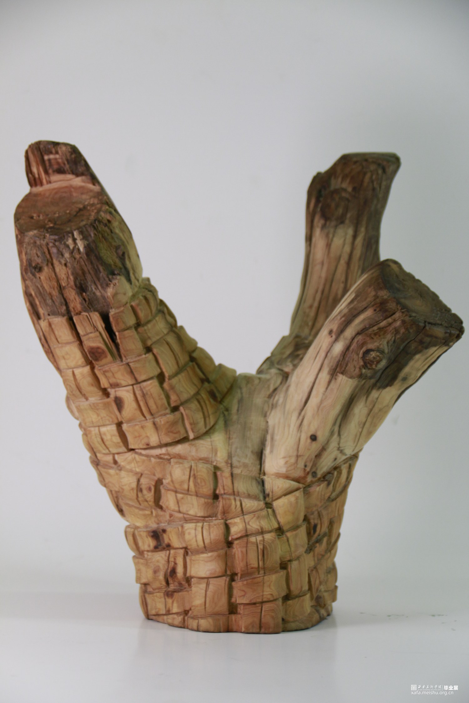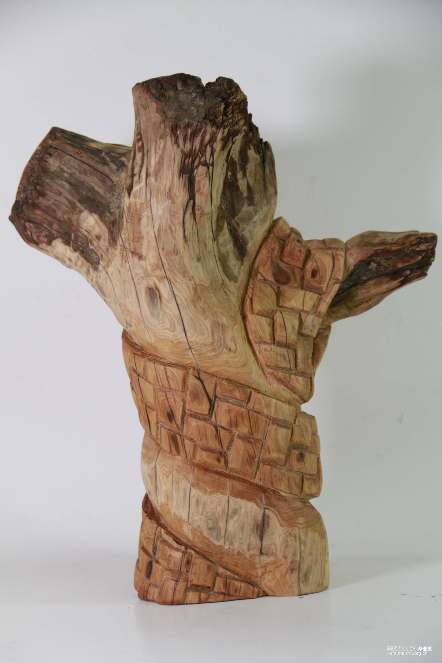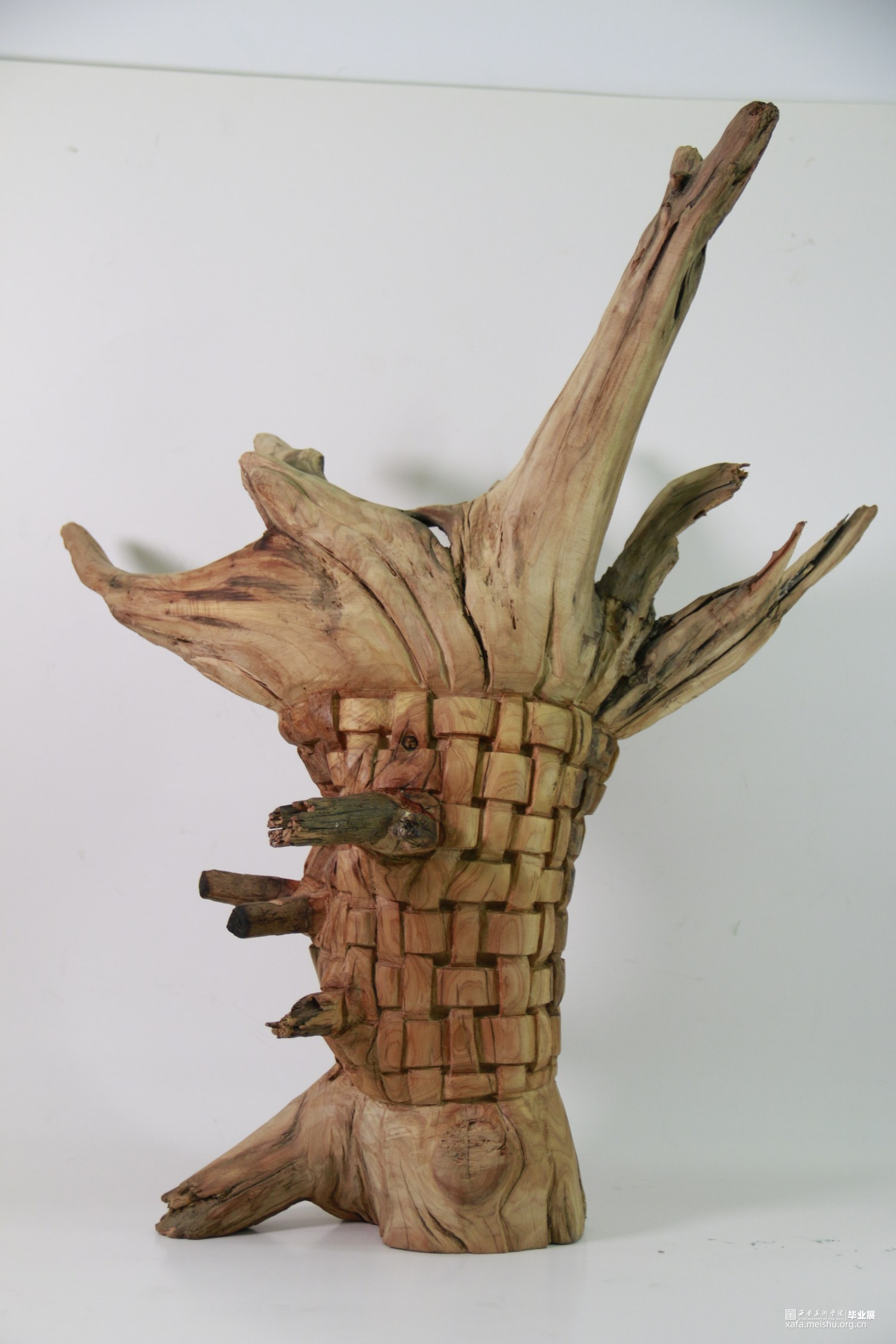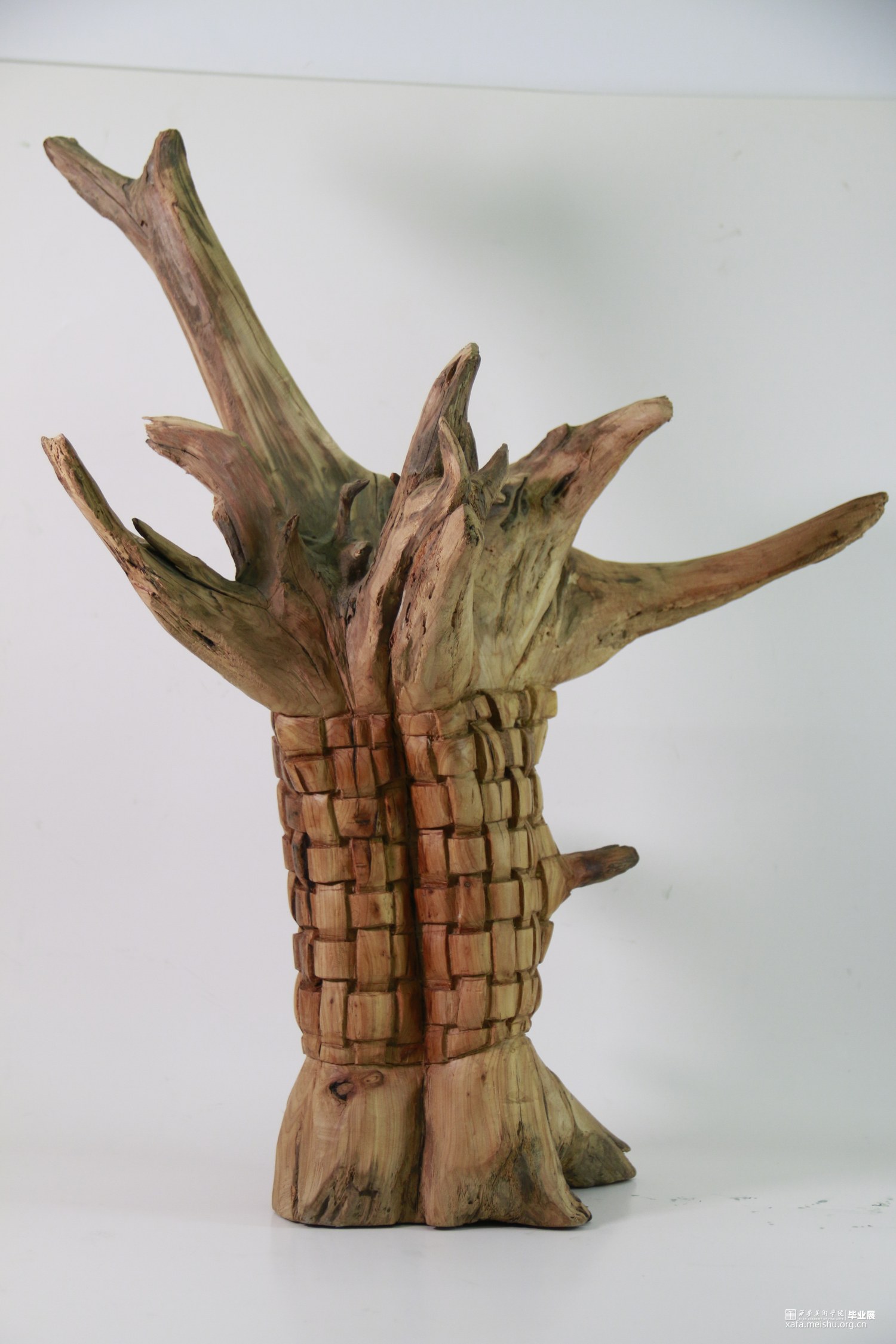 毕业作品《束缚与“生灵”》,运用木雕工艺技术。粗糙肌理与光滑表面的相互作用,将皮革转化成艺术元素,通过木雕的表现形式加以创新,呈现出新的艺术表现形式。反映了人与自然、人与人、人与规则之间的碰撞所产生的关系。