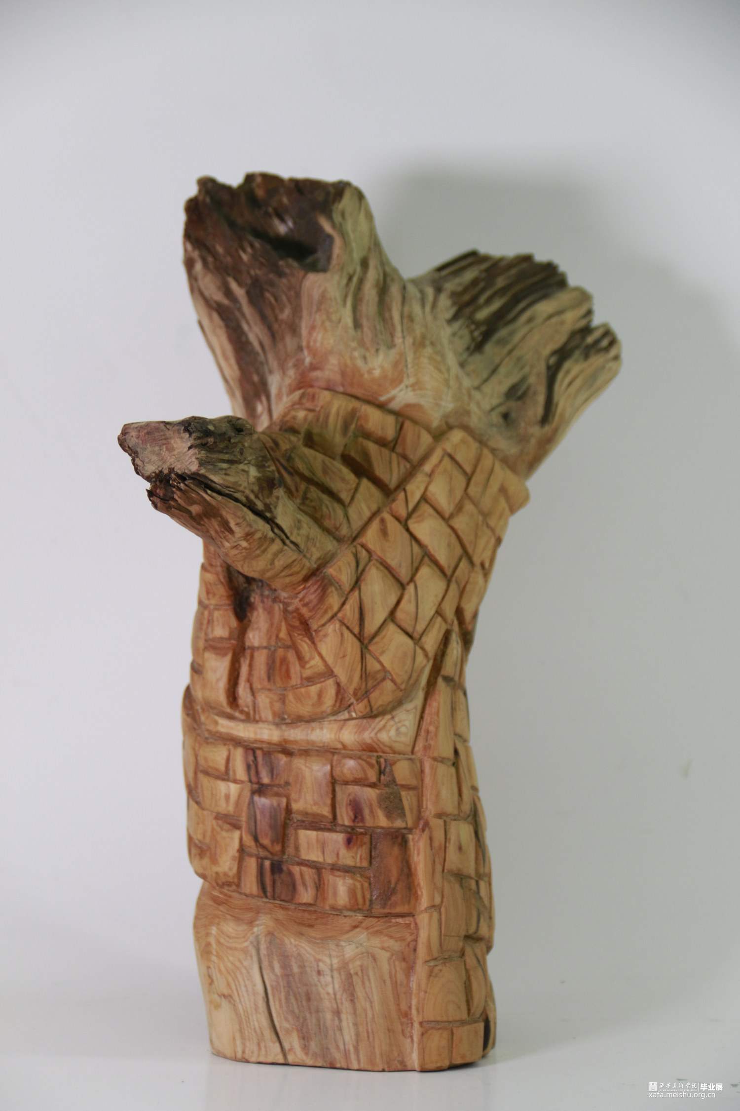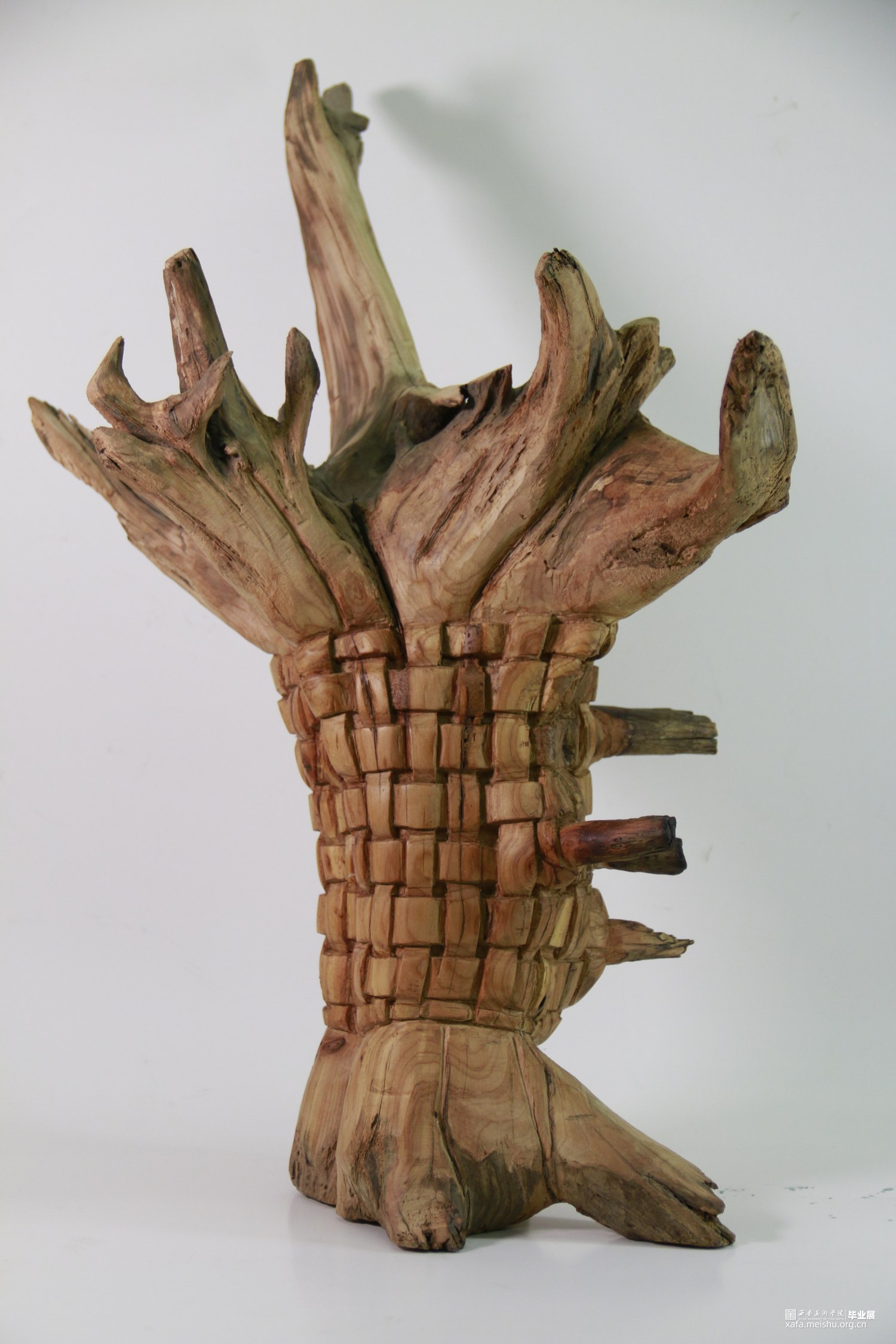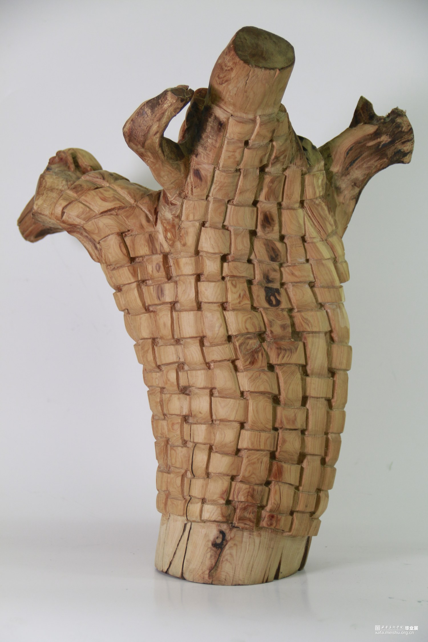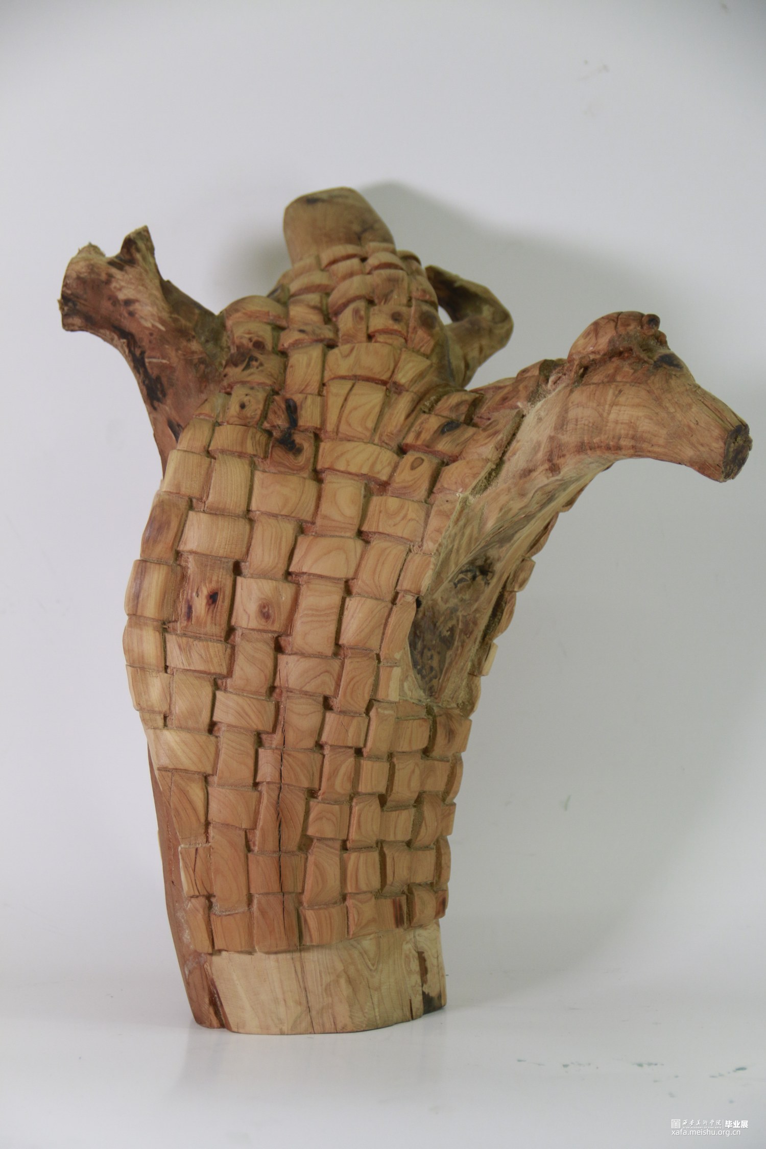毕业作品《束缚与“生灵”》,运用木雕工艺技术。粗糙肌理与光滑表面的相互作用,将皮革转化成艺术元素,通过木雕的表现形式加以创新,呈现出新的艺术表现形式。反映了人与自然、人与人、人与规则之间的碰撞所产生的关系。