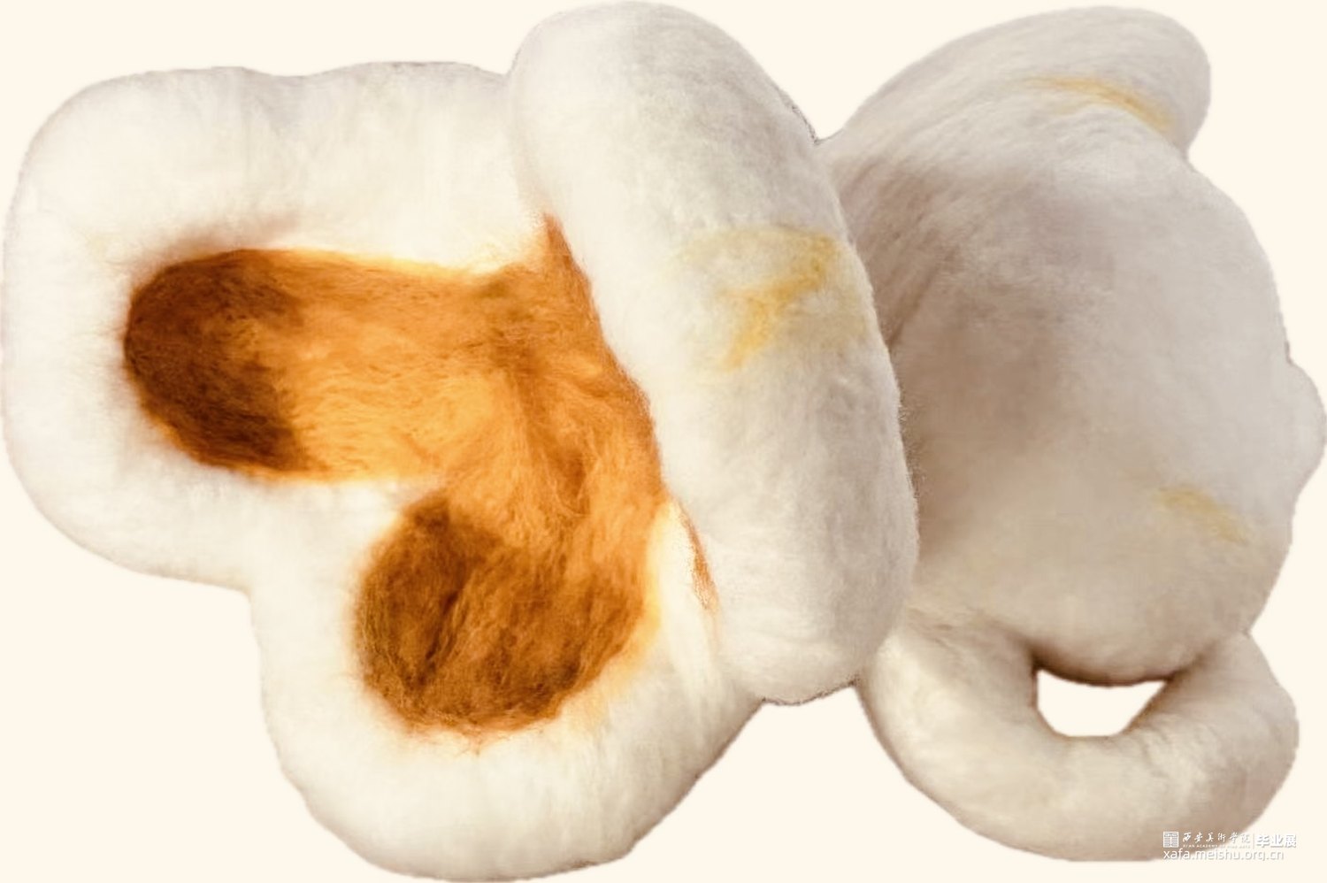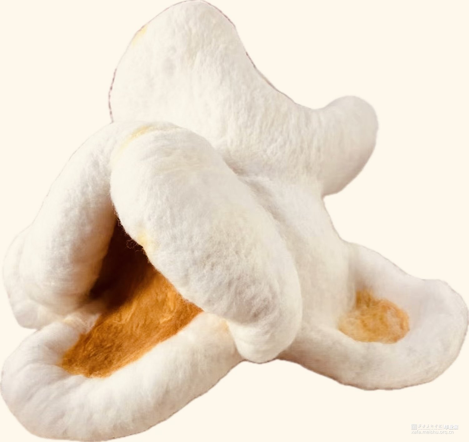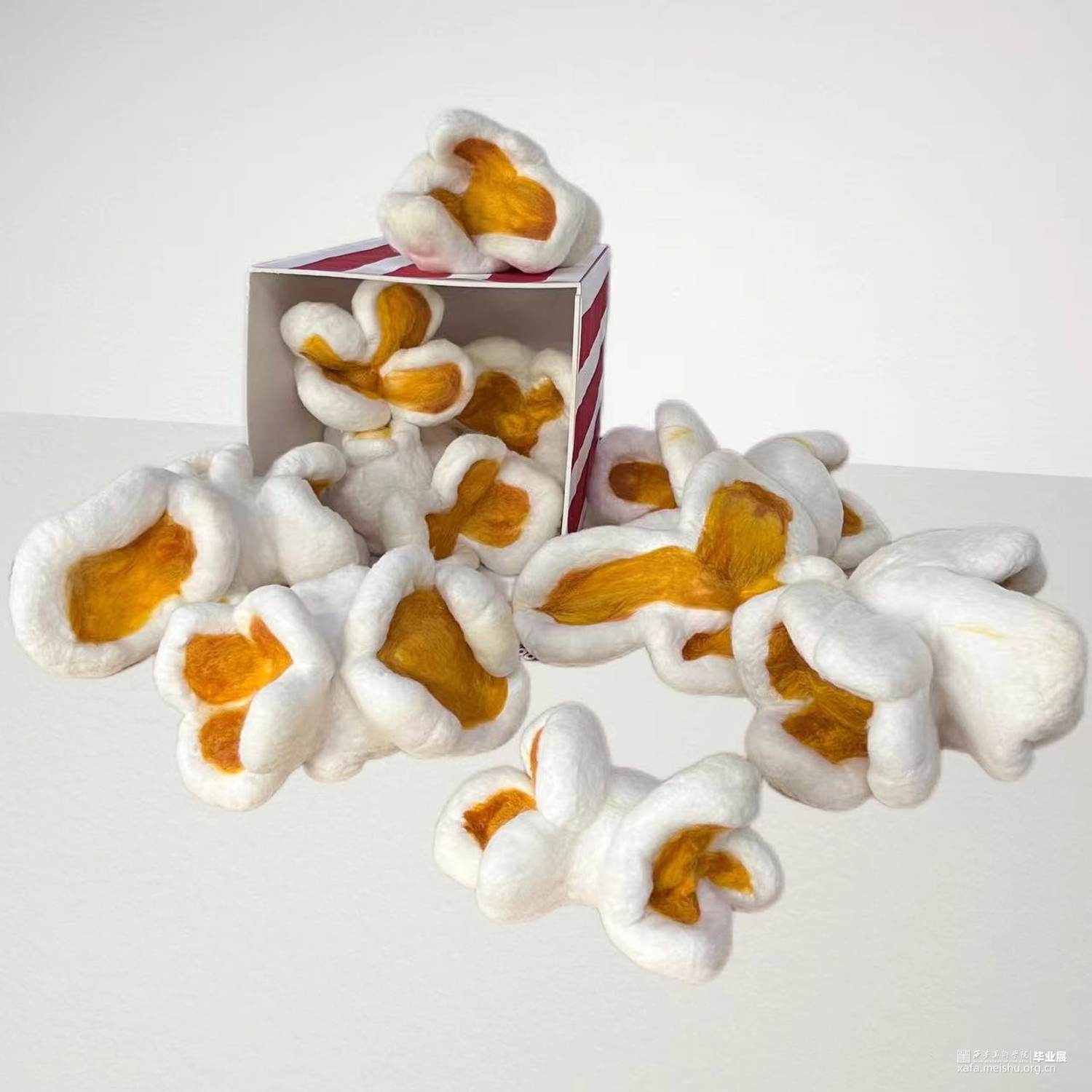 《爆米花》作品运用羊毛毡工艺创作,每一颗玉米在不同的压力下绽放出不同的样子。我们每个人都承受着生活的压力,有些人只承受一方面的压力(比如学习),有些人同时承受双方面的压力(比如工作和家庭),还有些人则承受多方面的压力(比如兼顾老人、孩子和工作)。我们每个人都像爆开的爆米花,受到不同的压力,展现出独特的样貌。你认为自己更像哪一种爆米花呢?