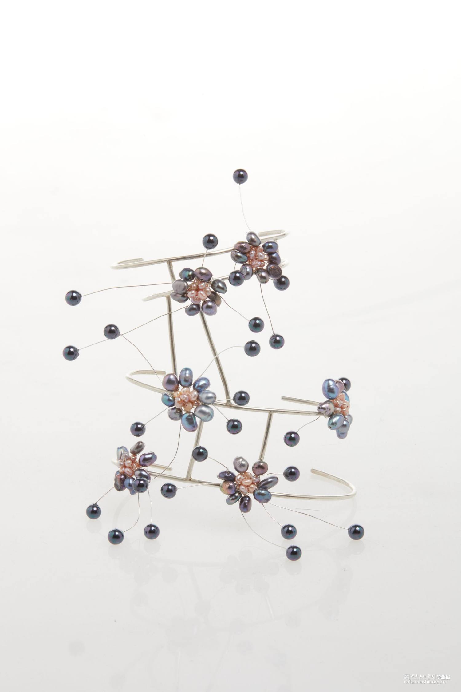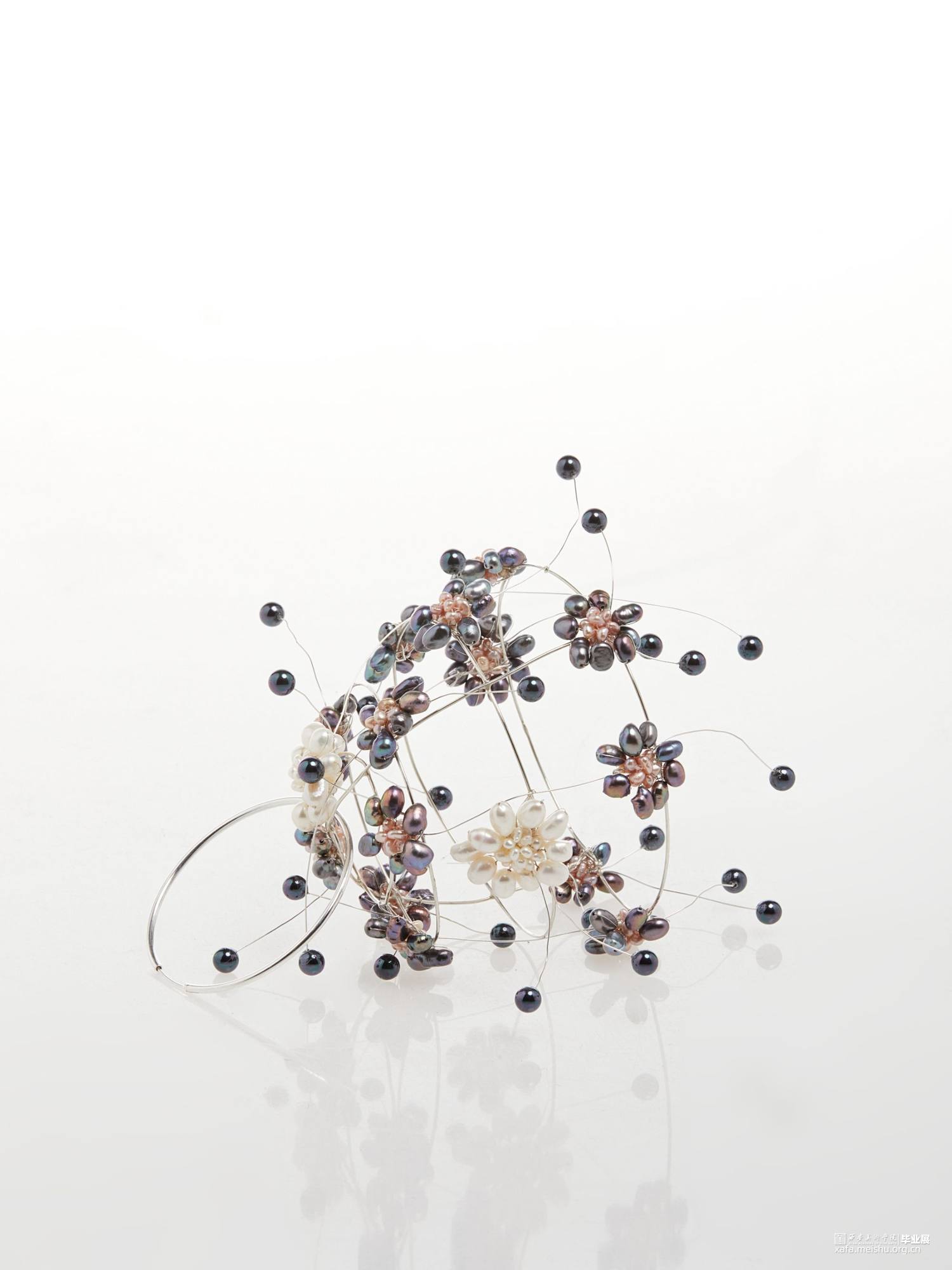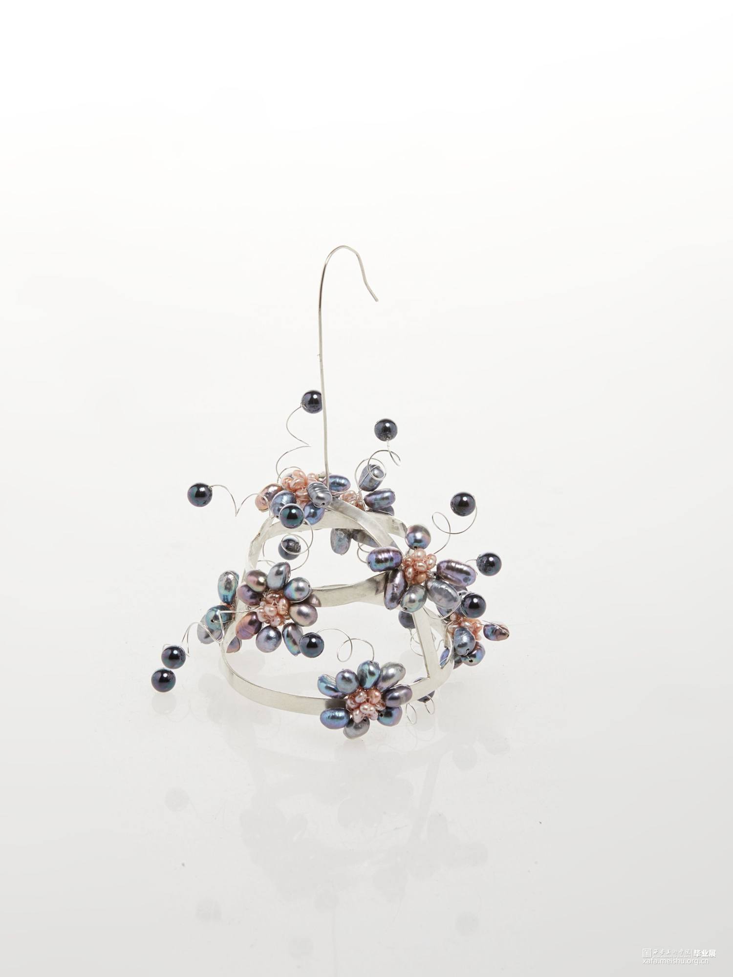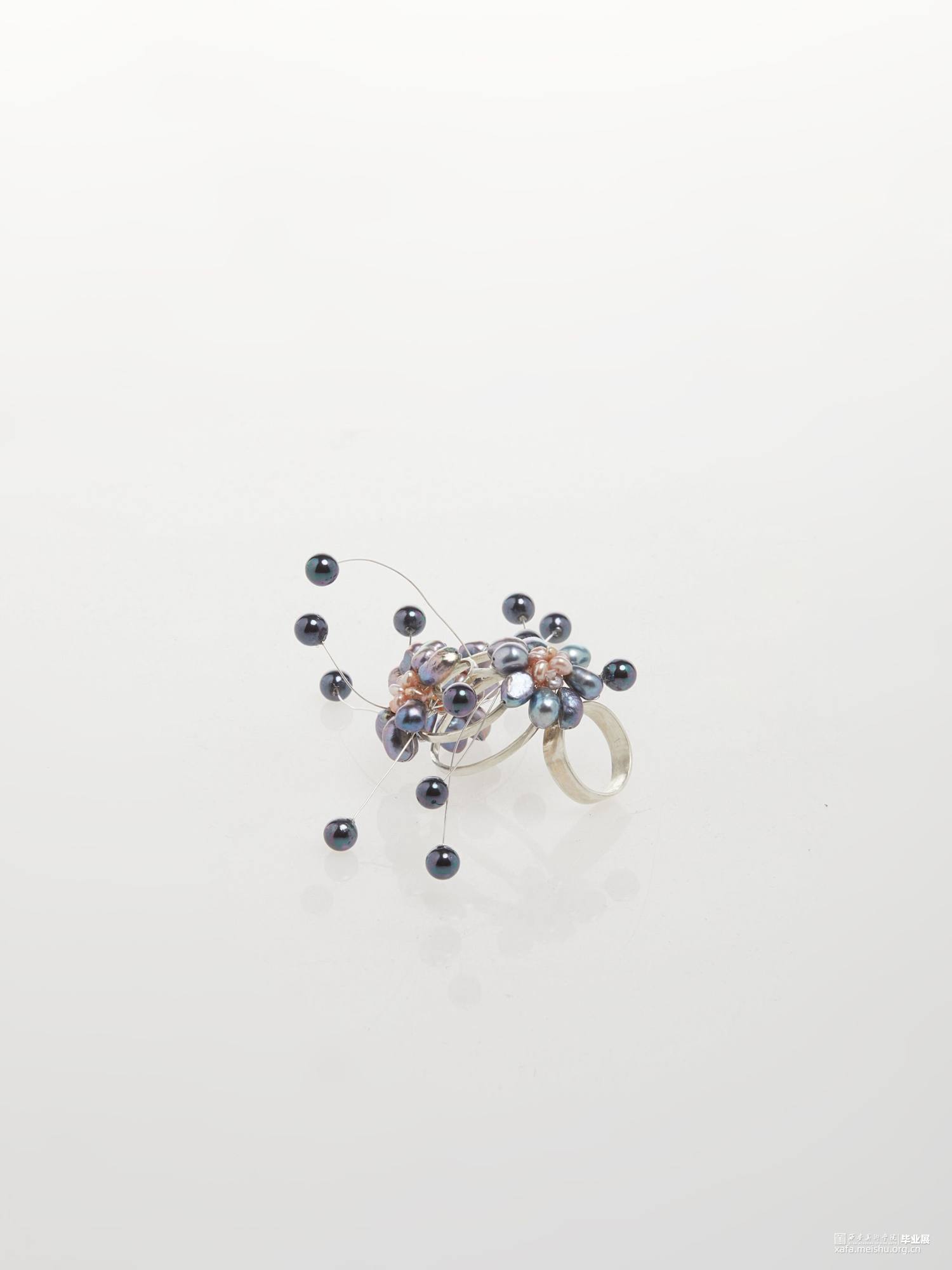 本系列毕业设计作品,形式上采用了凤冠的冠型和小花型,用黑色珍珠编成的小花进行新冠肺炎病毒的形态美化,花朵表达春暖花开疫情消退的美好祝愿,黑色表达疫情的阴郁,结合现代首饰设计进行变形创意,并使用珍珠进行创意装饰。