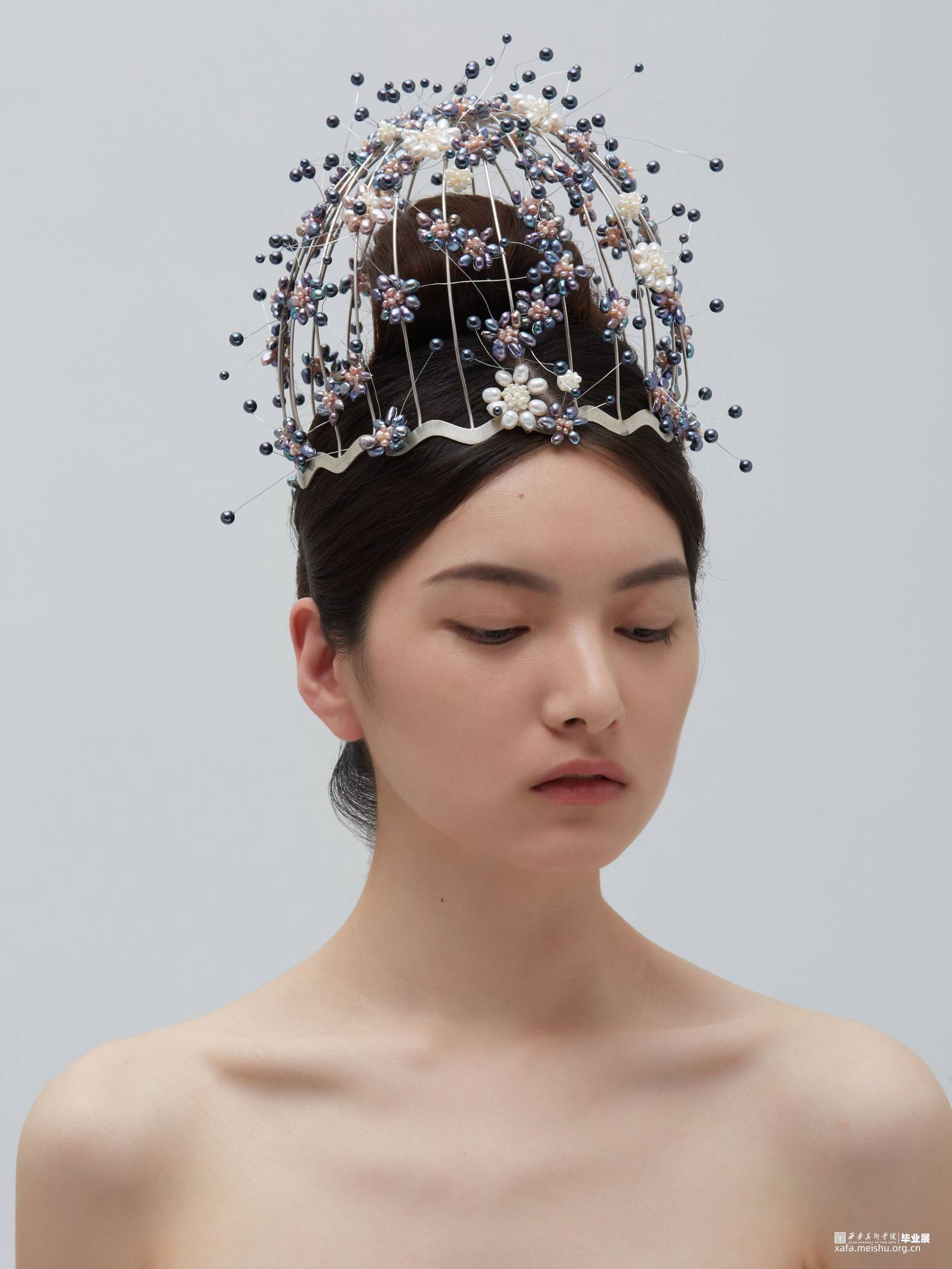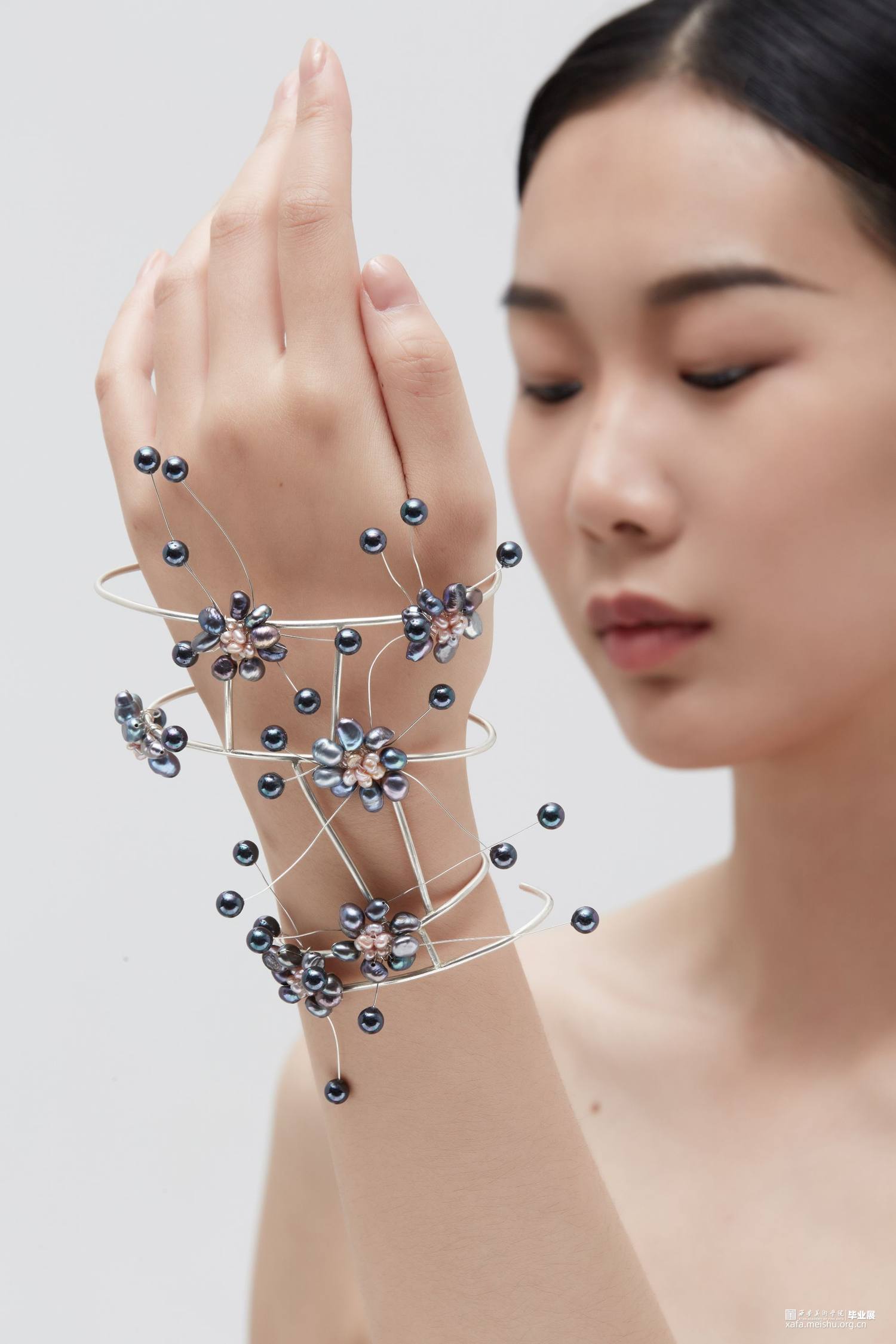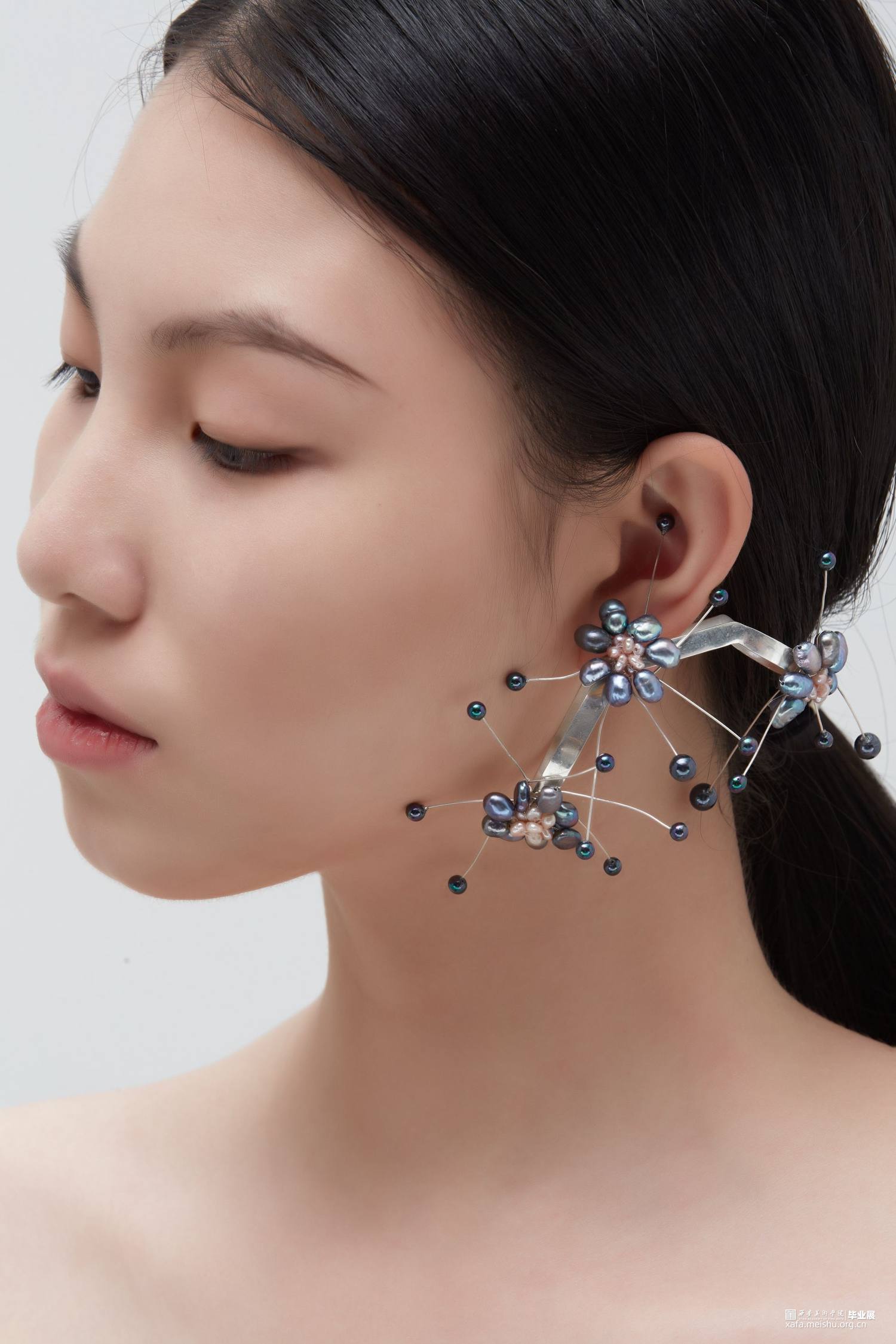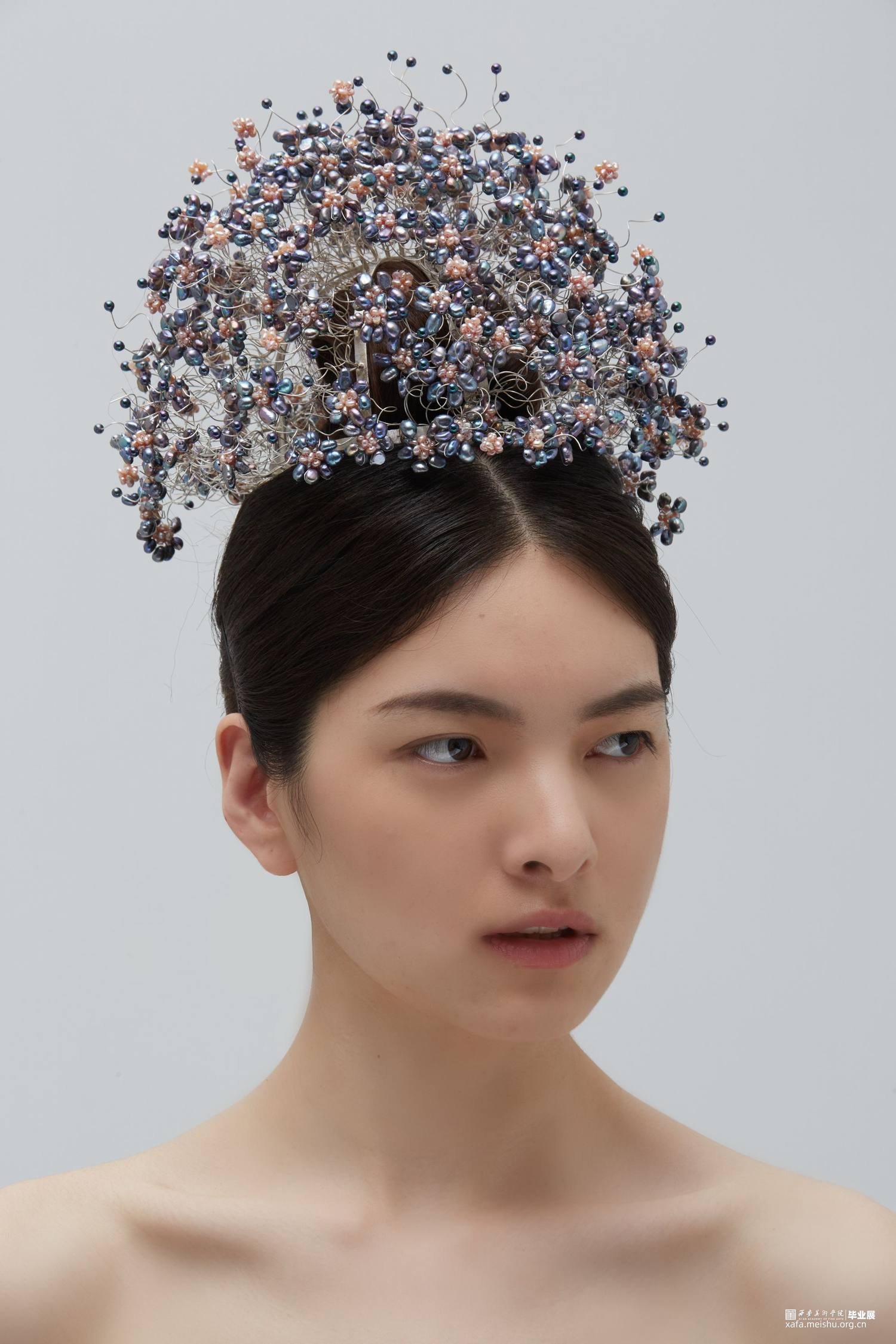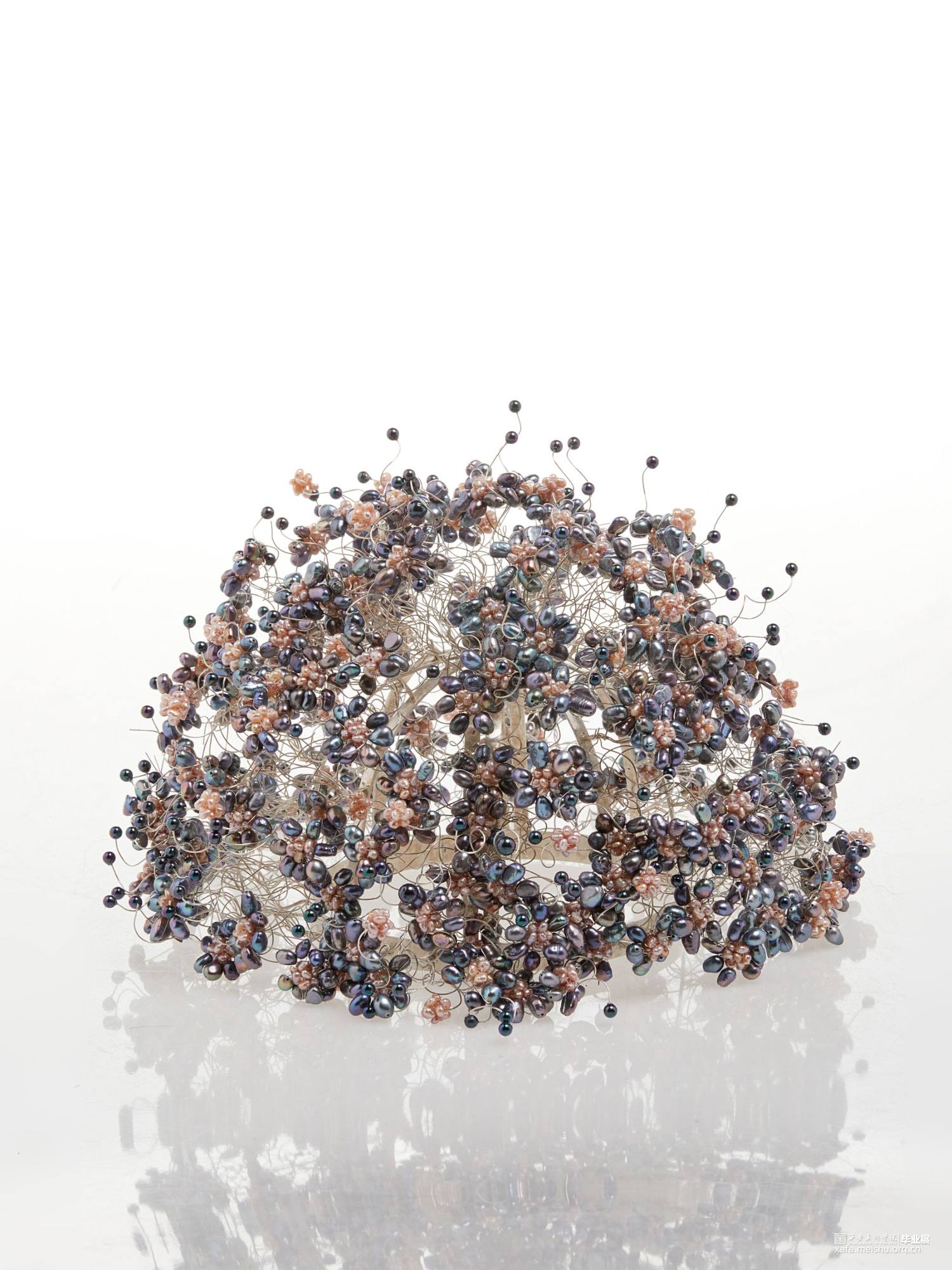 本系列毕业设计作品,形式上采用了凤冠的冠型和小花型,用黑色珍珠编成的小花进行新冠肺炎病毒的形态美化,花朵表达春暖花开疫情消退的美好祝愿,黑色表达疫情的阴郁,结合现代首饰设计进行变形创意,并使用珍珠进行创意装饰。