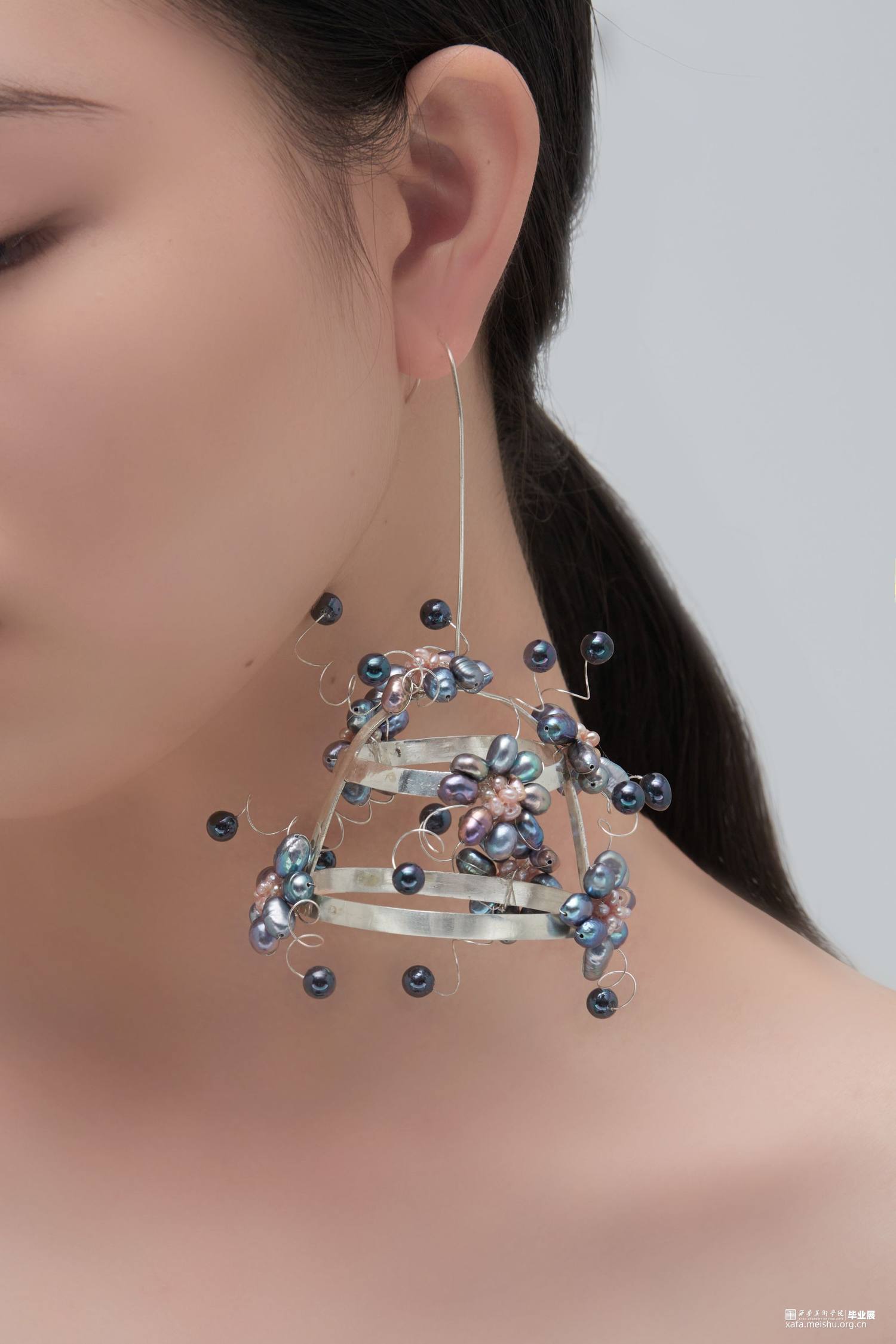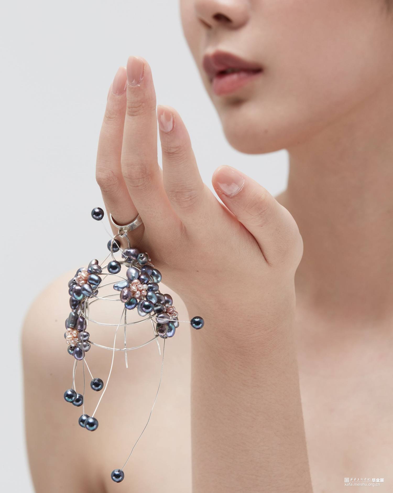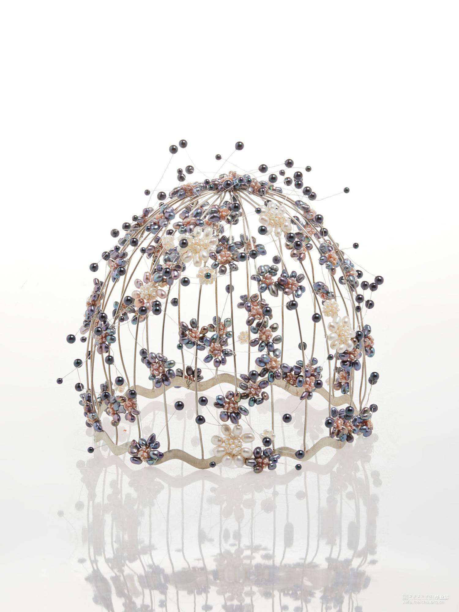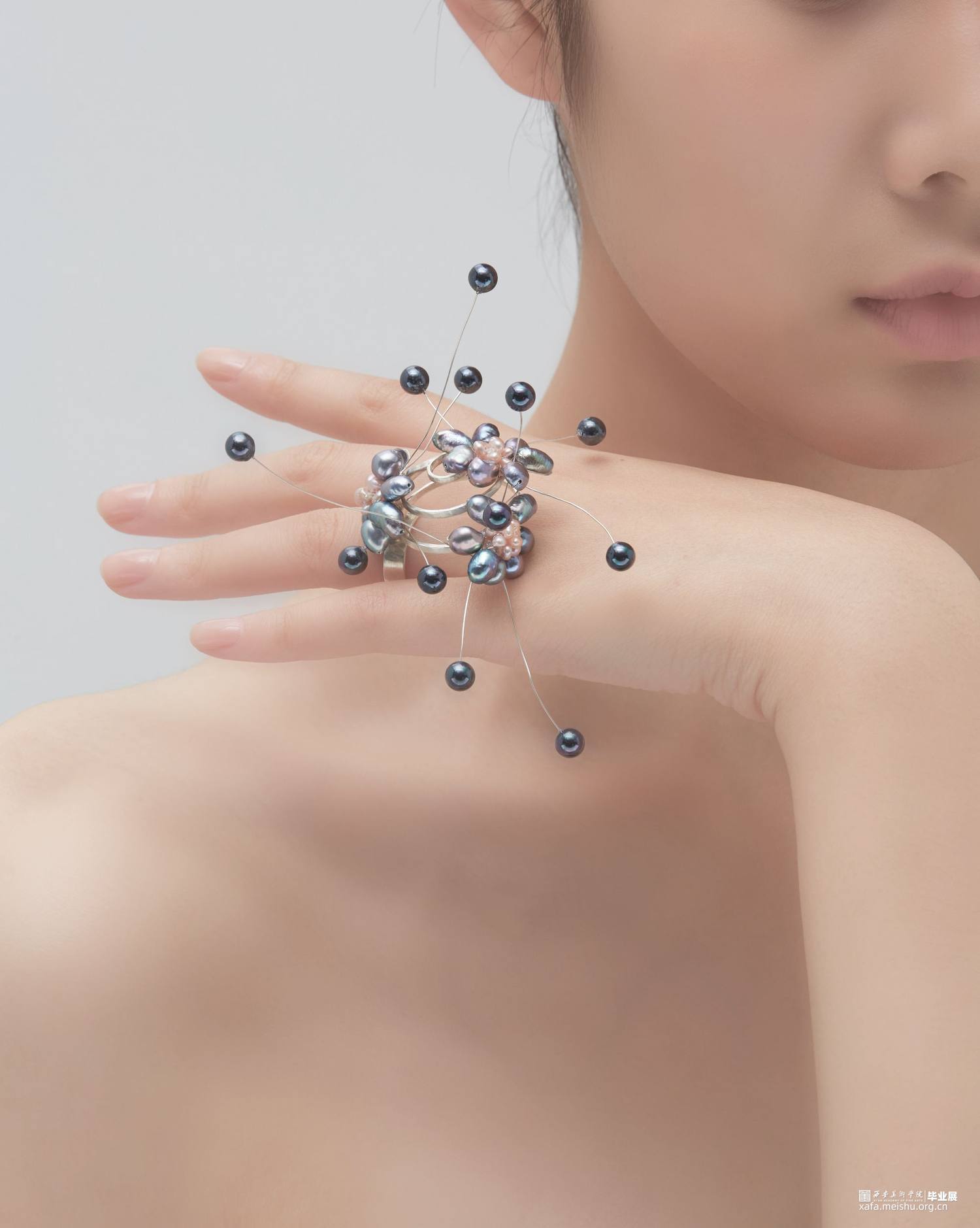 本系列毕业设计作品,形式上采用了凤冠的冠型和小花型,用黑色珍珠编成的小花进行新冠肺炎病毒的形态美化,花朵表达春暖花开疫情消退的美好祝愿,黑色表达疫情的阴郁,结合现代首饰设计进行变形创意,并使用珍珠进行创意装饰。