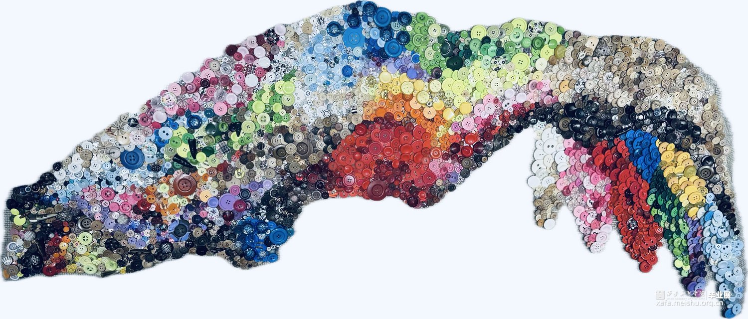 这幅纽扣工艺的作品名字叫《翼wings》,简单来说就像是折翼后的翱翔,设计草图的时候想到了用自己特殊的身份,给这幅作品注入了更加深层的意义;做的成果用不同的颜色来代表,更能突出我们的人生应该是丰富多彩的,未来的我们也将会是五彩缤纷,而不是被人定义的人生;这幅作品能够表达出我的情感和信念。