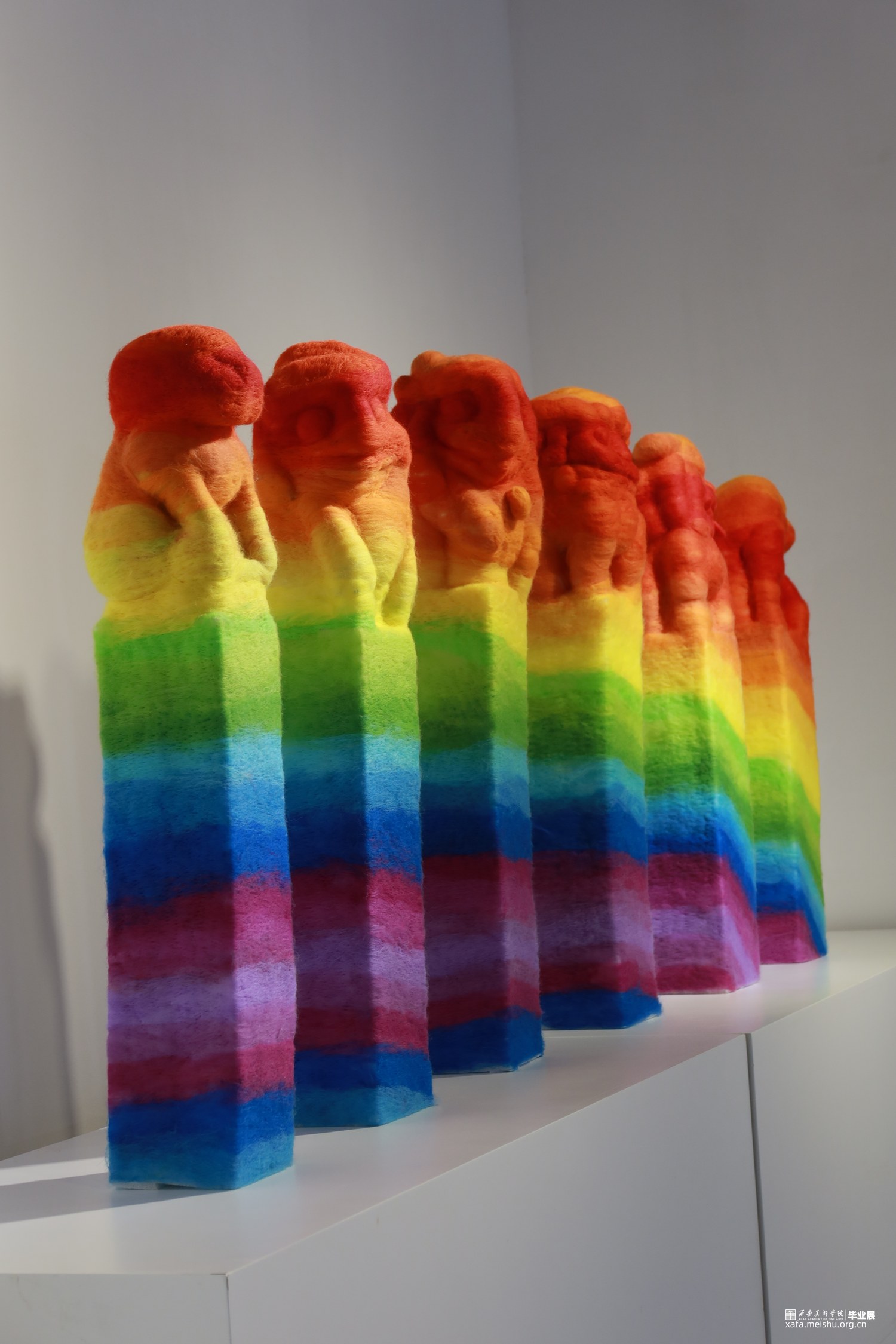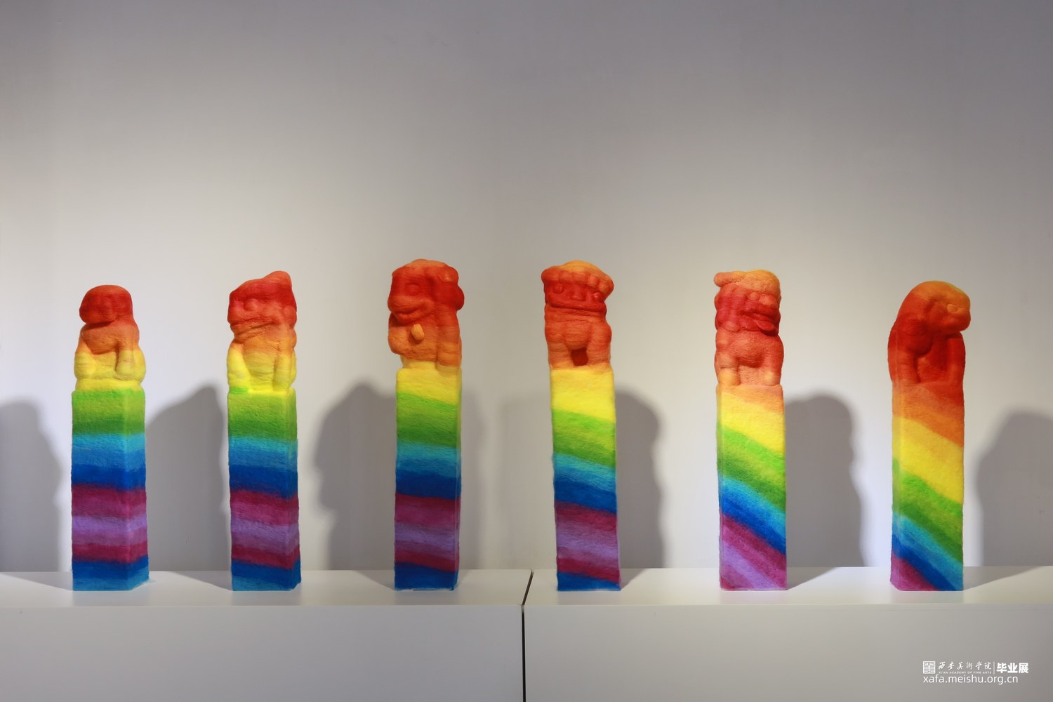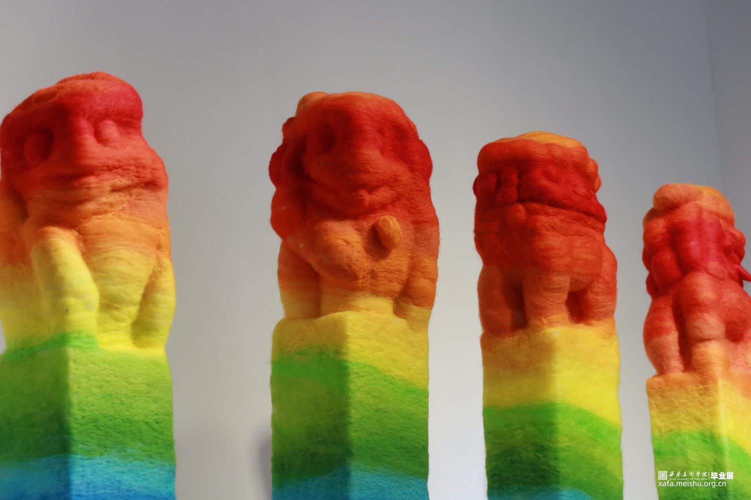 毕业作品《彩虹之缰》采用毛毡工艺,模拟彩虹形态展示在作品上。毛毡拴马桩不仅在视觉上突破,更传达着传统文化的深刻内涵。彩虹象征着阳光映射的七彩光芒,代表着过去、现在和未来的见证者。作品鼓励人们面对困难坚持不懈,同时强调弘扬传统文化的重要性,是青年担当的使命所在。