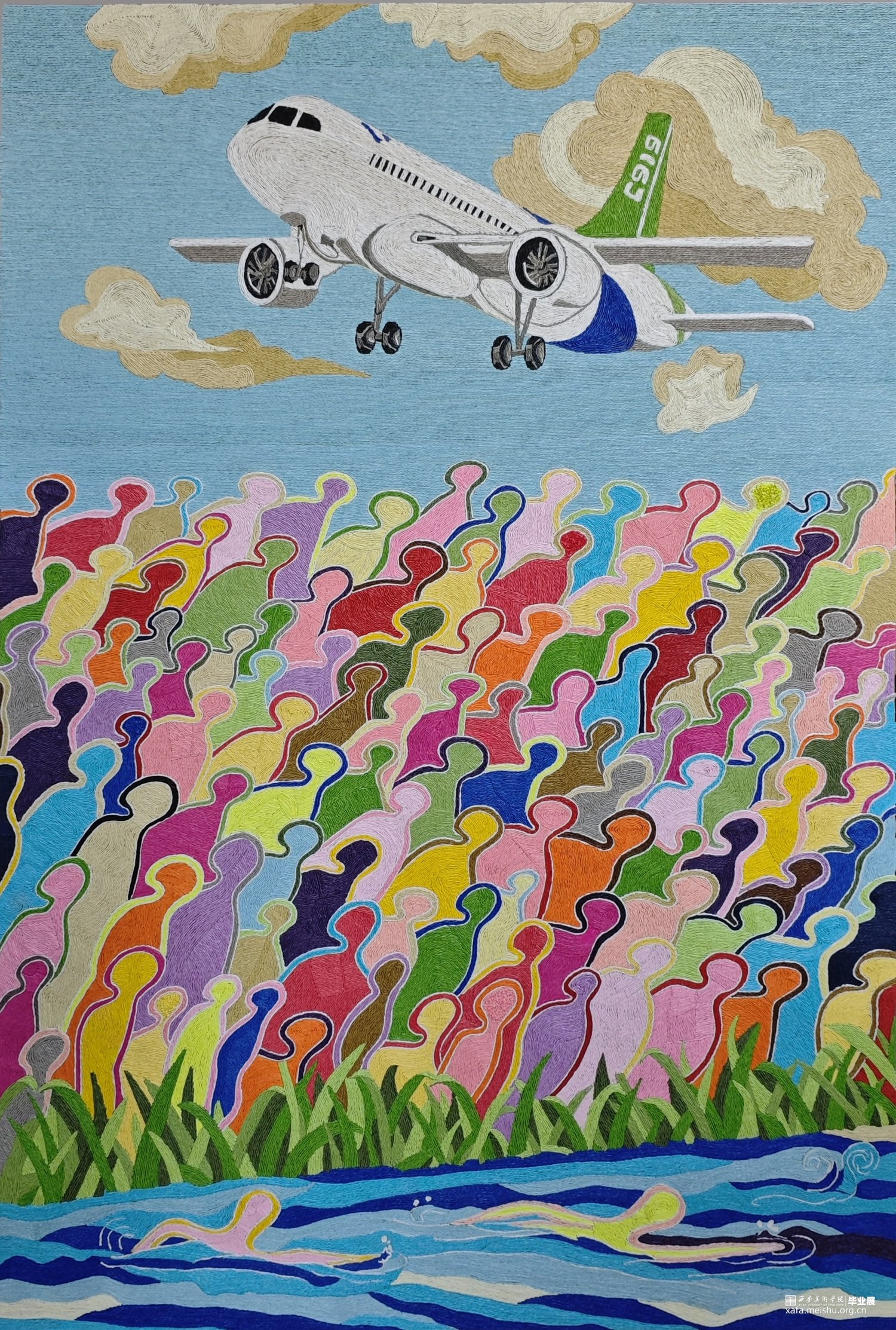 毕业作品《抬头之间》探究纸艺在现代生活中的创新与应用。作品以纸绳拼贴出飞机飞过时一群仰望的人,这个“抬头之间”,通过分析制作过程与设计理念,结合纸艺的历史、工艺和材料特性,探讨其在现代生活中的实际应用价值与发展潜力,展示纸艺的创新可能性。