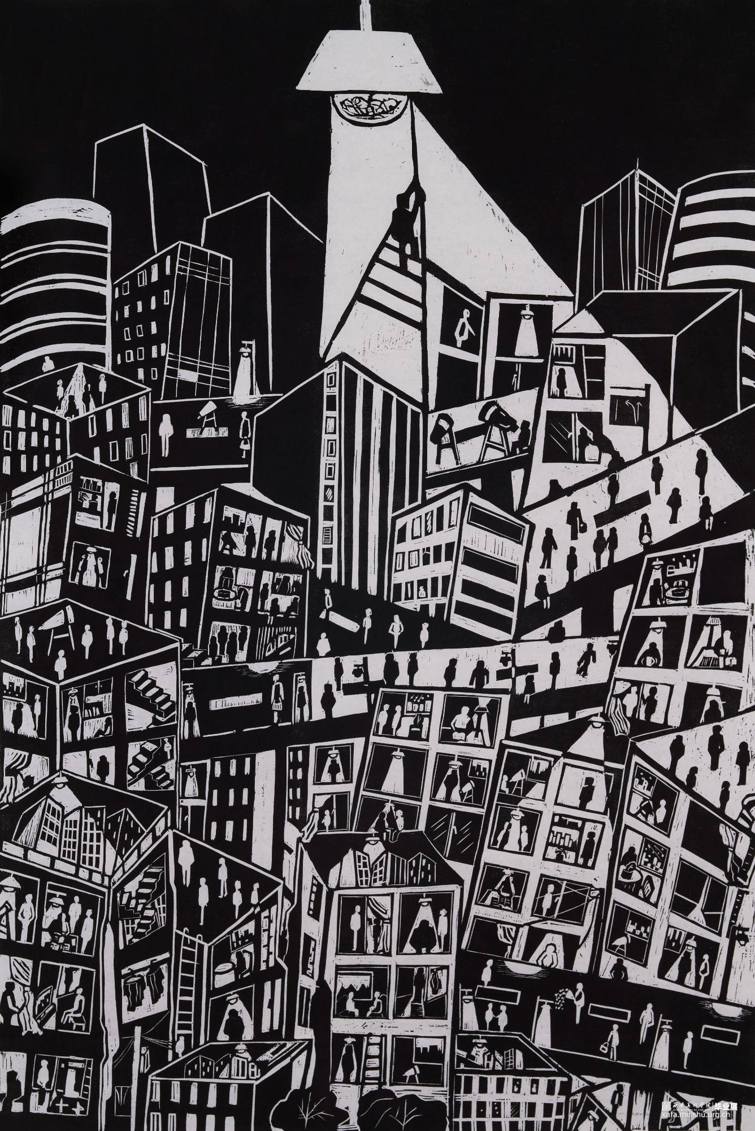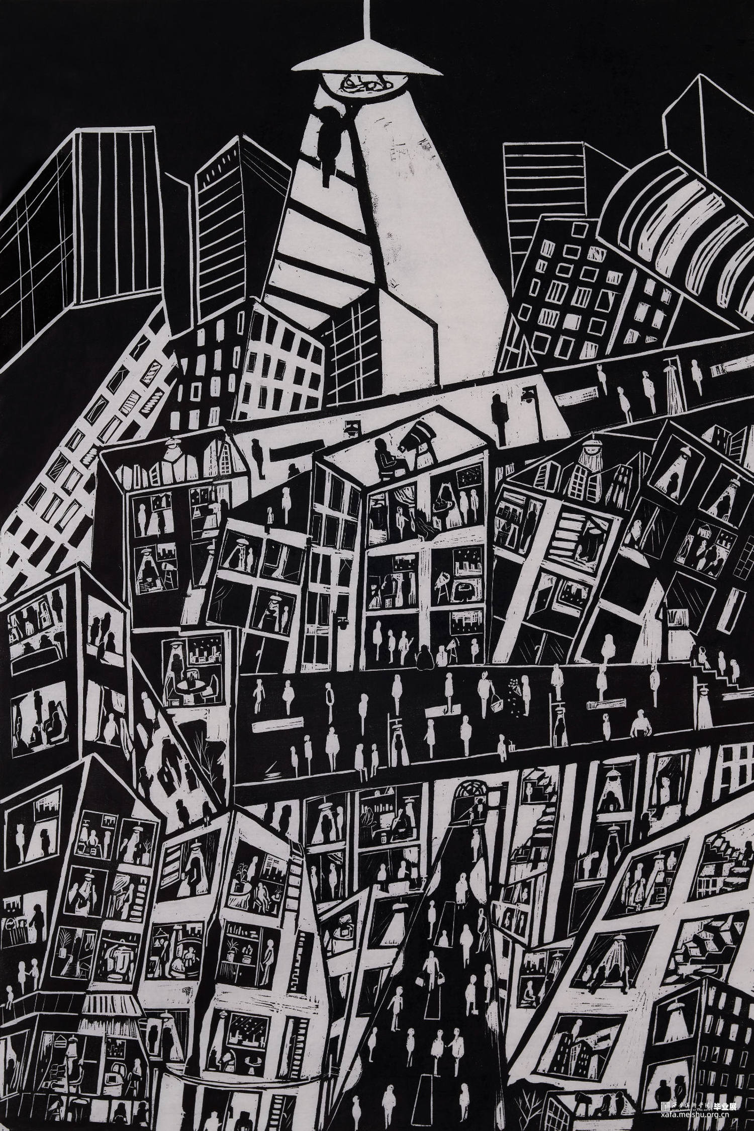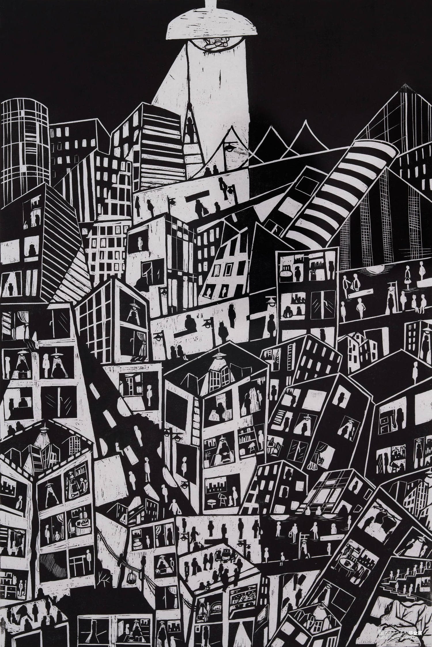 我的作品便是以生活的城市为背景,将人们的生活展示出来。在作品中,画面的最上部分为一盏灯,旨在用灯照射这个城市,将人们的生活展现出来,在作品中人和人之间有联系,而人和自己生活的城市也有联系。人是城市生活中不可缺少的一部分,他们有的生活在灯的照射下,有的生活在黑暗中,活动范围多聚集在楼房的窗边以及城市中的马路上,甚至是楼顶上,他们无处不在;他们之间有交流,也有独立,但是却始终离不开城市这一大的背景。可以在其中可以看到自己的生活,同时也可以欣赏他人生活当中所发生的故事。