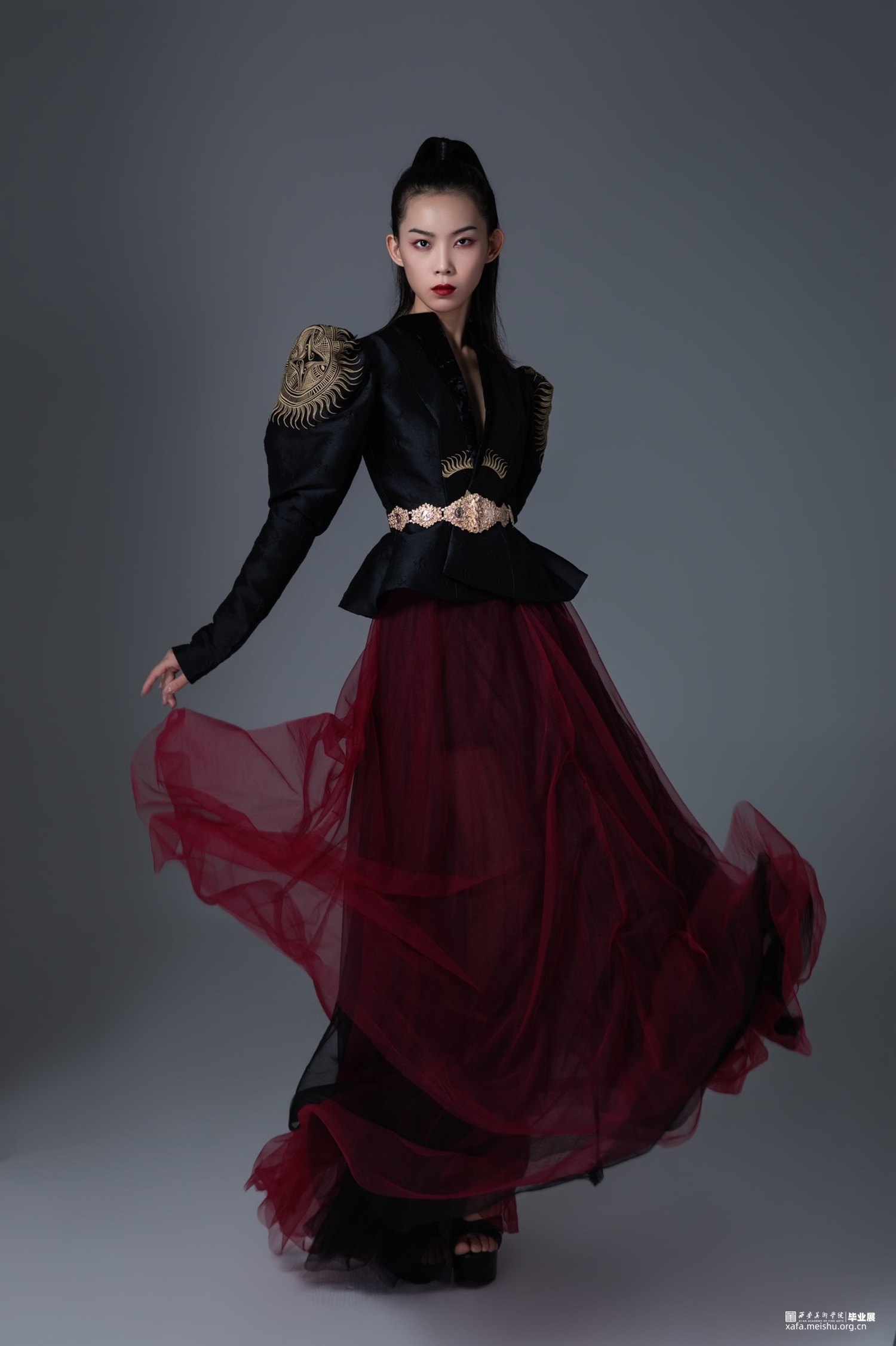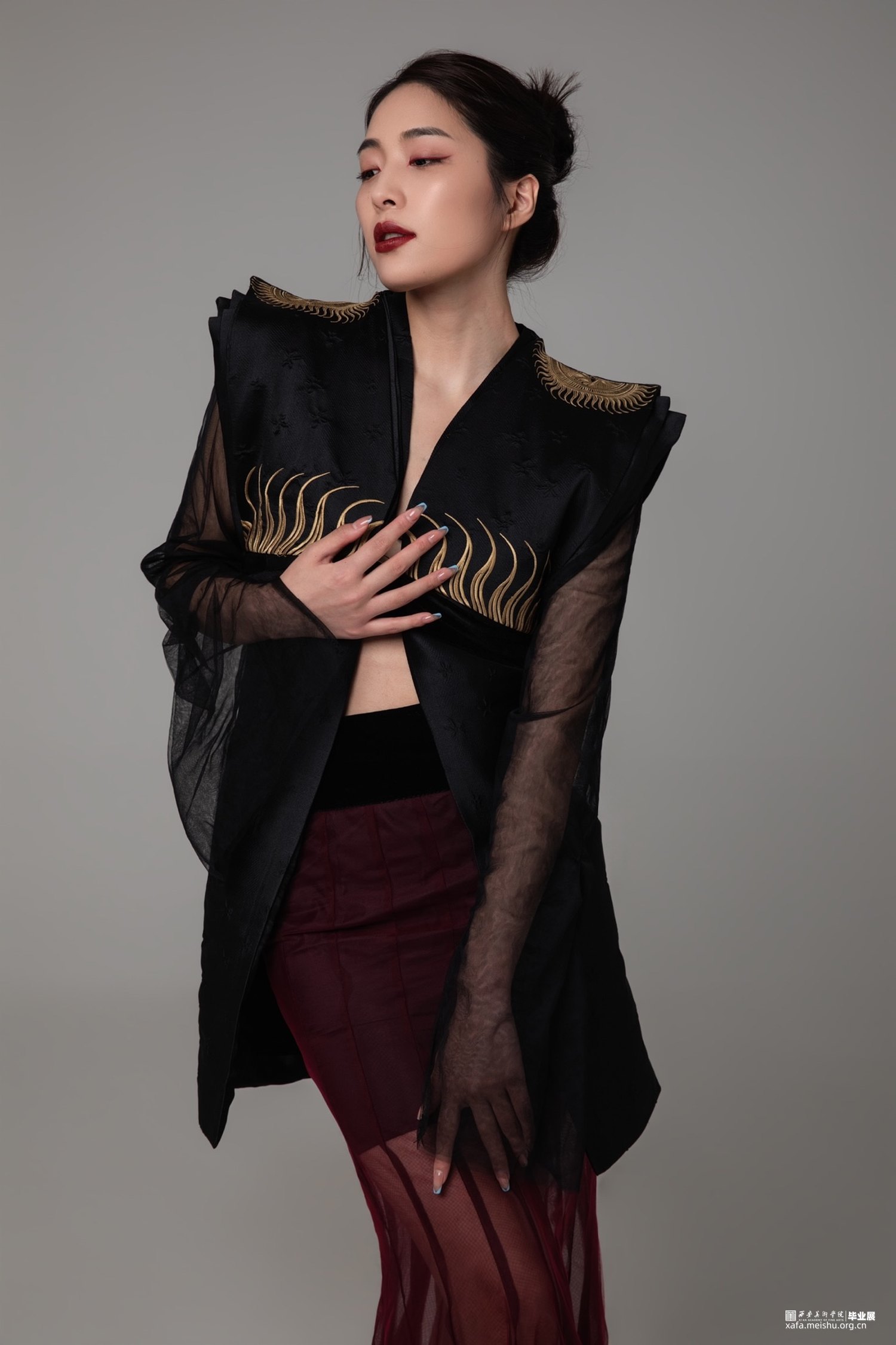 我的毕业设计选择了《山海经 大荒南经》的太阳神羲和作为创作灵感,对于太阳神形象和汉代服饰形制进行研究,将传统刺绣融入礼服设计中,论述了传统刺绣在现代礼服设计中的应用,通过实践探索将刺绣的文化内涵和纱的层次柔软与硬挺廓形西装与礼服设计相结合,利用礼服主流时尚的造型和搭配衬托传统刺绣的艺术魅力,使传统文化与现代设计交相呼应,重塑羲和形象用古典的美与现代的美相结合,宣扬中国传统文化的美。